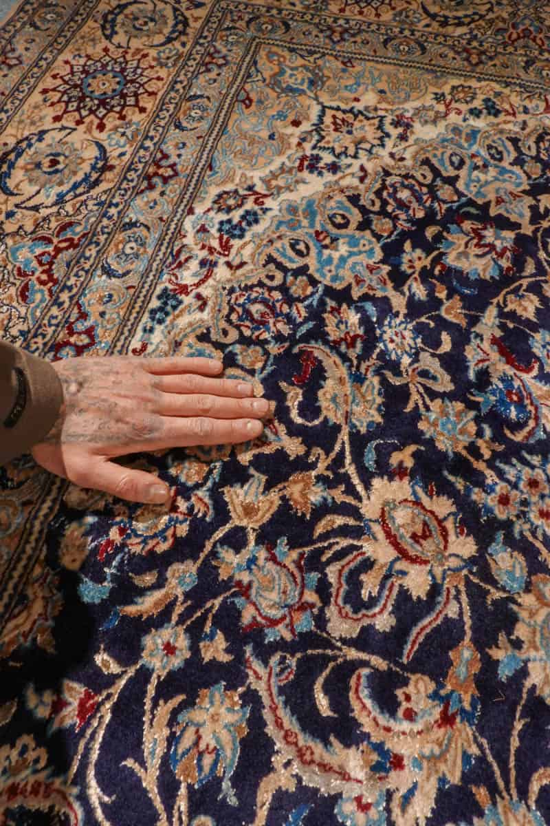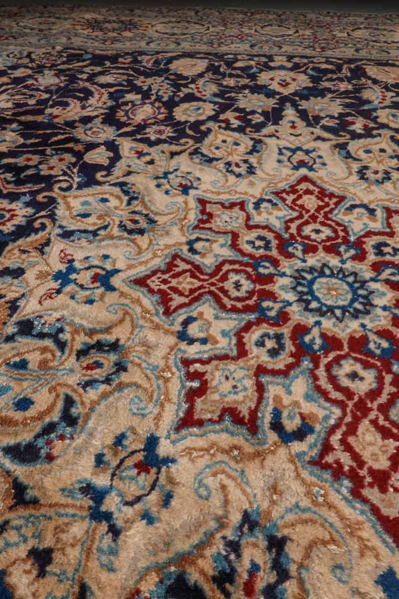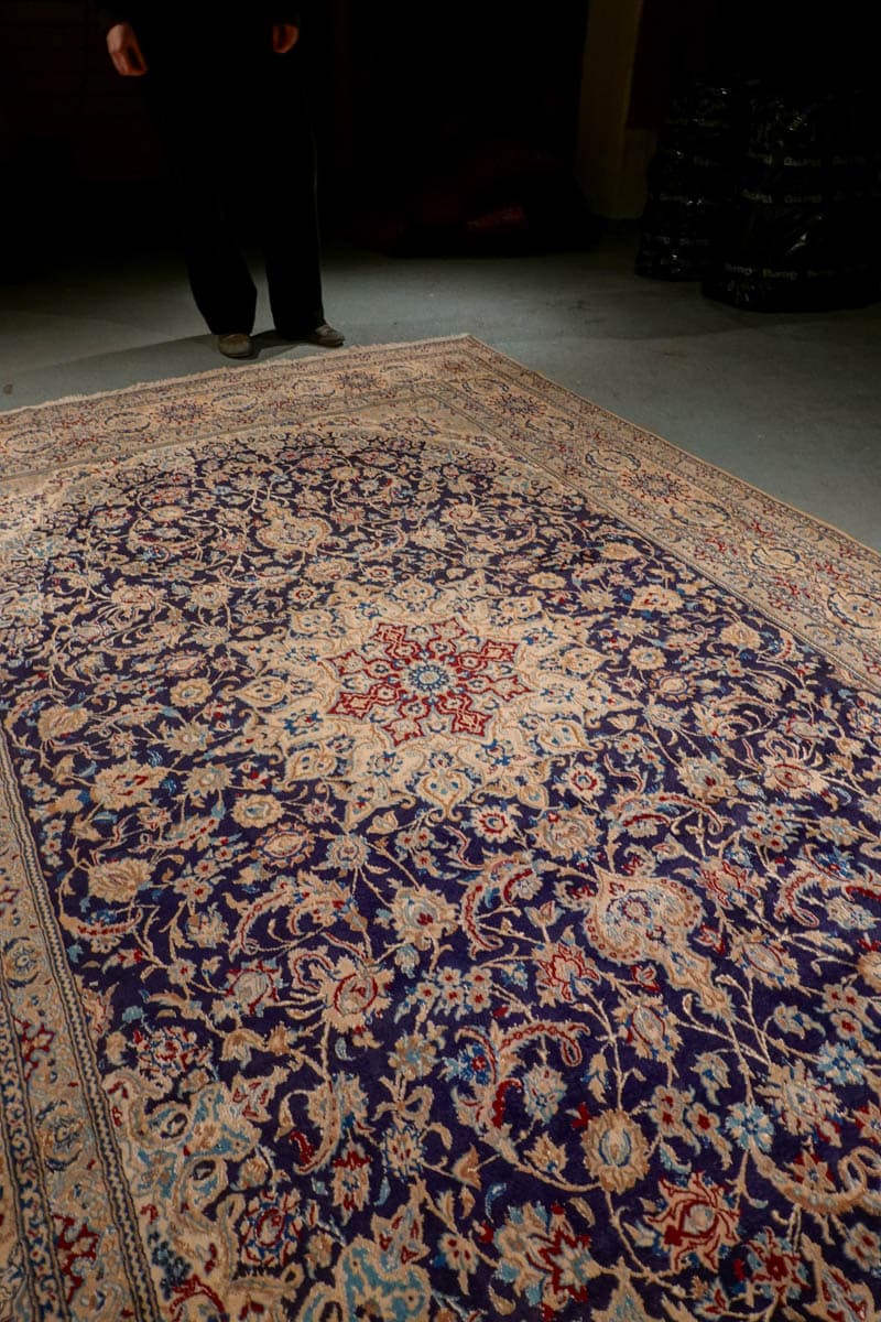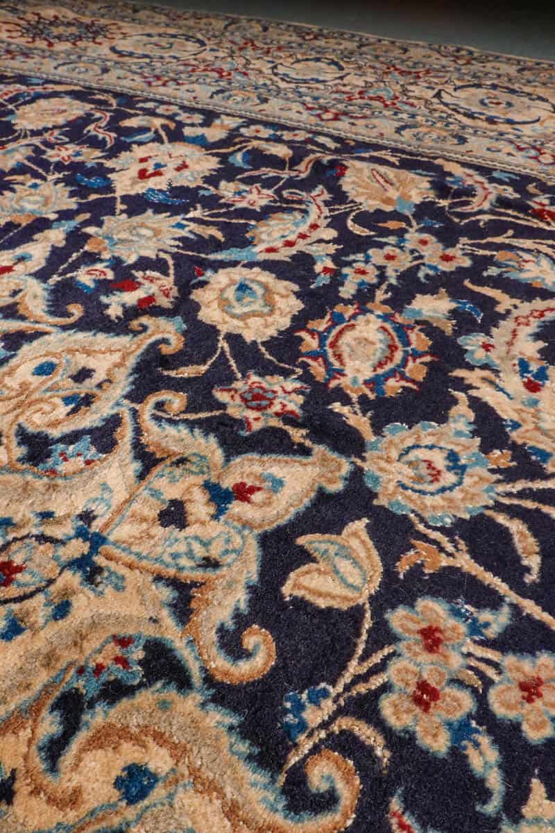 Tämän uskomattoman tarkasti käsinsolmitun iranilaisen Nain-villamaton ulkoasu on poikkeuksellinen. Yönsininen pohja toimii rauhallisena taustana, jolta nousevat esiin rubiininpunaisen, lämpimän okran ja arvokkaan ultramariinin sävyjä hillitysti sommiteltuina ja vaaleina väikkyvien silkkiyksityiskohtien korostamina. Maton keskiosaa koristaa lumoava keskimedaljonki, jonka ympärille rakentuu kerroksellista, orgaanisesti kasvavaa kasvi- ja kukkaornamentiikkaa. Lehtikuviot ja kukinnot liikkuvat rytmisesti, ja ne on solmittu äärimmäisellä tarkkuudella.