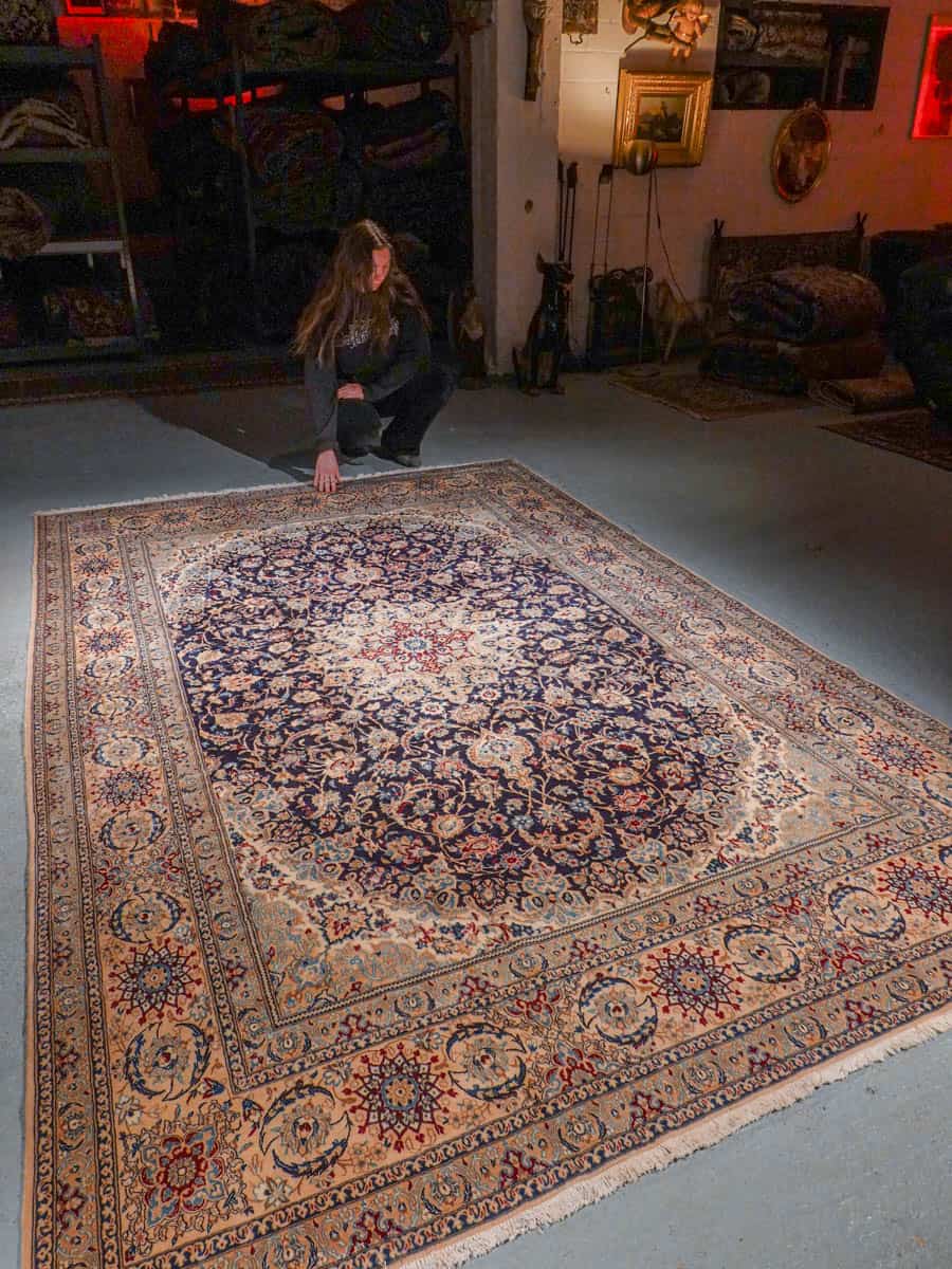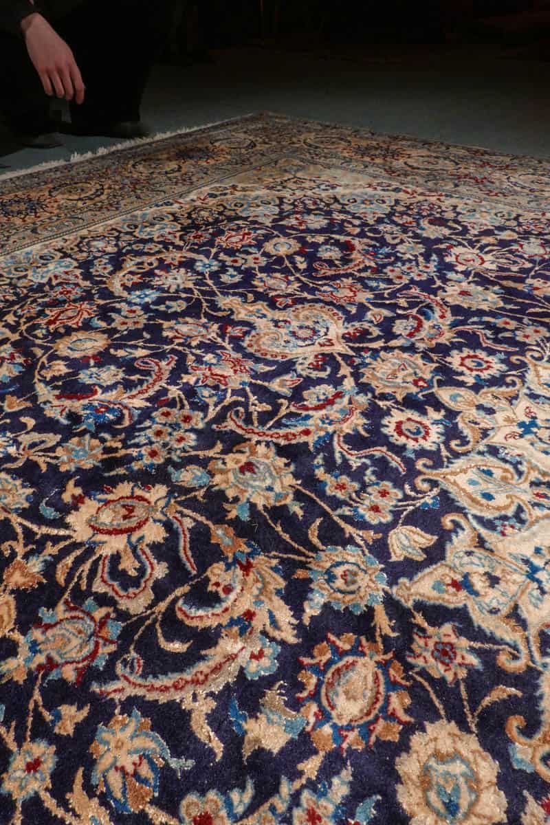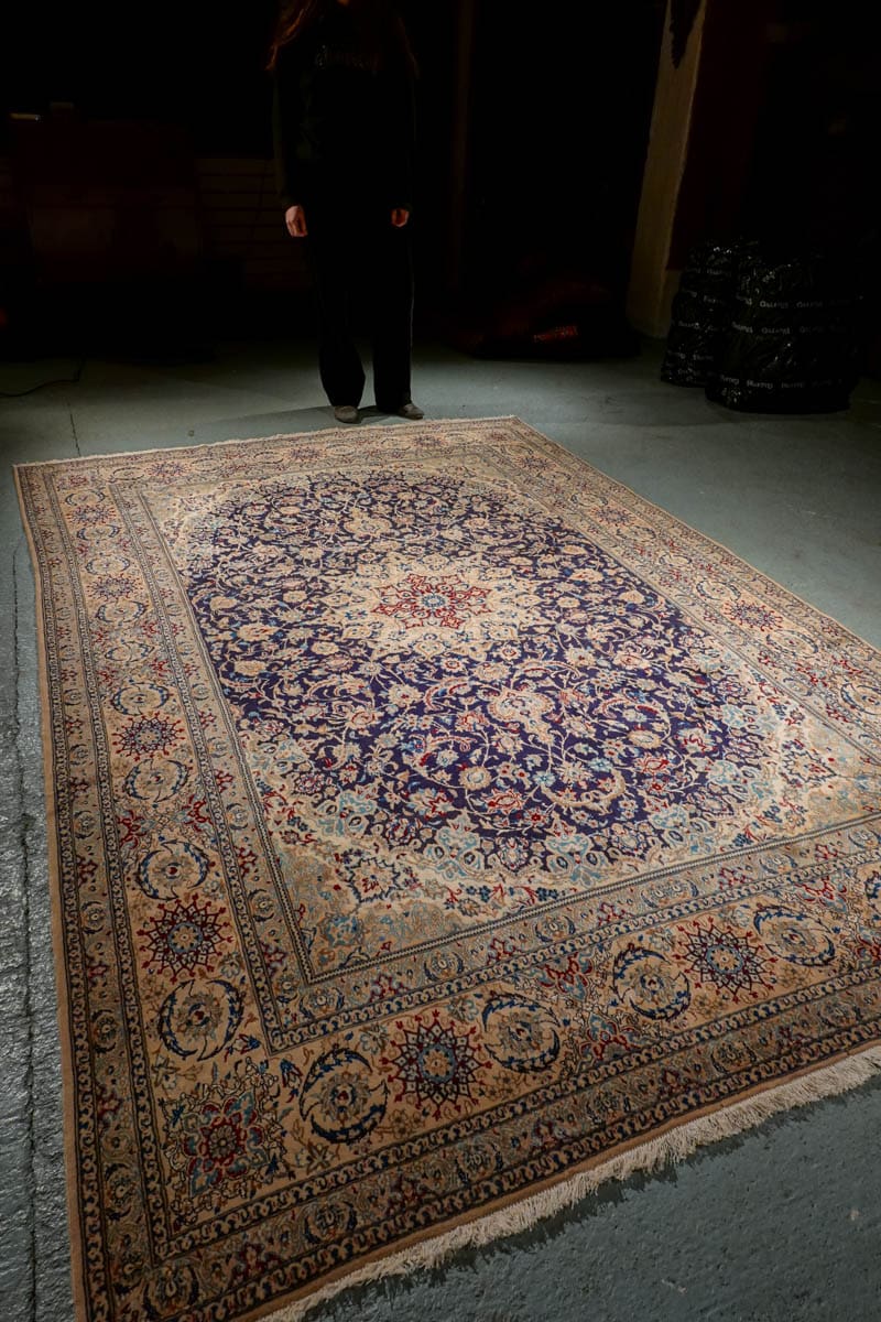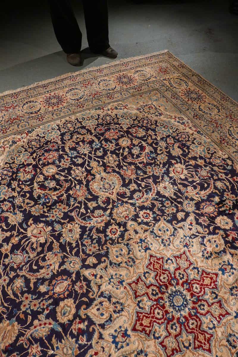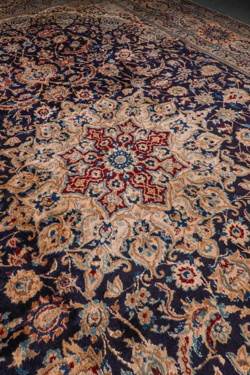Tämän uskomattoman tarkasti käsinsolmitun iranilaisen Nain-villamaton ulkoasu on poikkeuksellinen. Yönsininen pohja toimii rauhallisena taustana, jolta nousevat esiin rubiininpunaisen, lämpimän okran ja arvokkaan ultramariinin sävyjä hillitysti sommiteltuina ja vaaleina väikkyvien silkkiyksityiskohtien korostamina. Maton keskiosaa koristaa lumoava keskimedaljonki, jonka ympärille rakentuu kerroksellista, orgaanisesti kasvavaa kasvi- ja kukkaornamentiikkaa. Lehtikuviot ja kukinnot liikkuvat rytmisesti, ja ne on solmittu äärimmäisellä tarkkuudella.