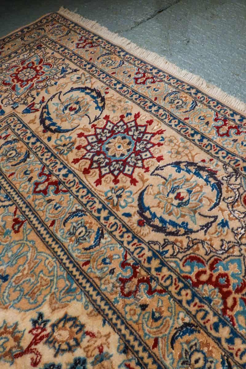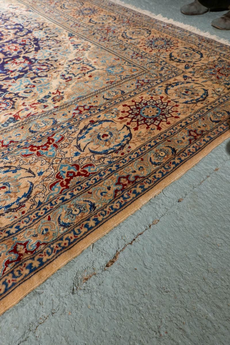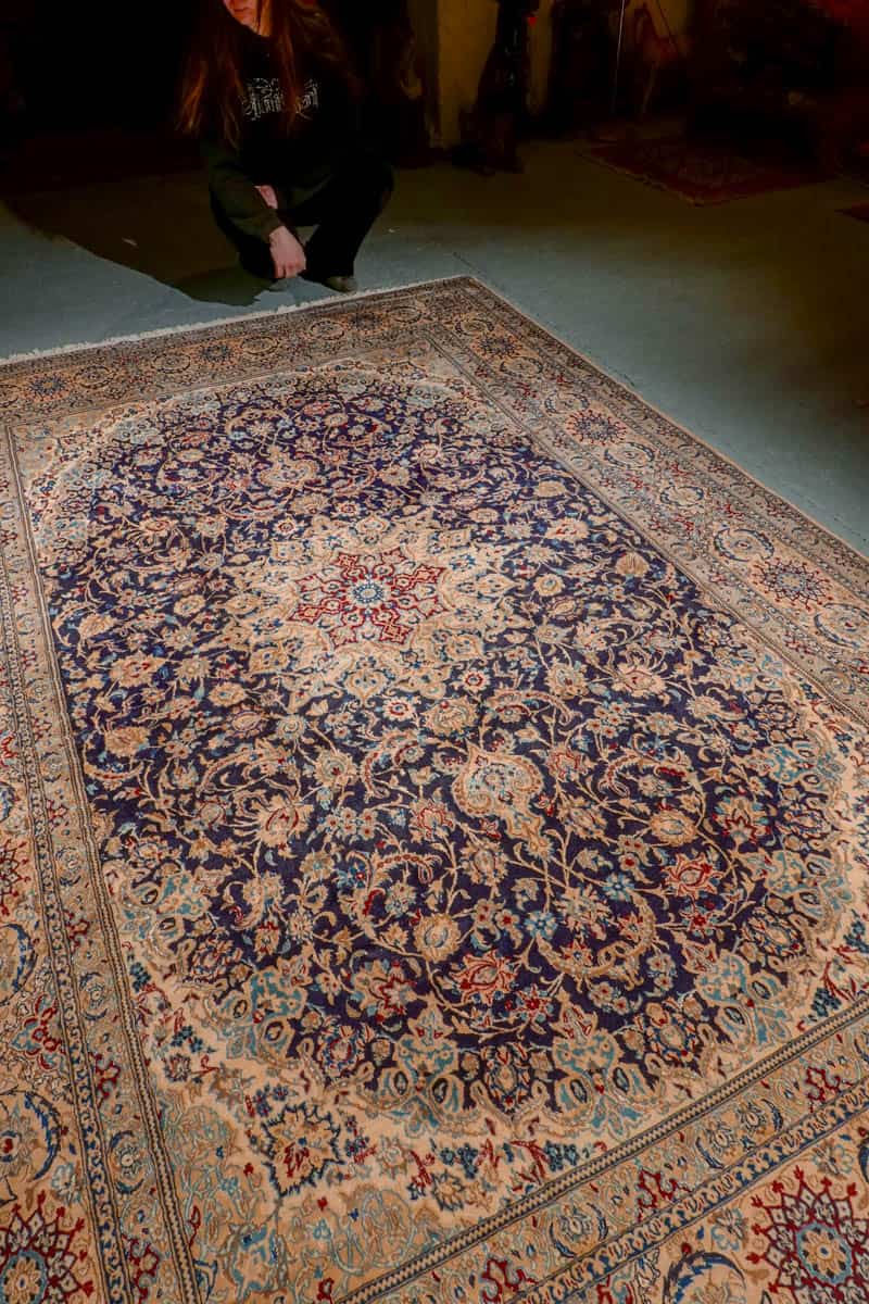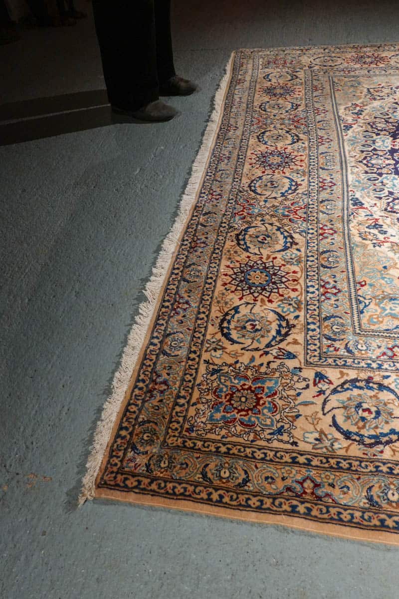 Tämän uskomattoman tarkasti käsinsolmitun iranilaisen Nain-villamaton ulkoasu on poikkeuksellinen. Yönsininen pohja toimii rauhallisena taustana, jolta nousevat esiin rubiininpunaisen, lämpimän okran ja arvokkaan ultramariinin sävyjä hillitysti sommiteltuina ja vaaleina väikkyvien silkkiyksityiskohtien korostamina. Maton keskiosaa koristaa lumoava keskimedaljonki, jonka ympärille rakentuu kerroksellista, orgaanisesti kasvavaa kasvi- ja kukkaornamentiikkaa. Lehtikuviot ja kukinnot liikkuvat rytmisesti, ja ne on solmittu äärimmäisellä tarkkuudella.