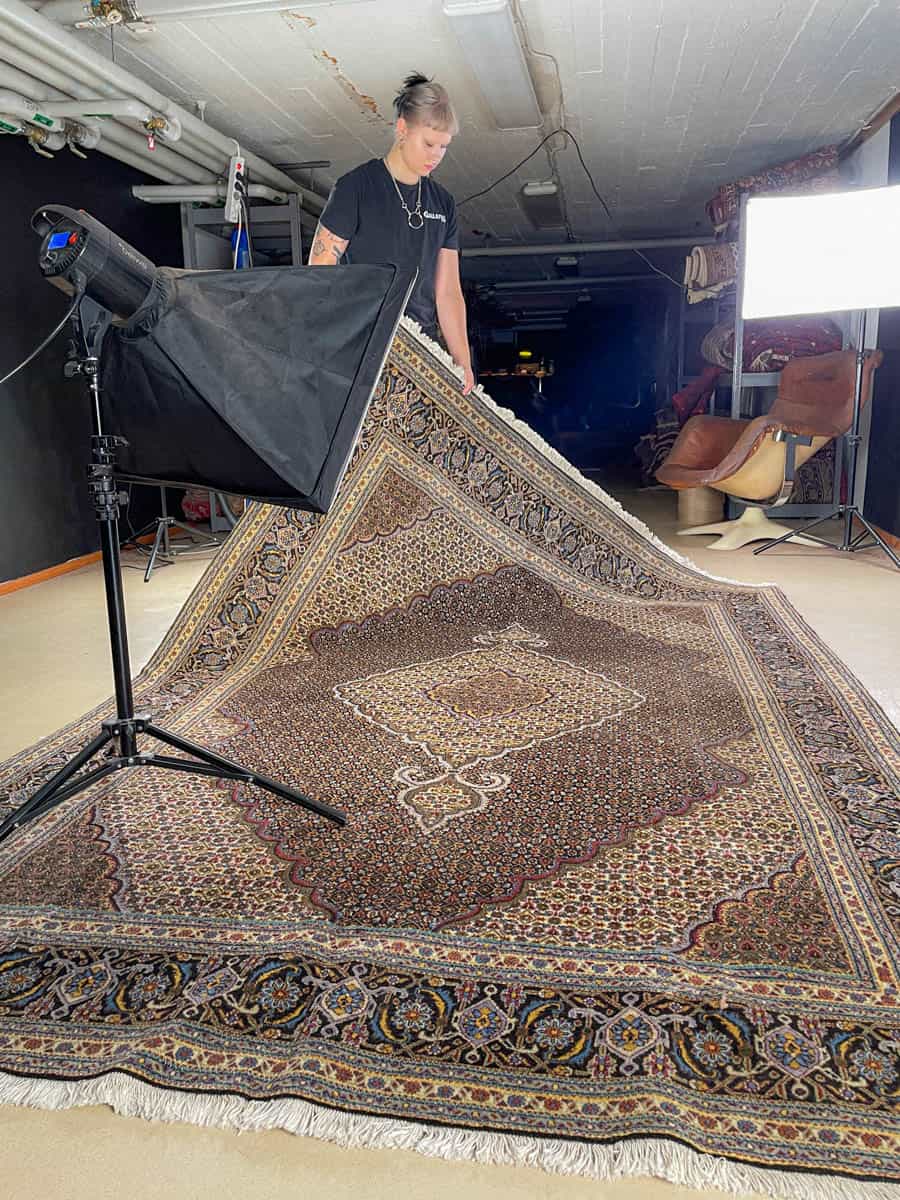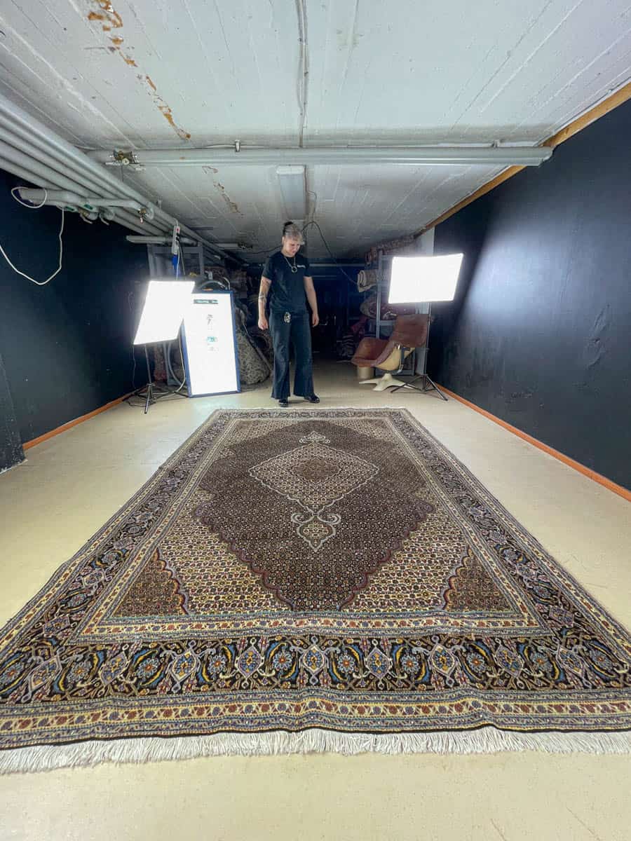 Tämä matto sijaitsee Töölön varastollamme – jos haluat tulla katsomaan sitä paikan päälle, sovithan näytön viestitse tai puhelimitse.