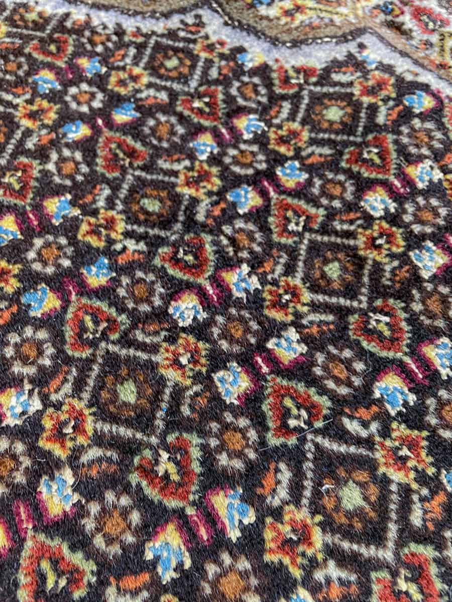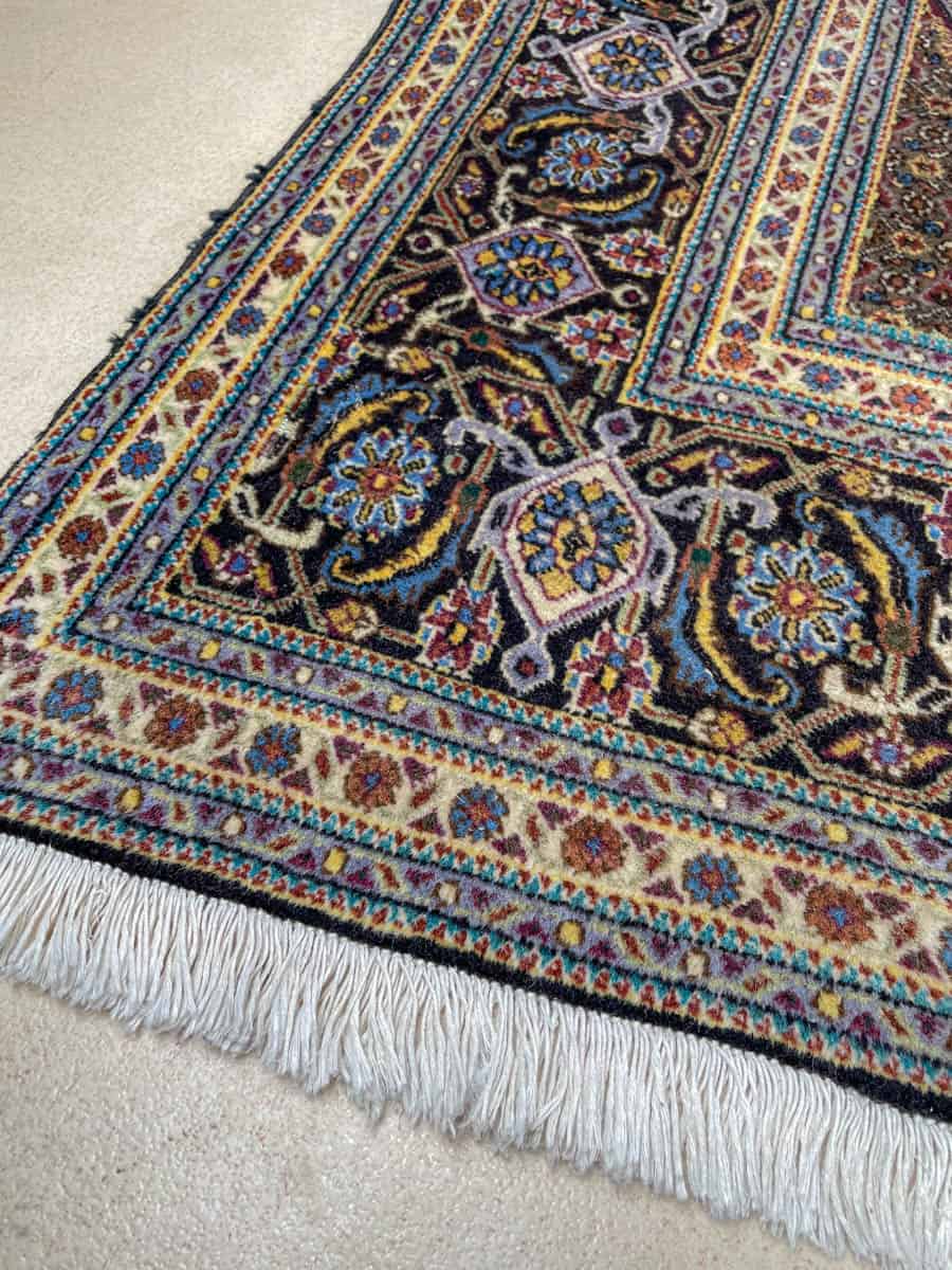 Matto on käsinsolmittu villasta, ja sen hapsut ovat pysyneet pitkänä ja verrattain hyväkuntoisena.