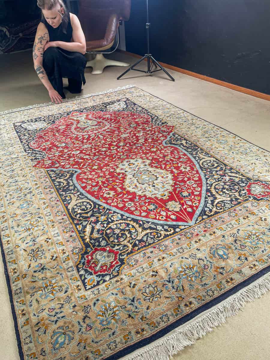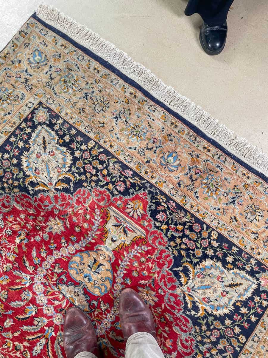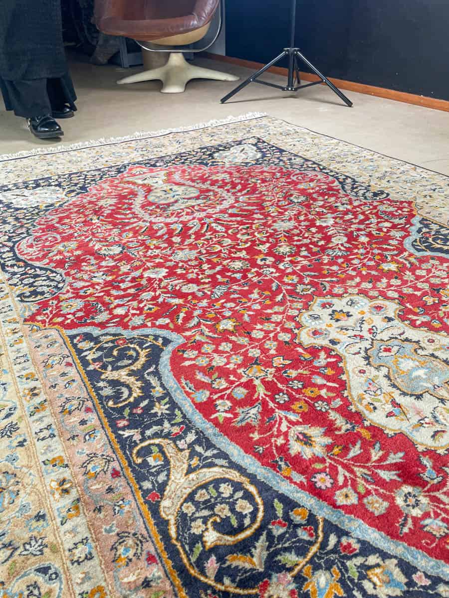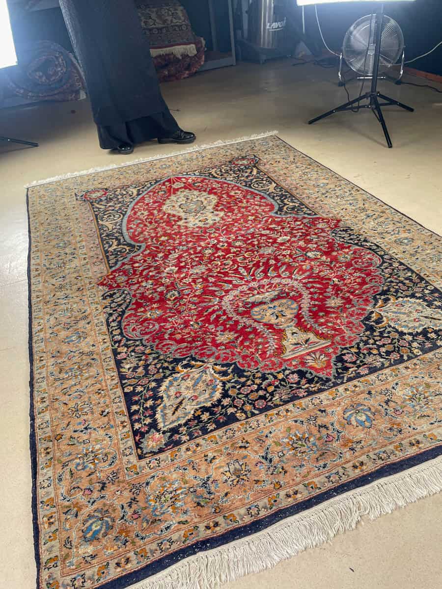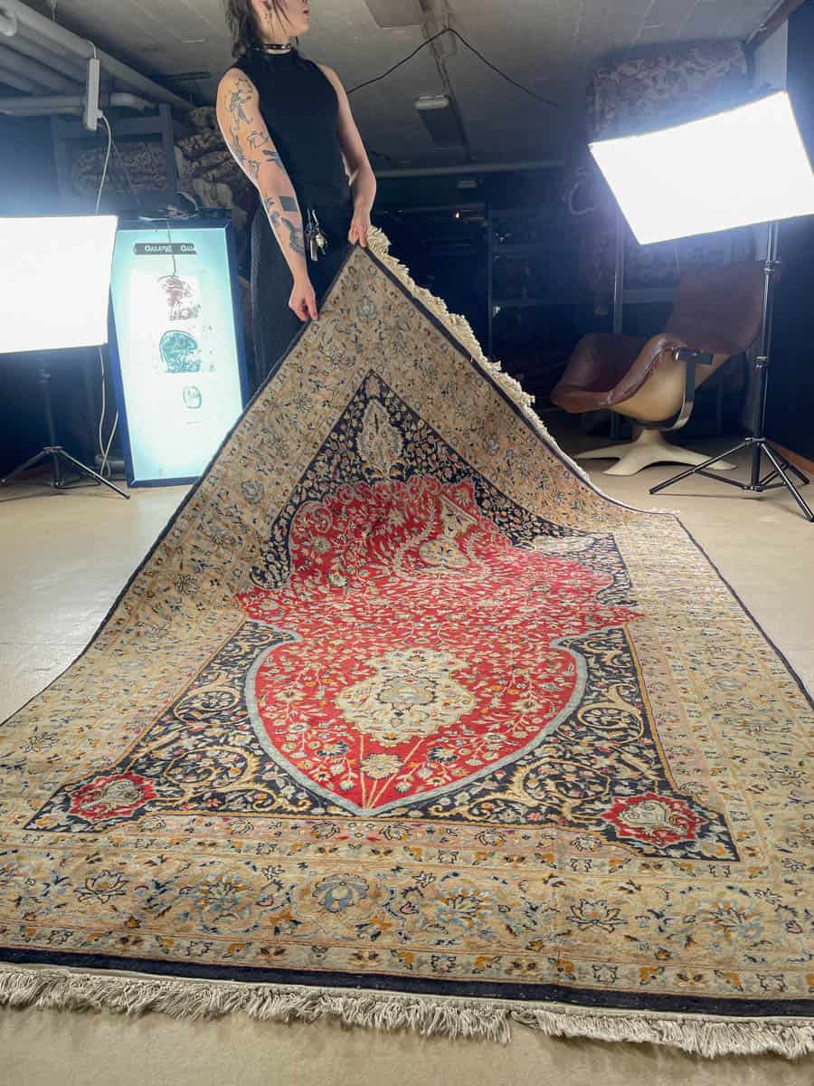 Tämä matto sijaitsee Töölön varastollamme – jos haluat tulla katsomaan sitä paikan päälle, sovithan näytön viestitse tai puhelimitse.