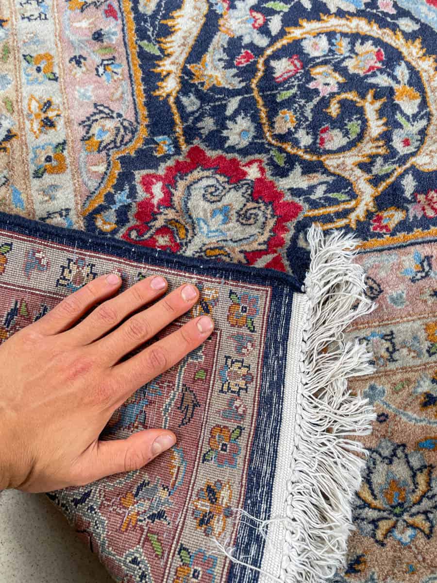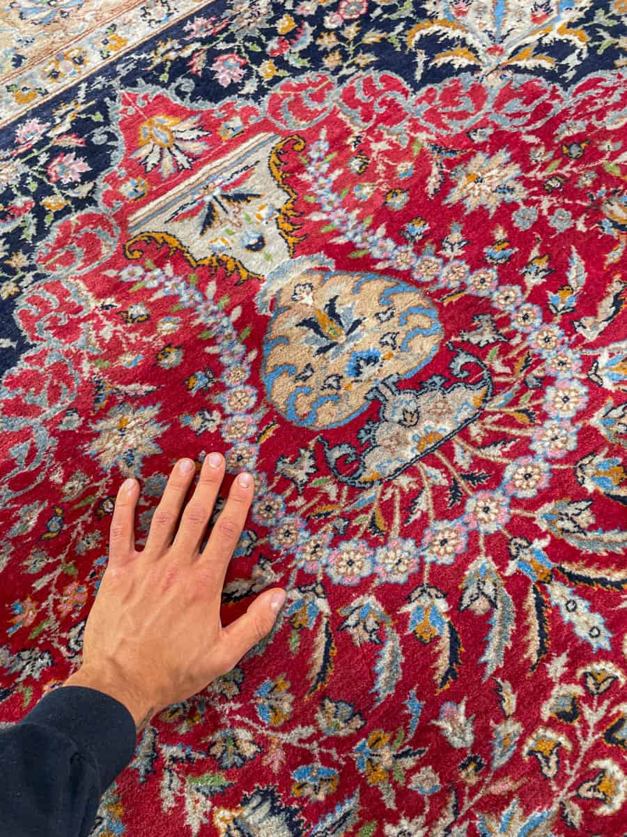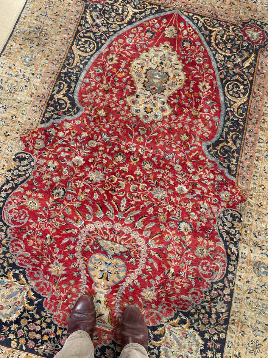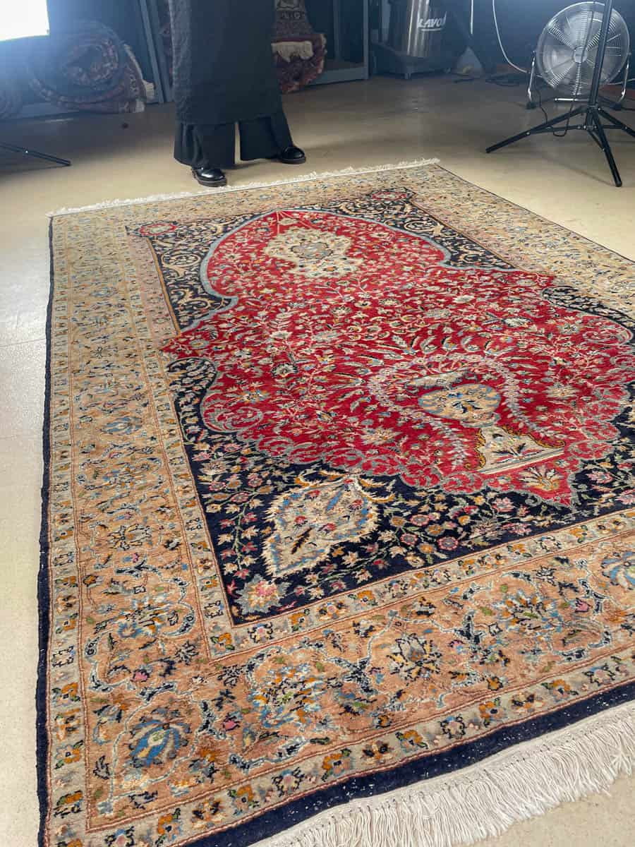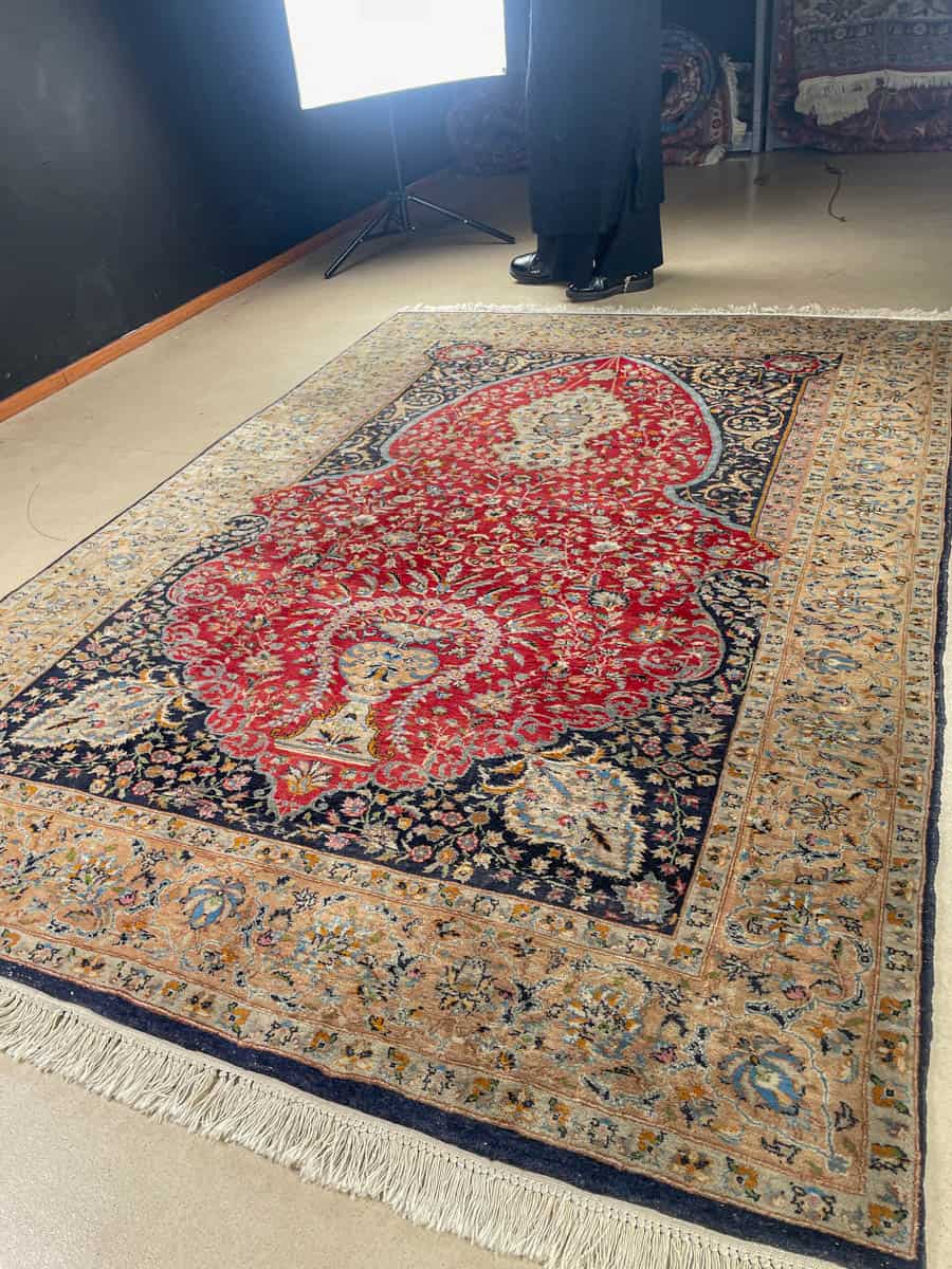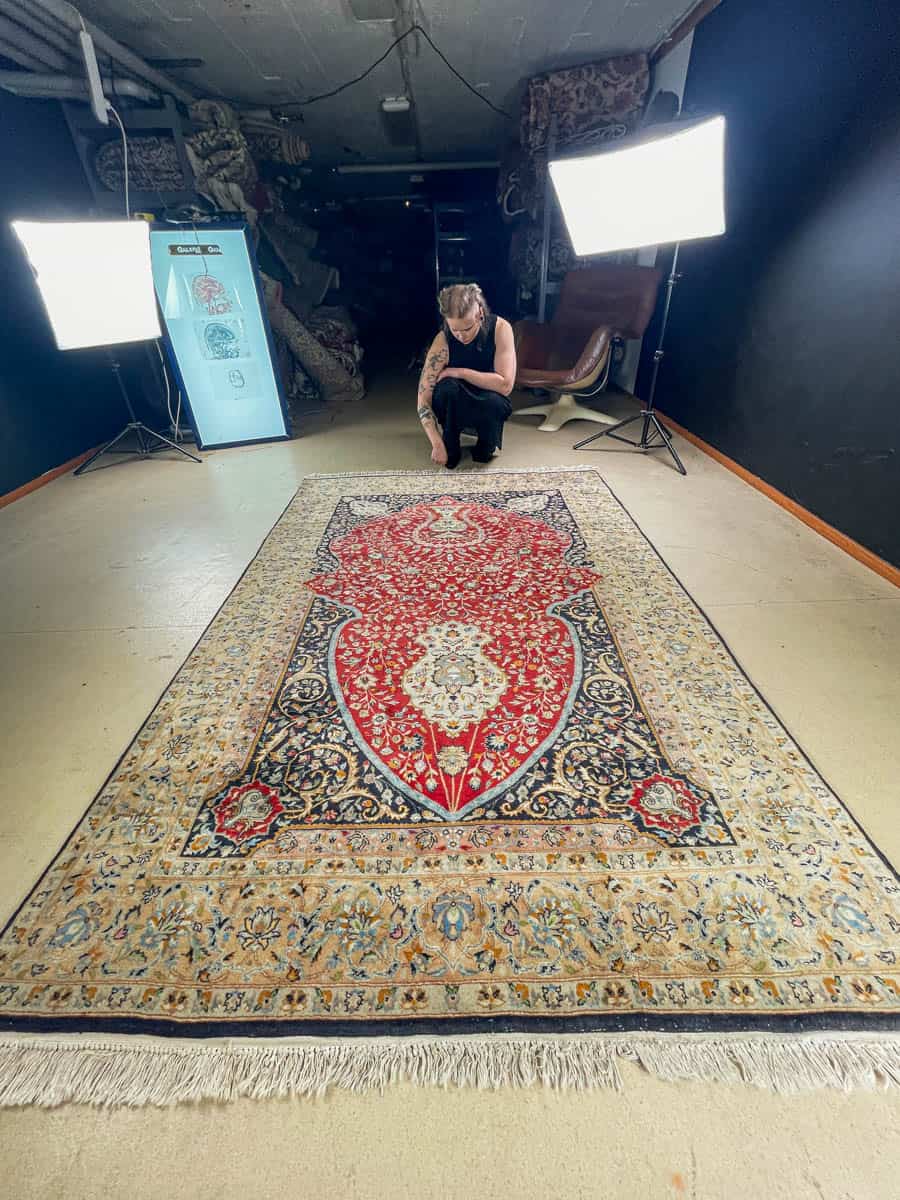 Tämä matto sijaitsee Töölön varastollamme – jos haluat tulla katsomaan sitä paikan päälle, sovithan näytön viestitse tai puhelimitse.