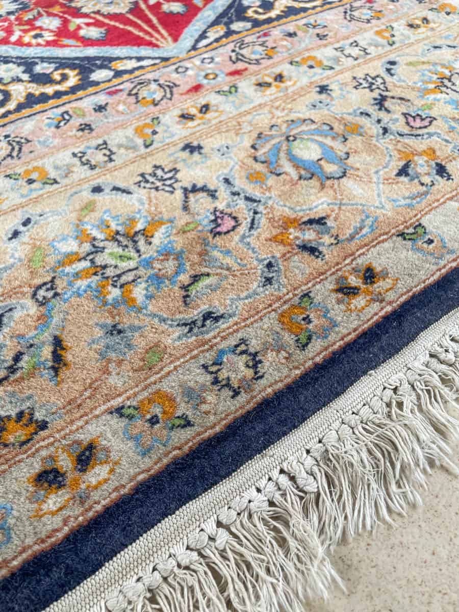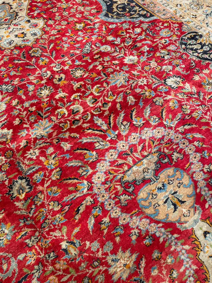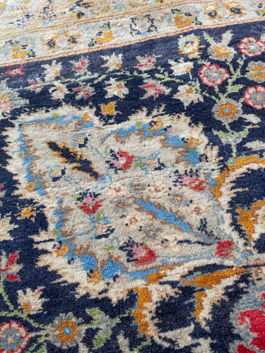 Katseen vangitsevan yksityiskohtainen ja erittäin upeasti säilynyt Tabriz. Vaikuttavan kirkas väripaletti muodostaa juhlavan kokonaisuuden. Keskikentässä mm. harvinaista hiilenmustaa. Ylellinen ja pehmoinen, jalkoja hellivä nukka ja hyväkuntoiset pitkät hapsut.
