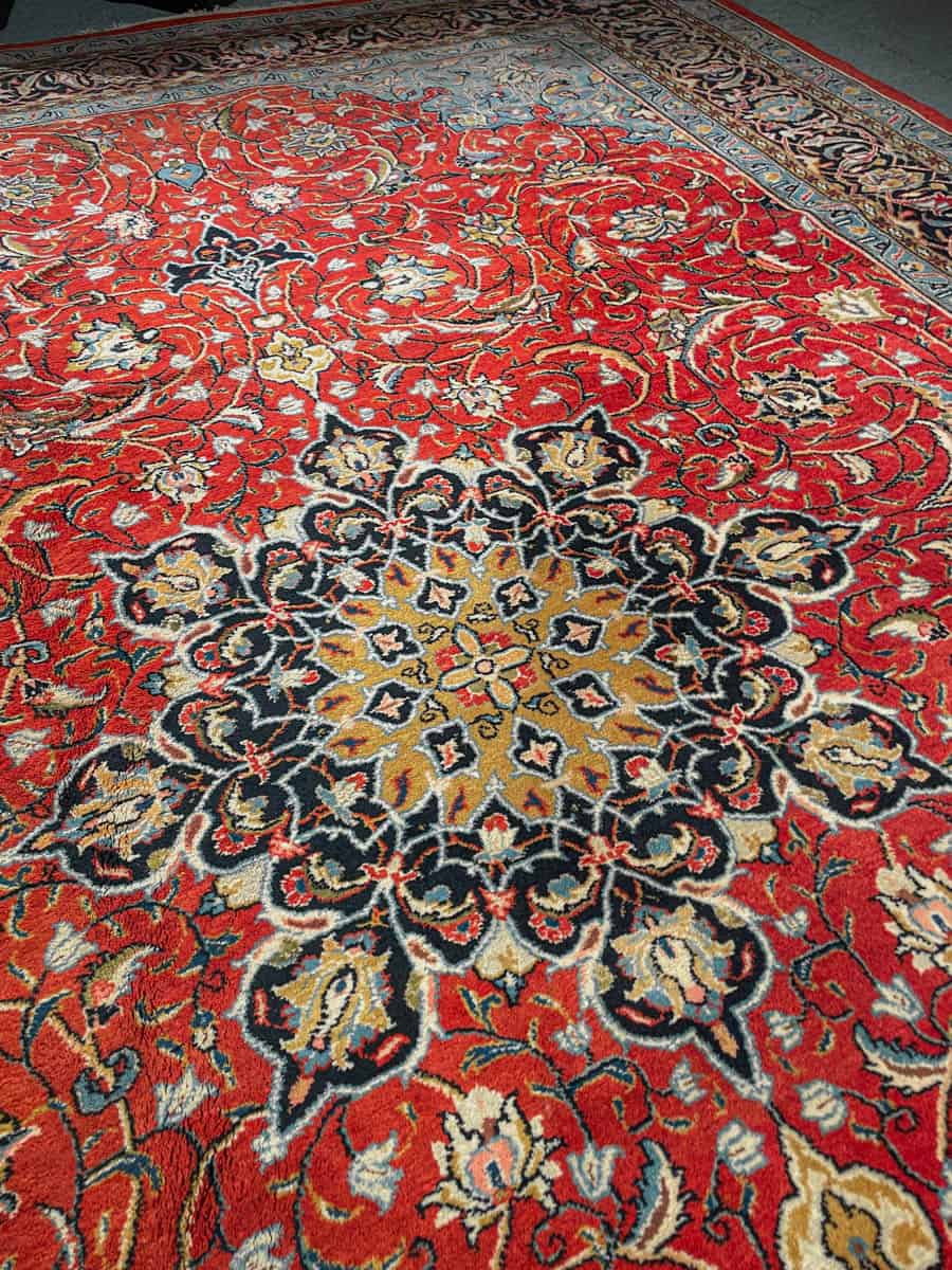 Upean harmoninen medaljonkikuviointi, josta huokuu klassinen estetiikka ja hienostunut käsityötaito. Punaista pohjasävyä koristavat tasapainoiset ornamenttikuviot, joissa esiintyy perinteisiä kasvi- ja arabeskiaiheita. Taivaansininen luo kaunista kontrastia.