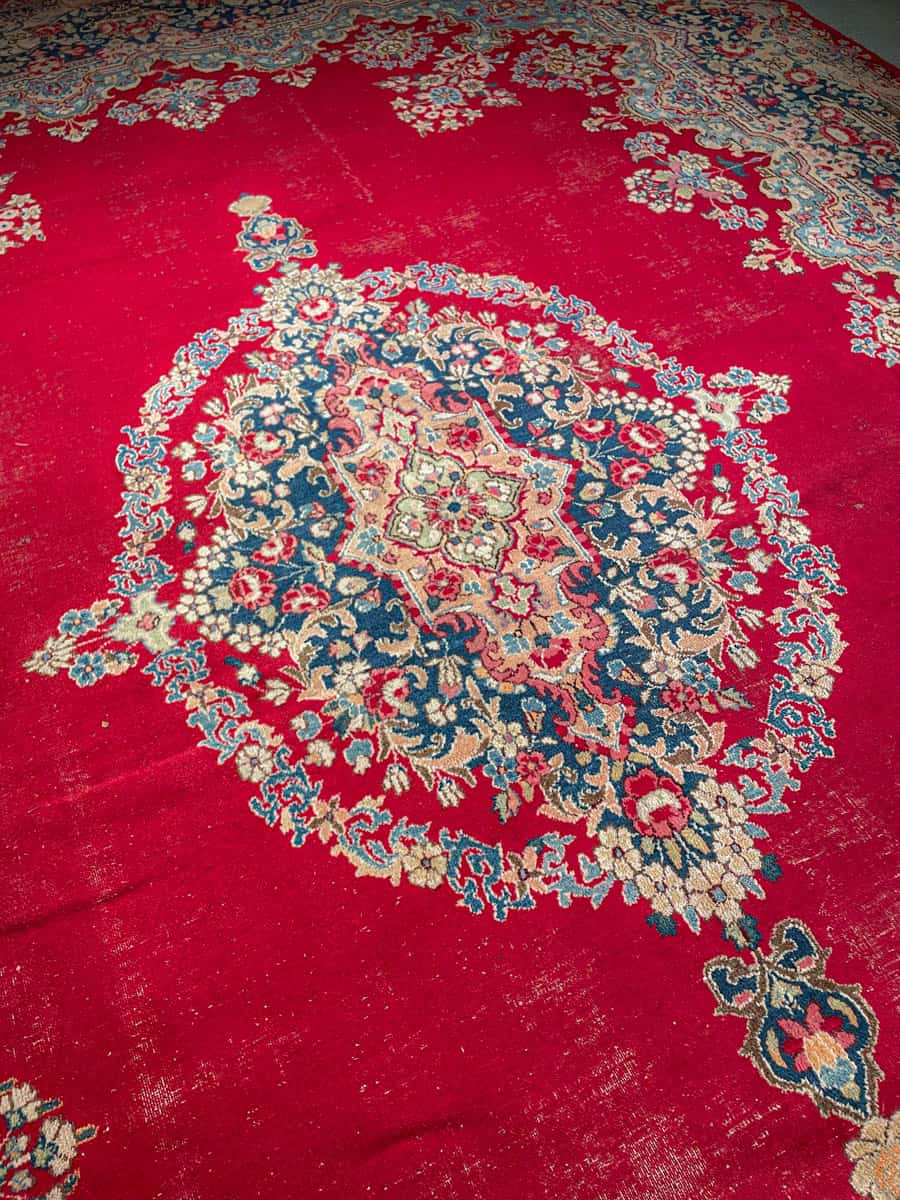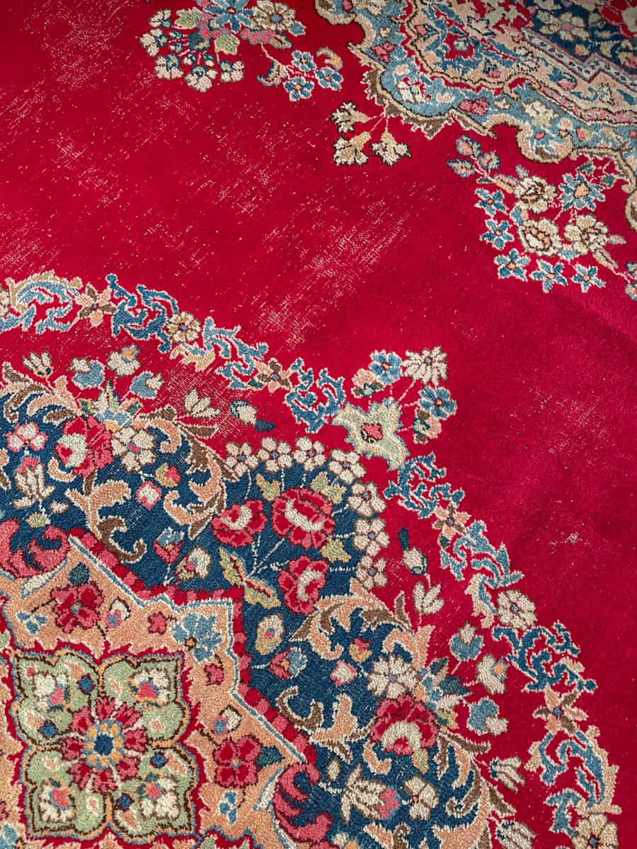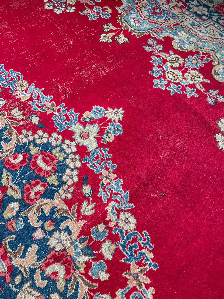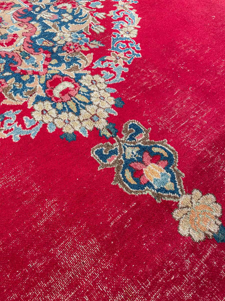 Tyrmäävä ja yksityiskohtainen perinteinen iranilainen Kirman-villamatto kukkaisteemalla ja kauniisti säilyneellä punaisella väriteemalla. Upea keskimedaljonki.