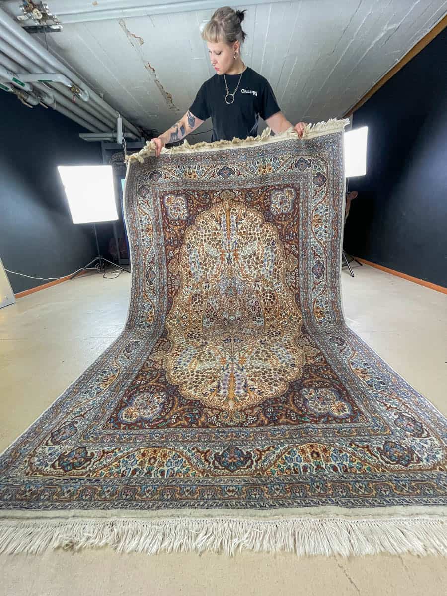 Tämä matto sijaitsee Töölön varastollamme – jos haluat tulla katsomaan sitä paikan päälle, sovithan näytön viestitse tai puhelimitse.