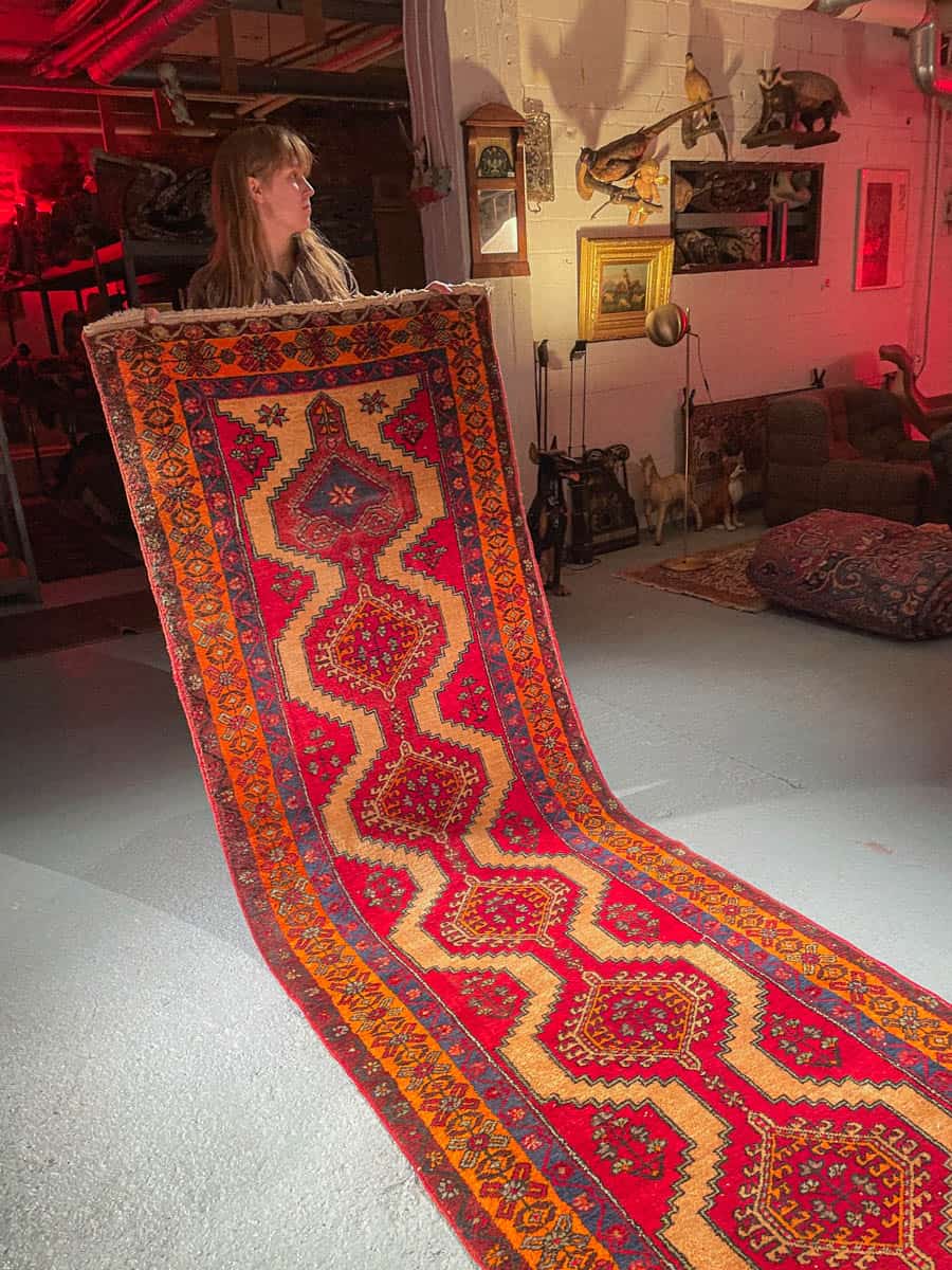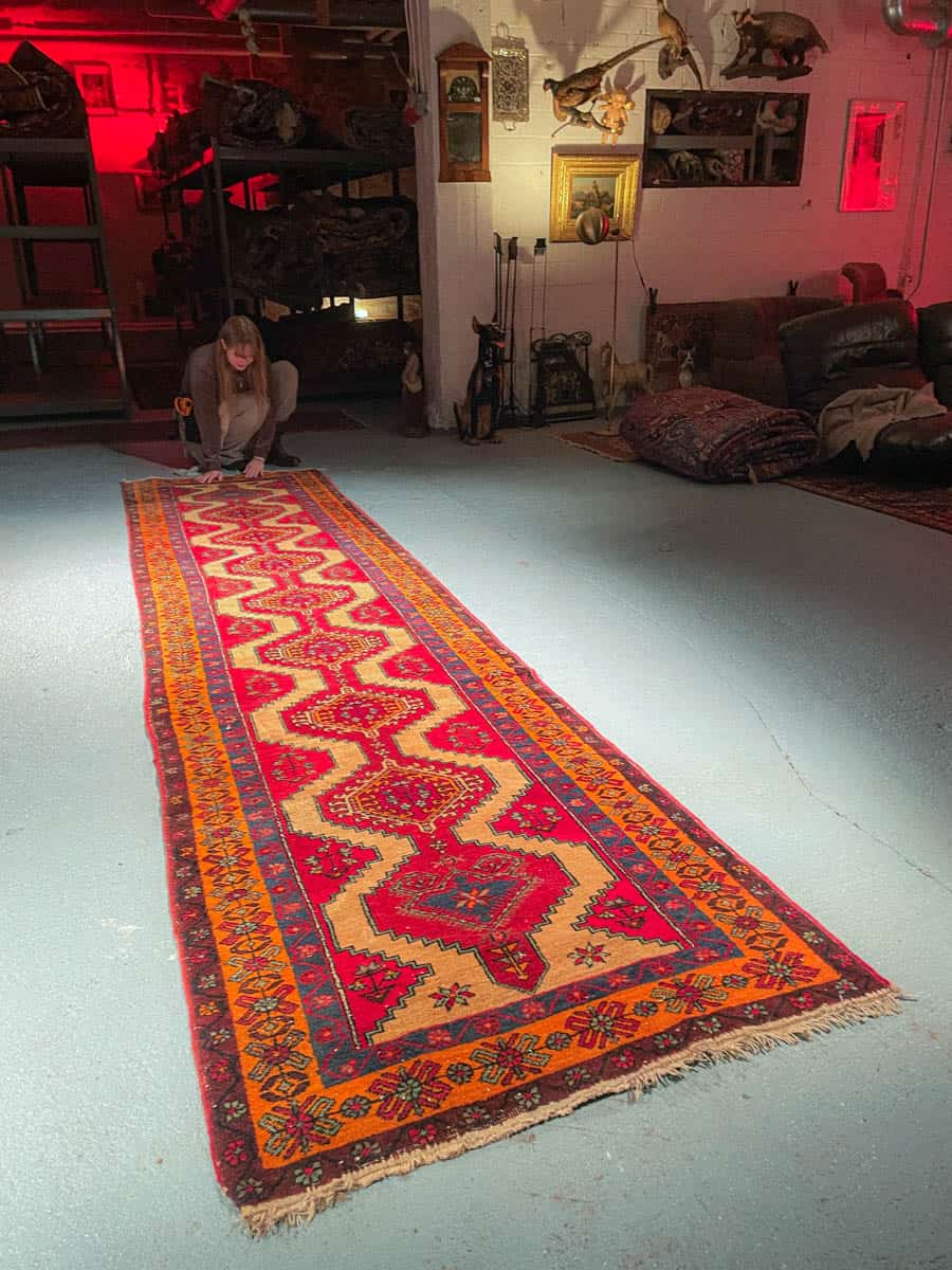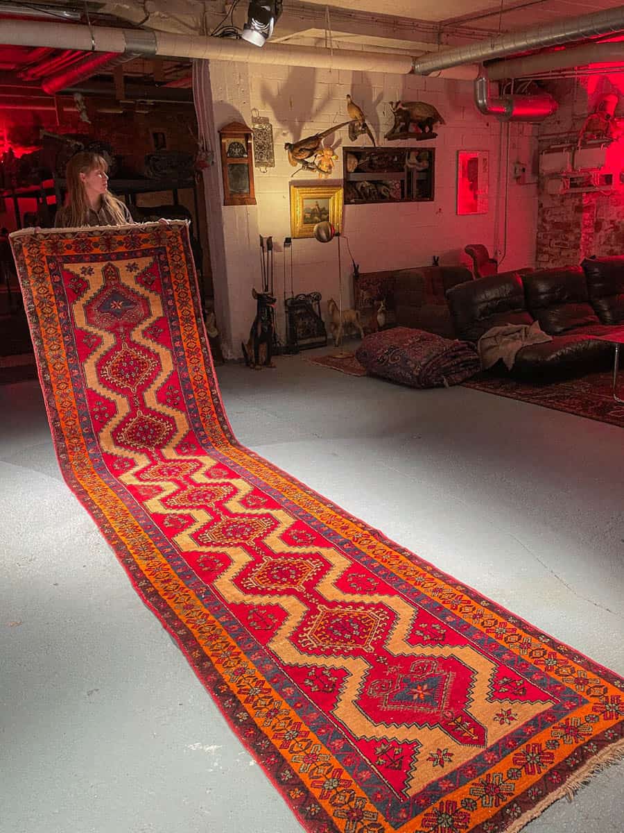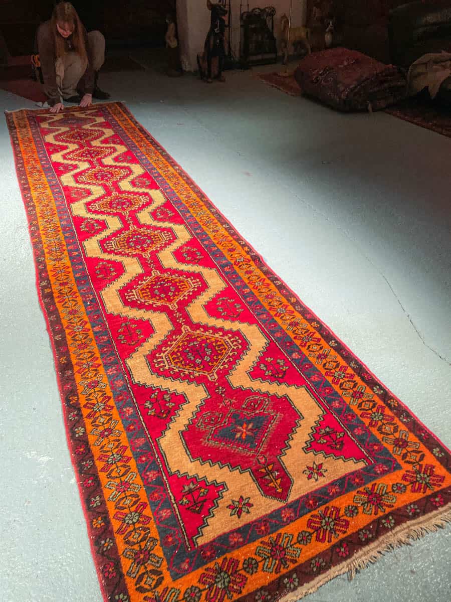 Tämä matto sijaitsee Galleriallamme osoitteessa Kankurinkatu 7, Punavuori – jos haluat tulla katsomaan sitä paikan päälle, sovithan näytön viestitse tai puhelimitse.