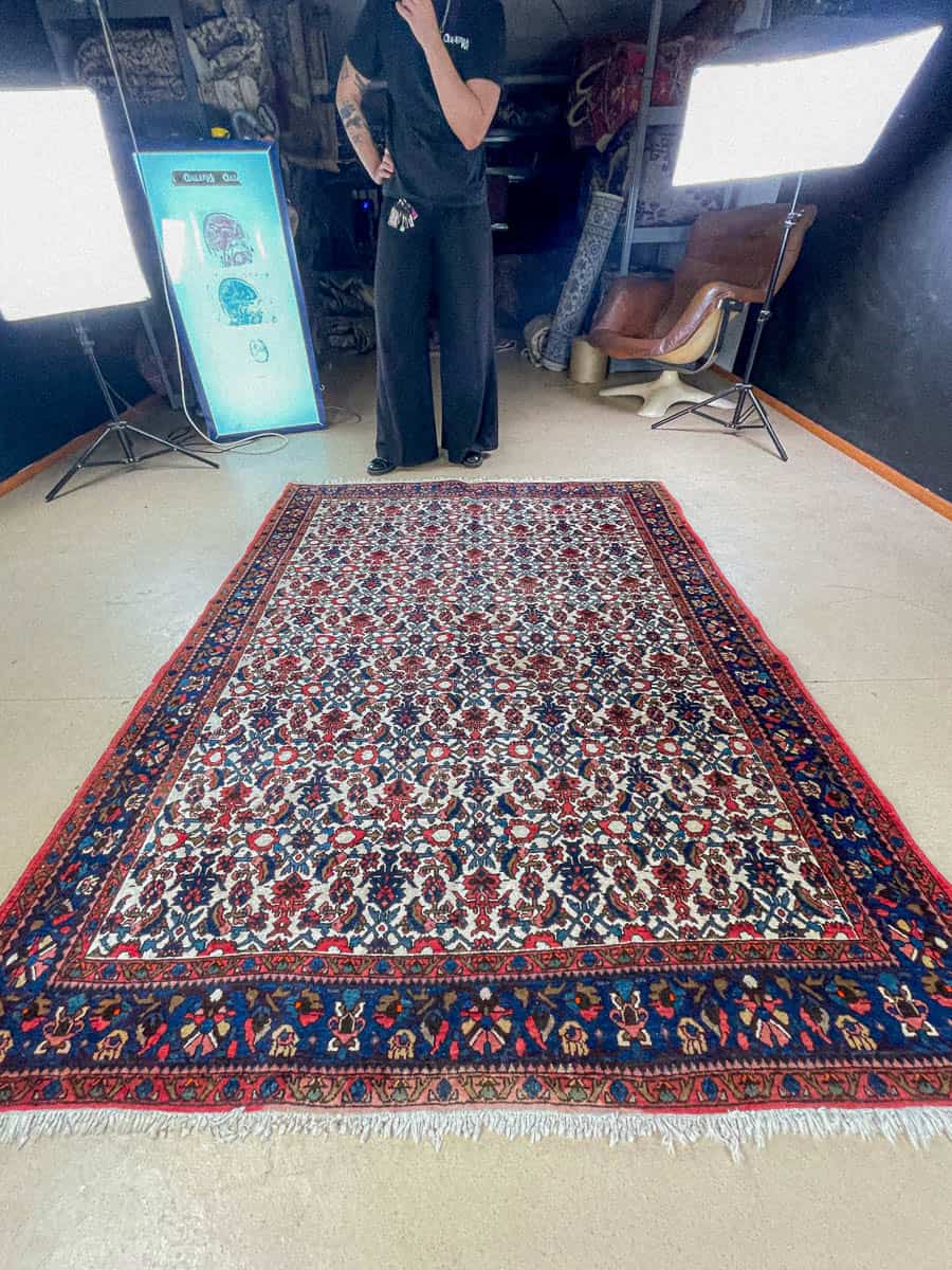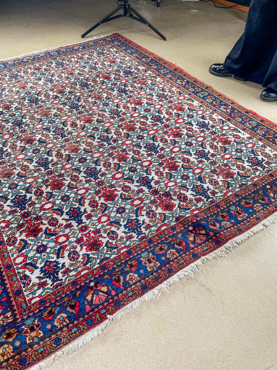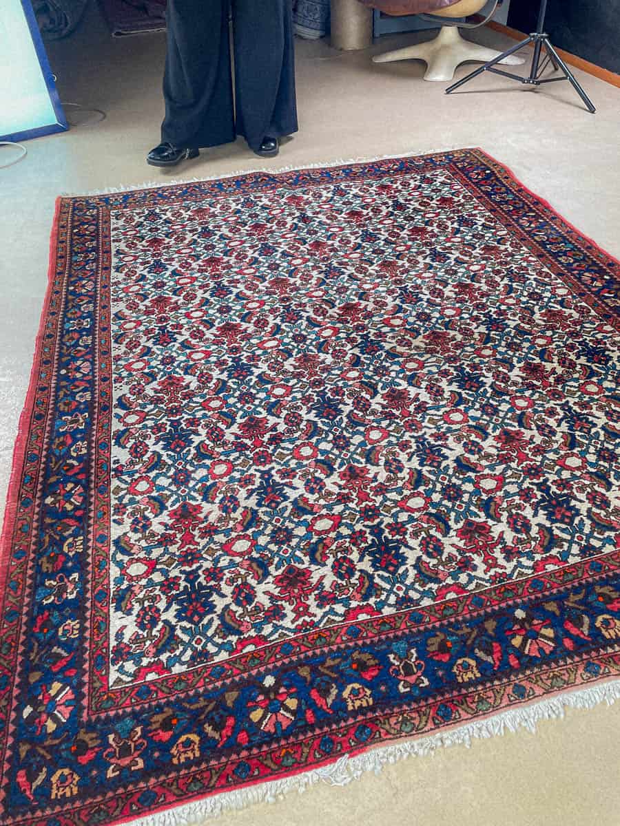 Tämä matto sijaitsee Töölön varastollamme – jos haluat tulla katsomaan sitä paikan päälle, sovithan näytön viestitse tai puhelimitse.