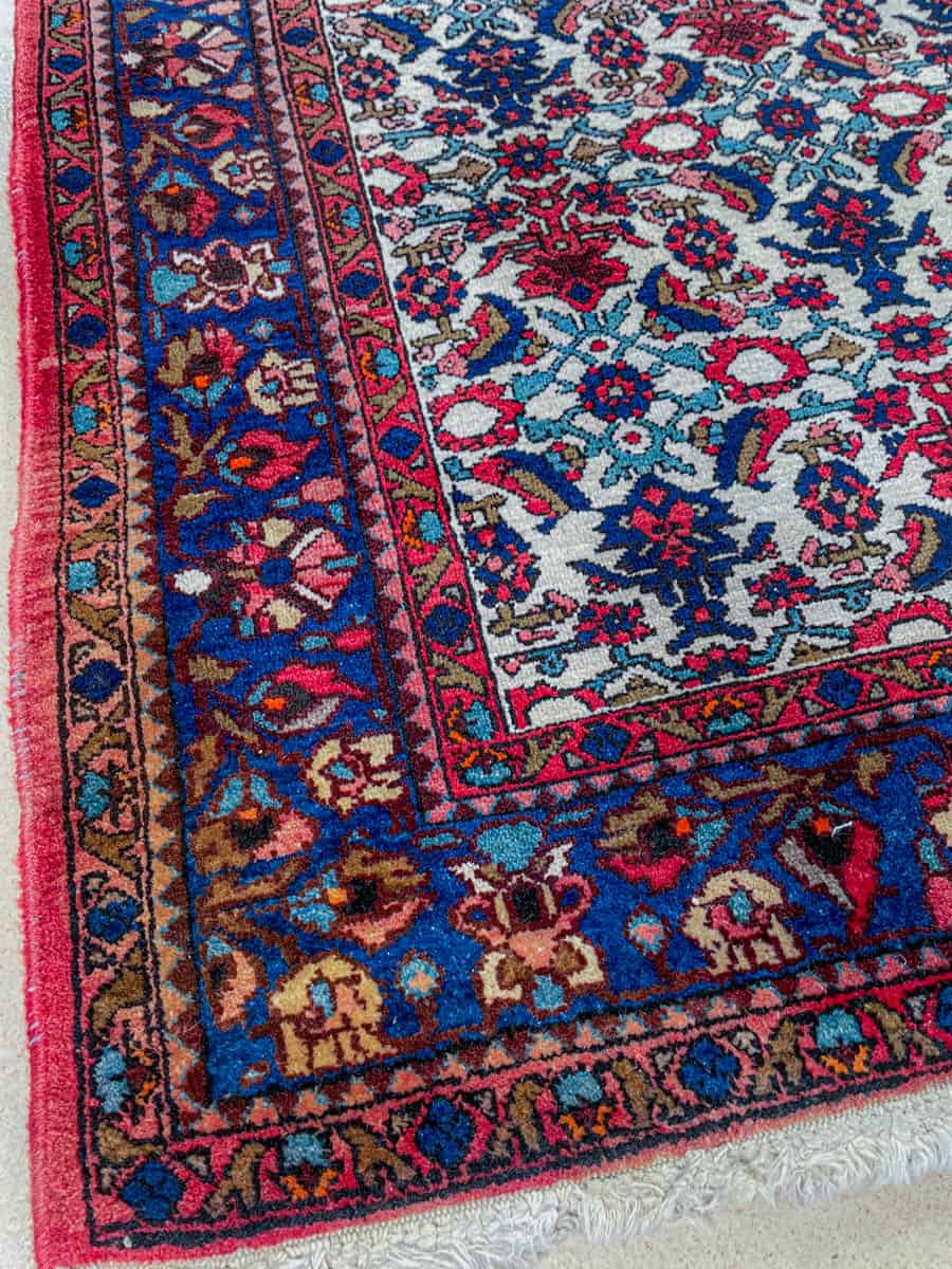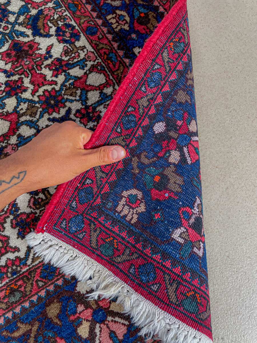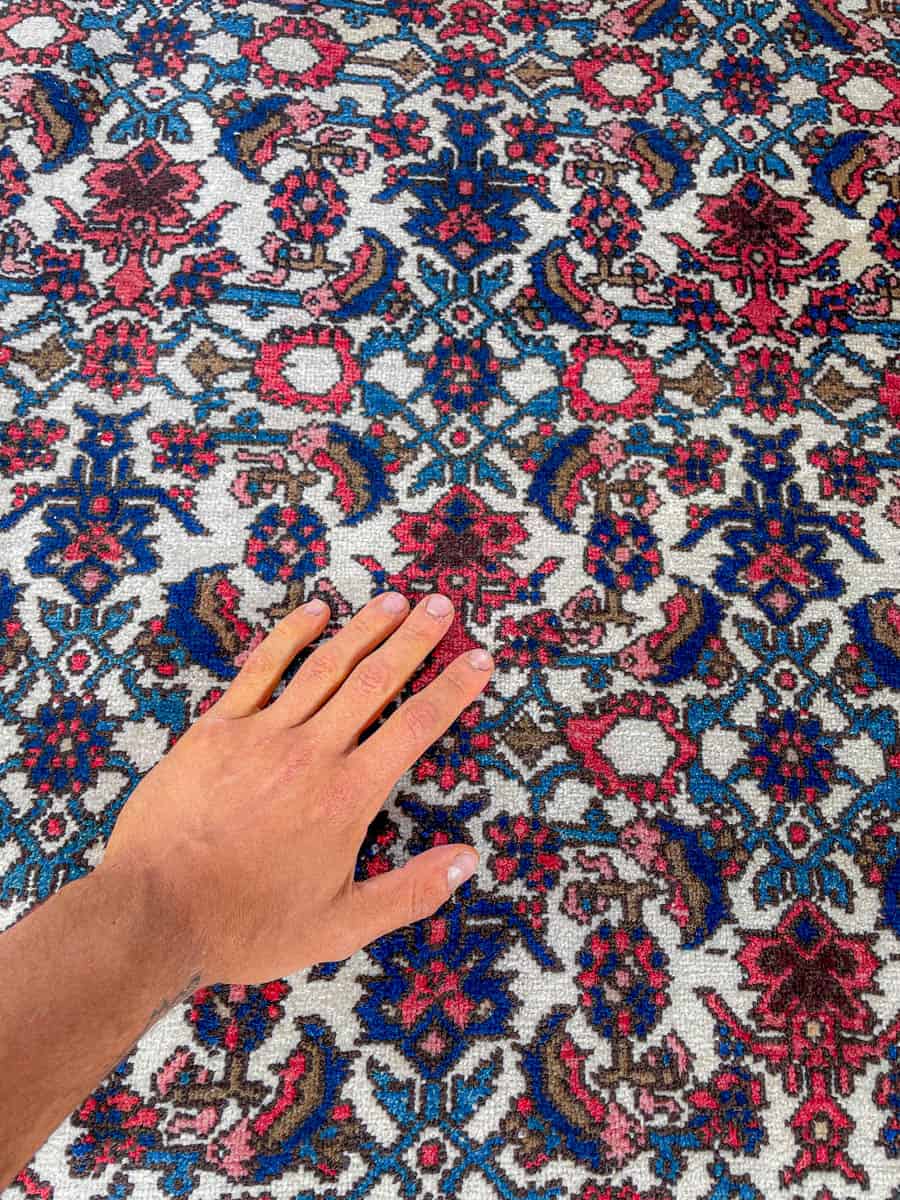 Tämä matto sijaitsee Töölön varastollamme – jos haluat tulla katsomaan sitä paikan päälle, sovithan näytön viestitse tai puhelimitse.