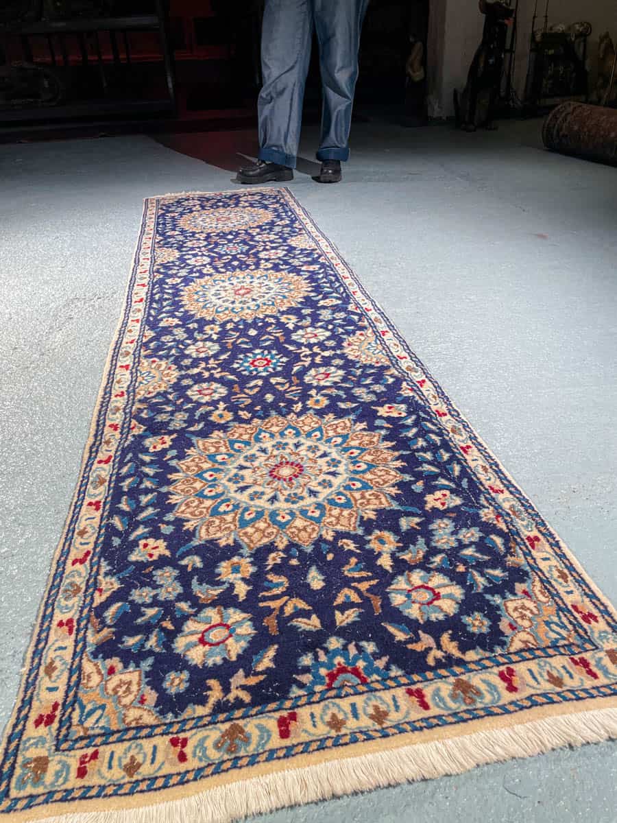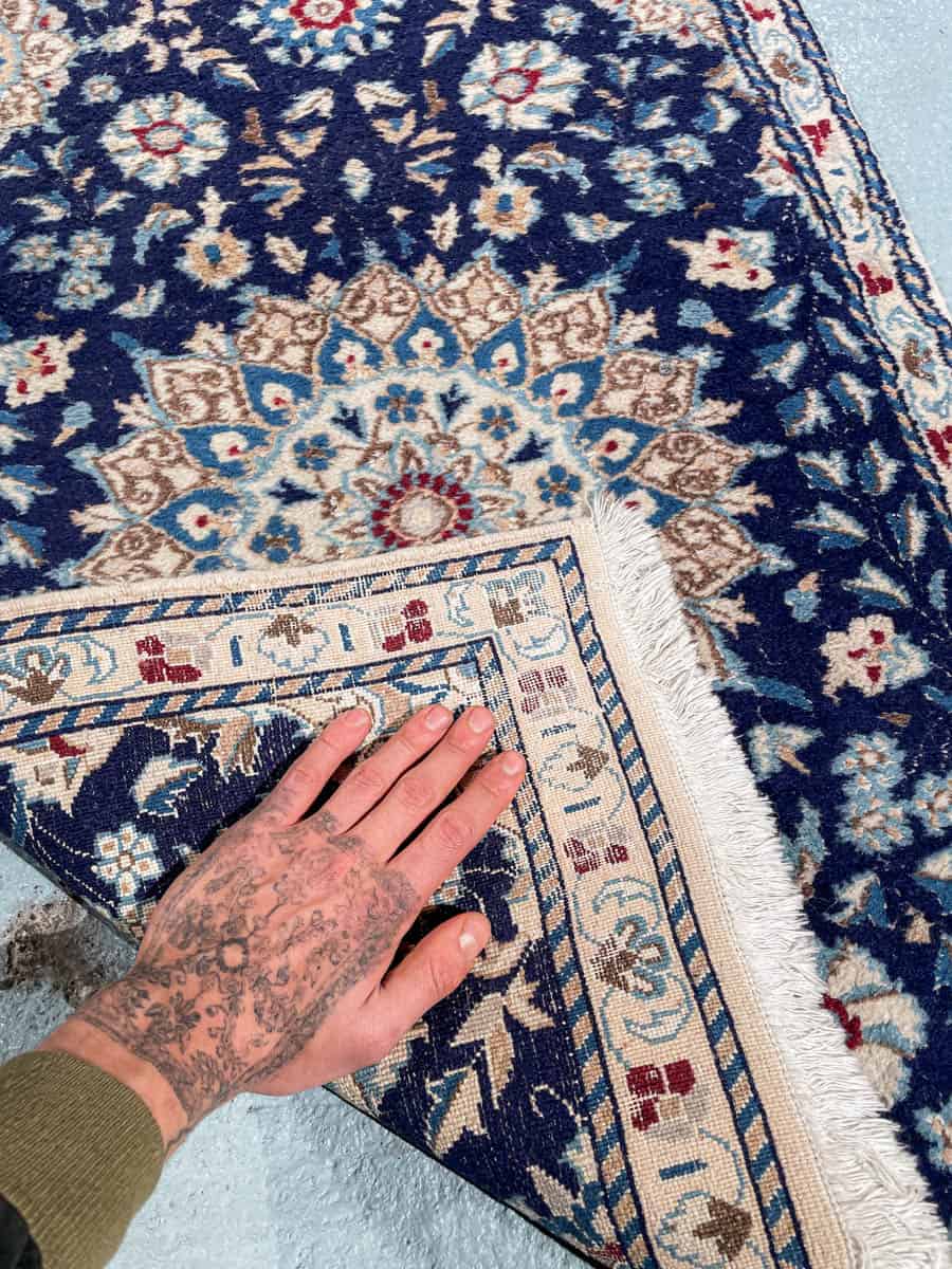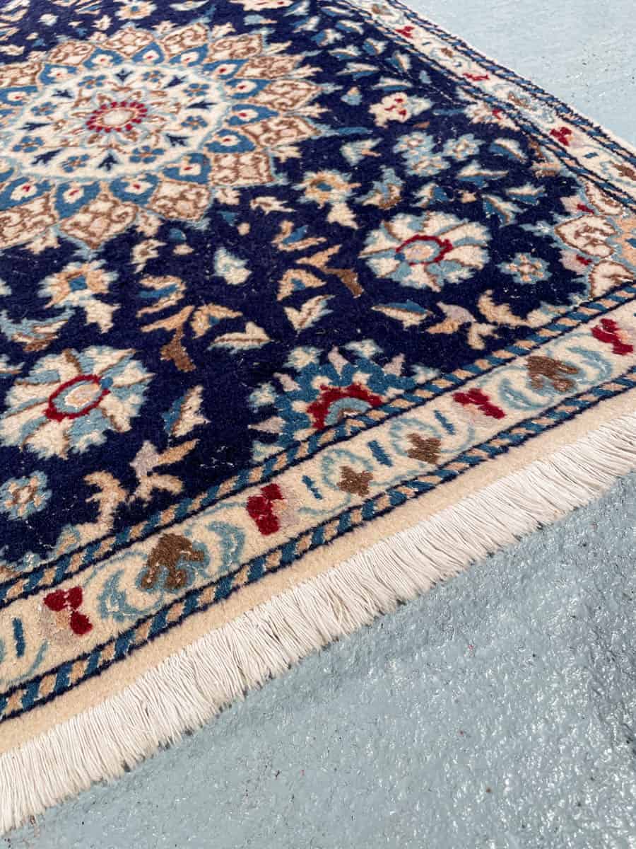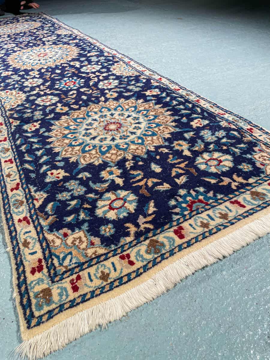 Uskomattoman kaunis ja yksityiskohtainen Nain-käytävämatto. Kaunis, siistissä kunnossa pysynyt sinivalkoinen väritys ja lumoavat medaljongit. Kauniita silkkisiä detaljeja. Käsinsolmittu villasta ja silkistä.