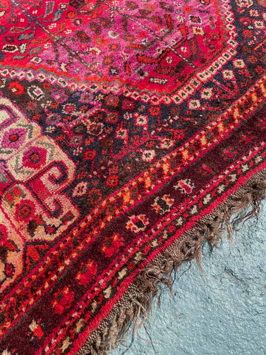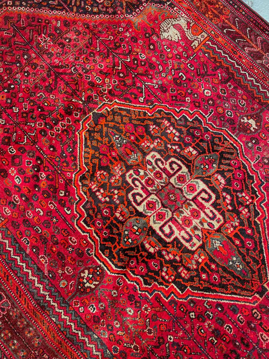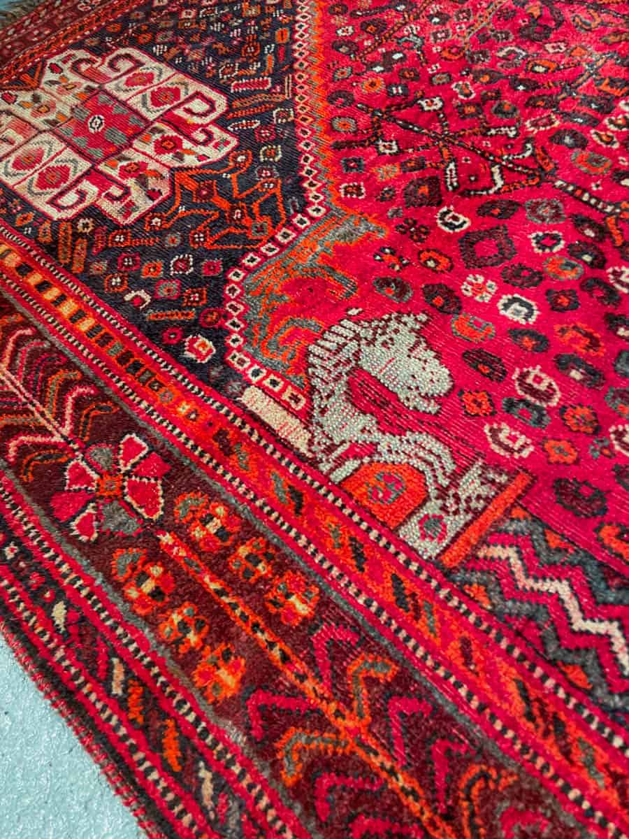 Upea hehkuvan punainen persialainen Gasghai perinteisissä väreissä ja geometrisilla kuvioinneilla.
