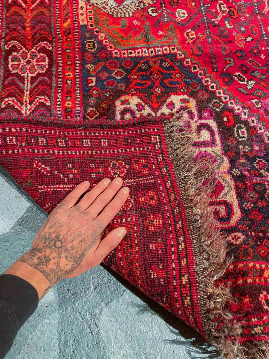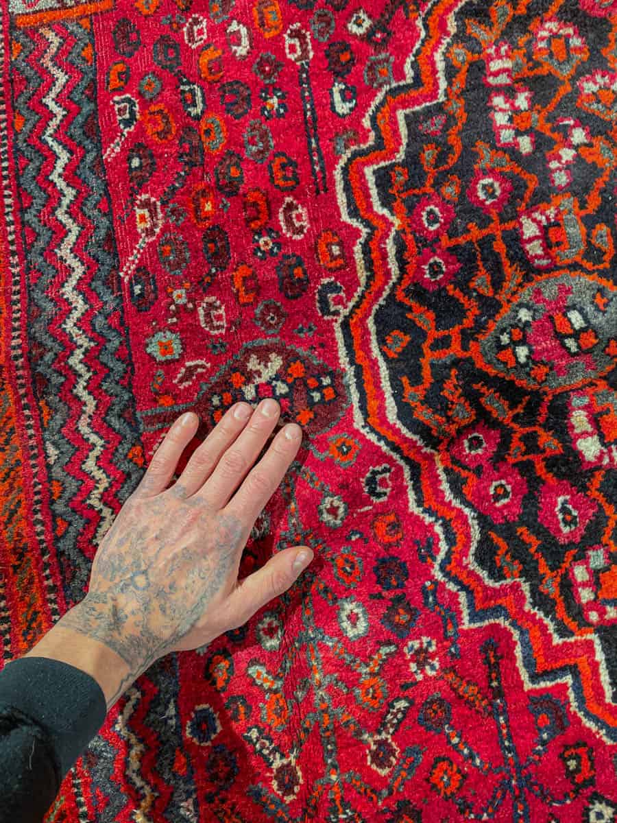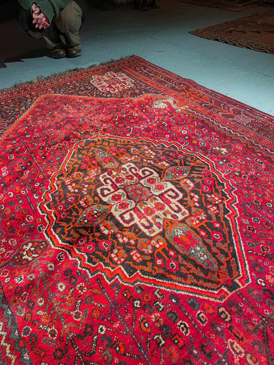 Upea hehkuvan punainen persialainen Gasghai perinteisissä väreissä ja geometrisilla kuvioinneilla.