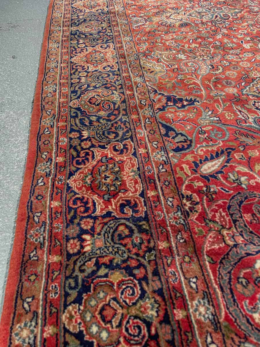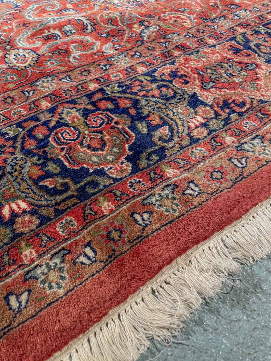 Hehkuva Kasmir, jonka punainen tausta korostaa yksityiskohtaisia kukka- ja ornamenttikuviointeja, tehden matosta arvokkaan koristeellisen.