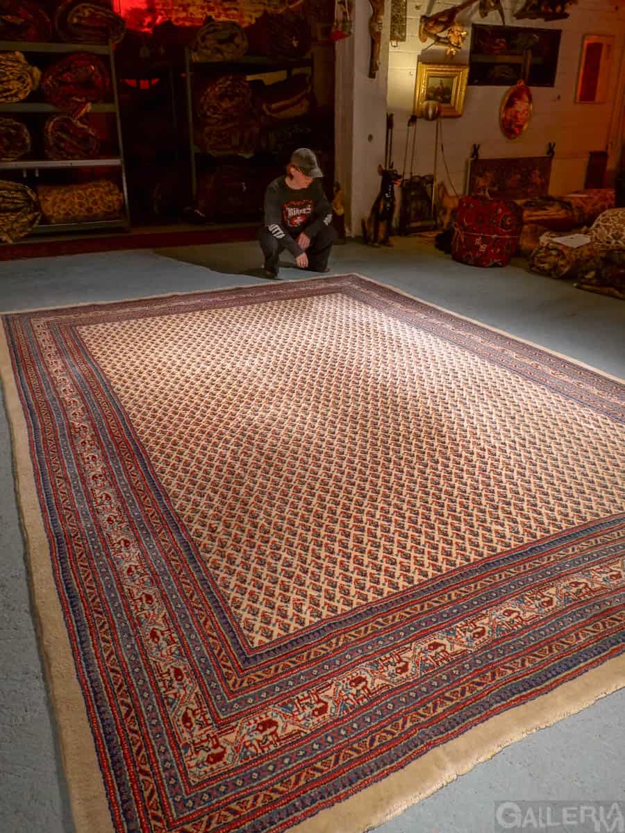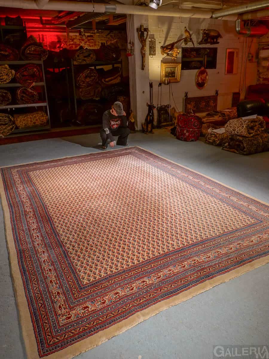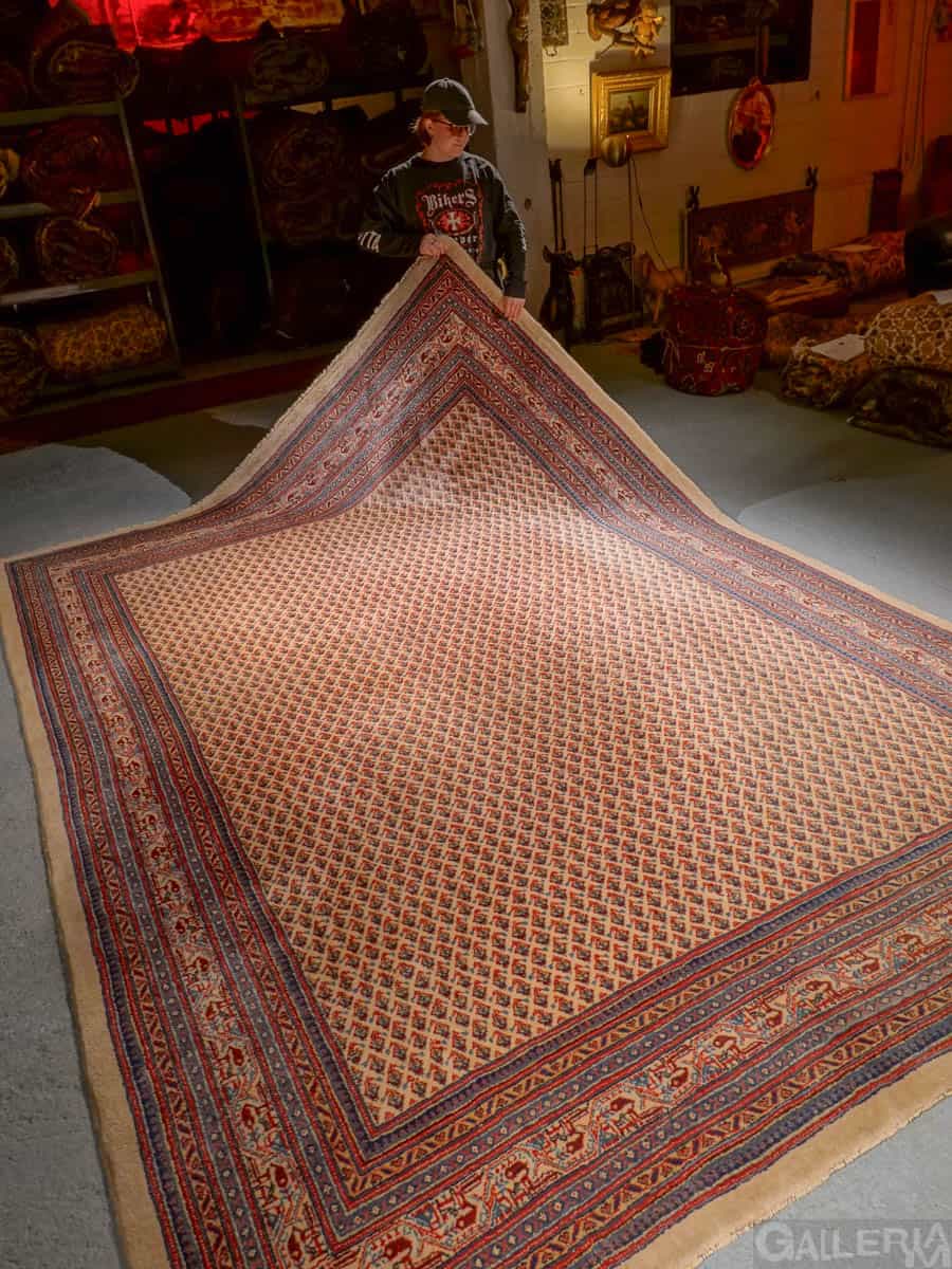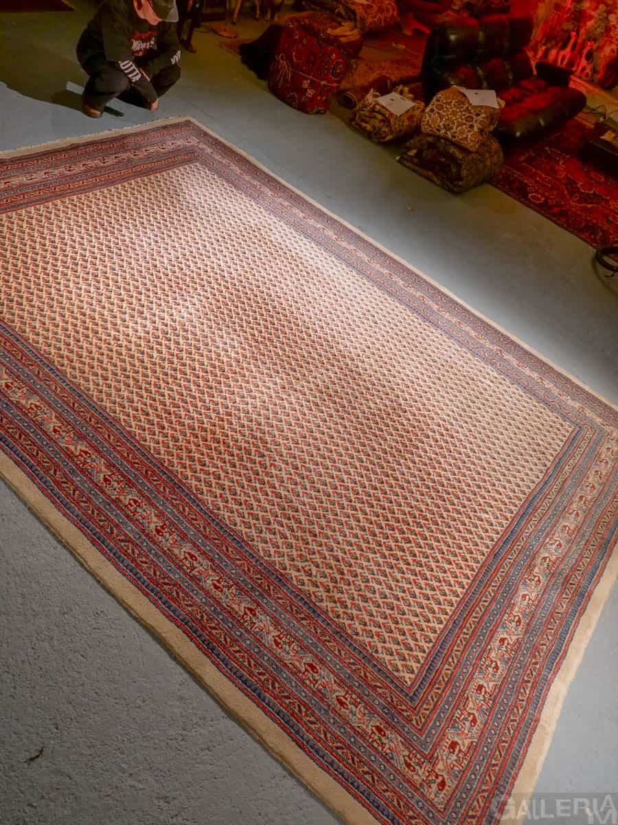 Perinteinen käsinsolmittu persialainen Sarouk Mir -villamatto vaalealla taustavärillä.