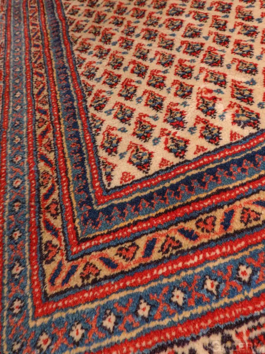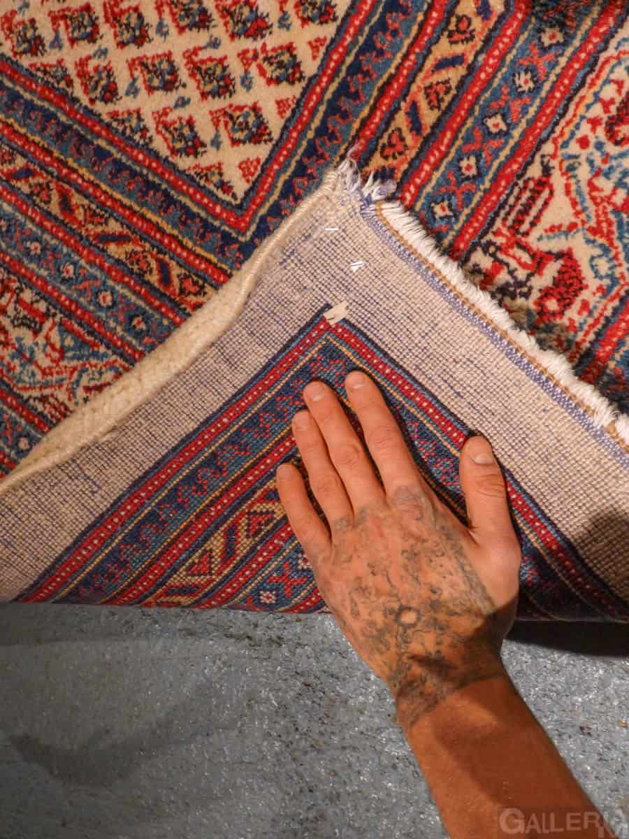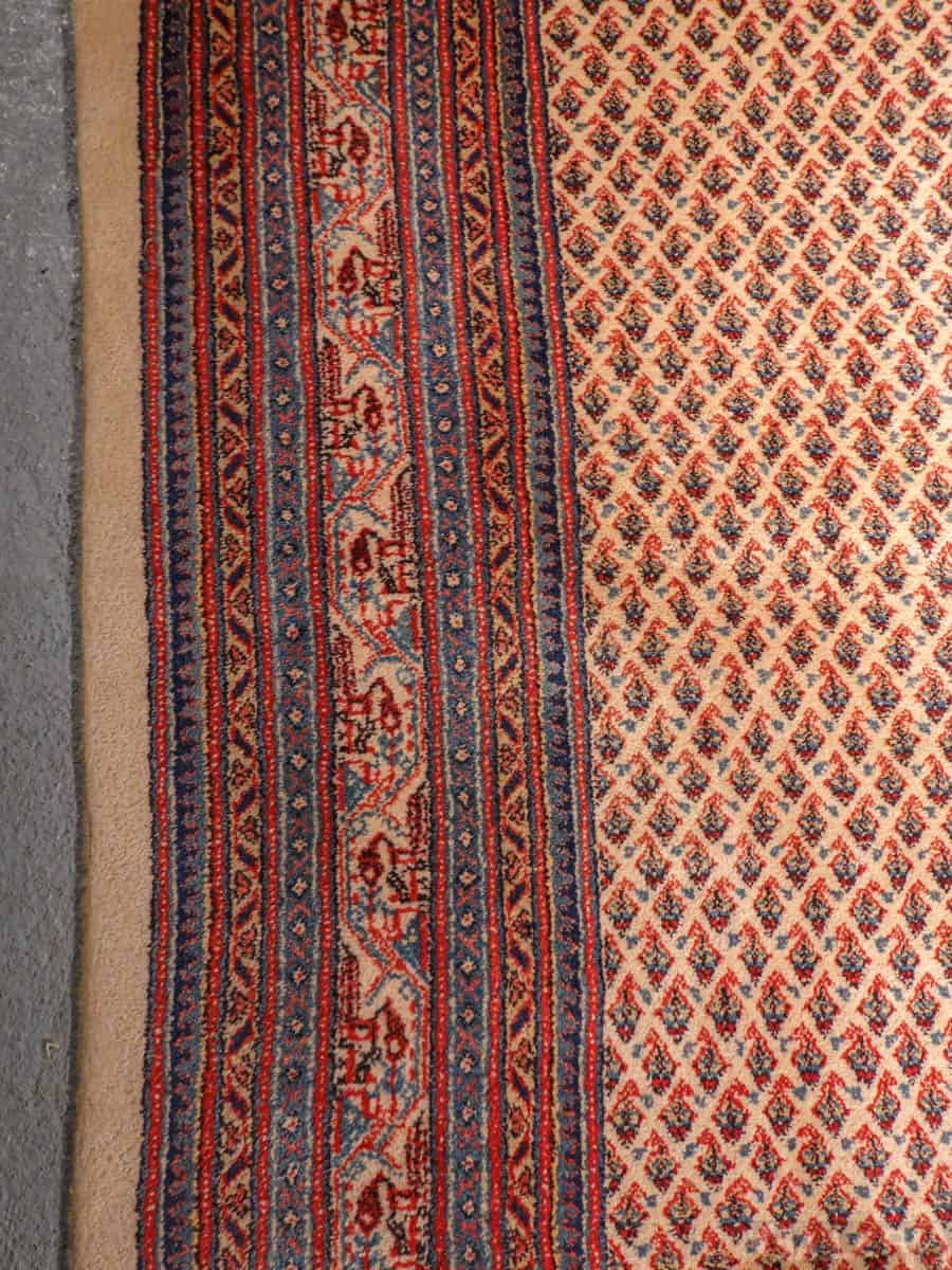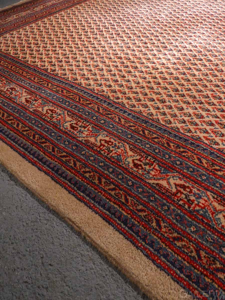 Perinteinen käsinsolmittu persialainen Sarouk Mir -villamatto vaalealla taustavärillä.