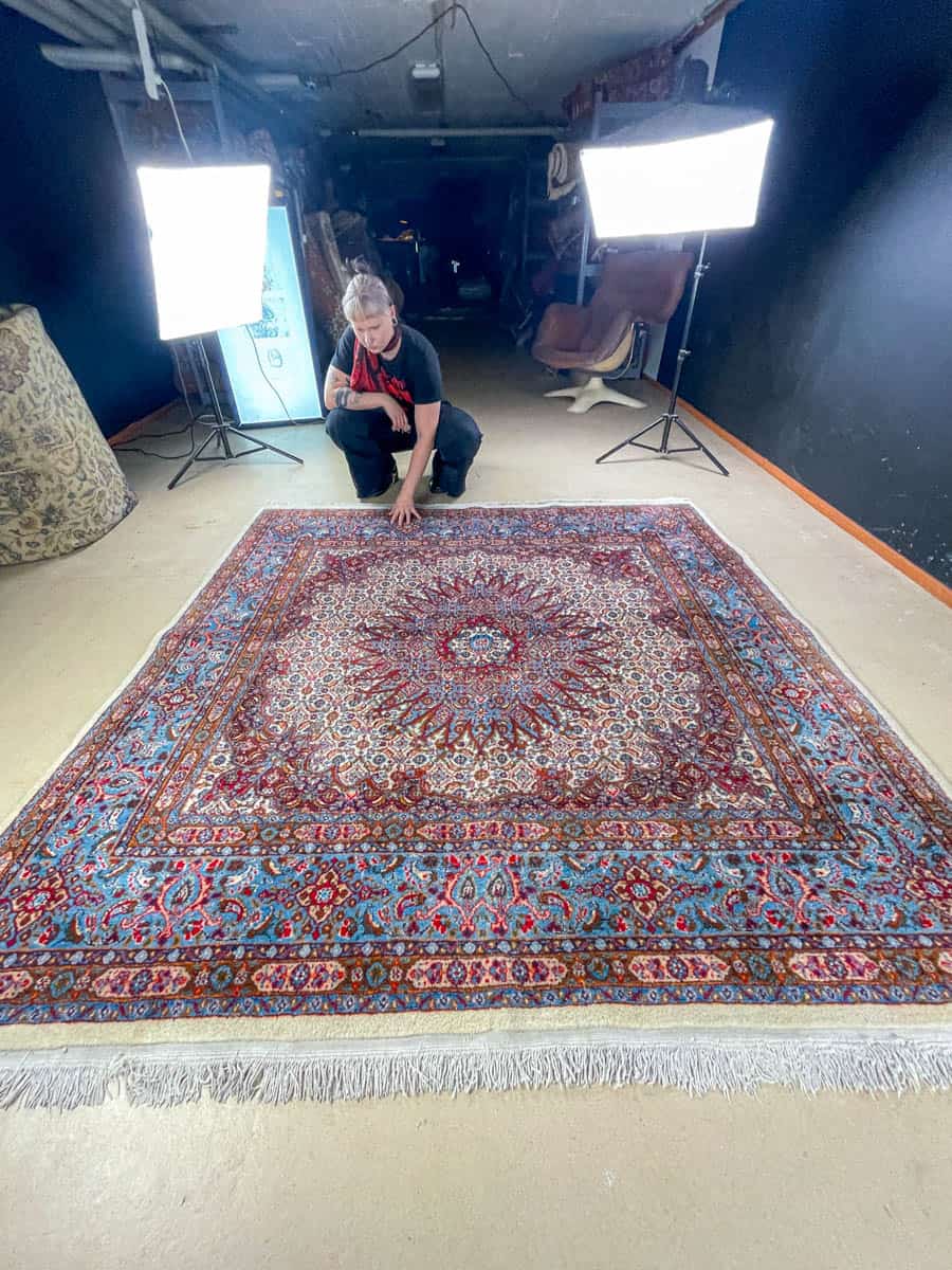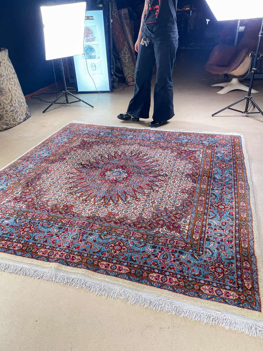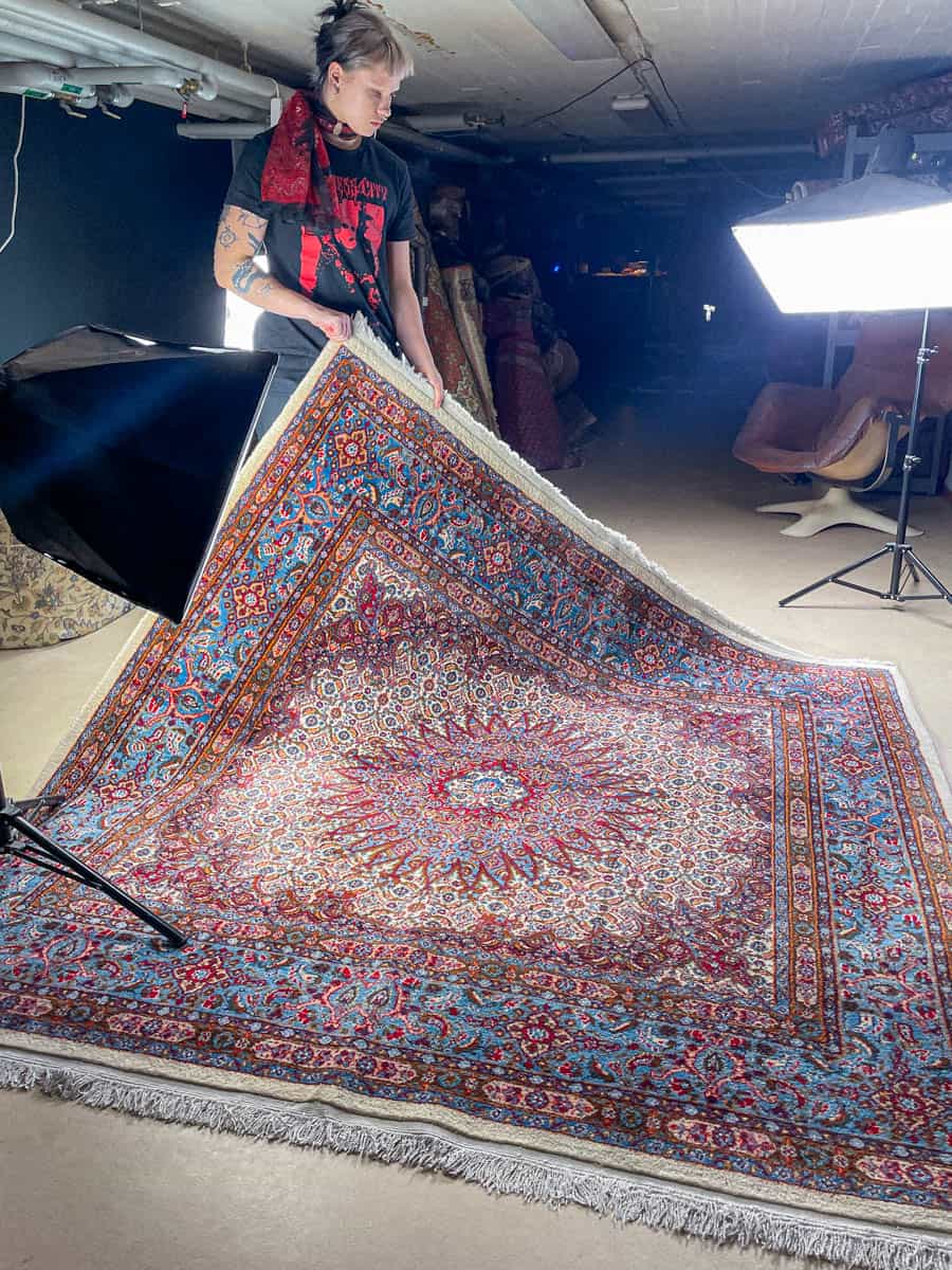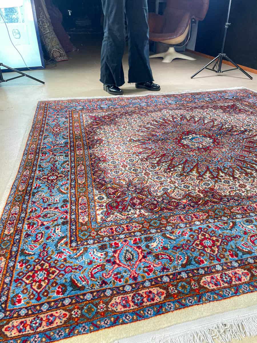 Tämä matto sijaitsee Töölön varastollamme – jos haluat tulla katsomaan sitä paikan päälle, sovithan näytön viestitse tai puhelimitse.