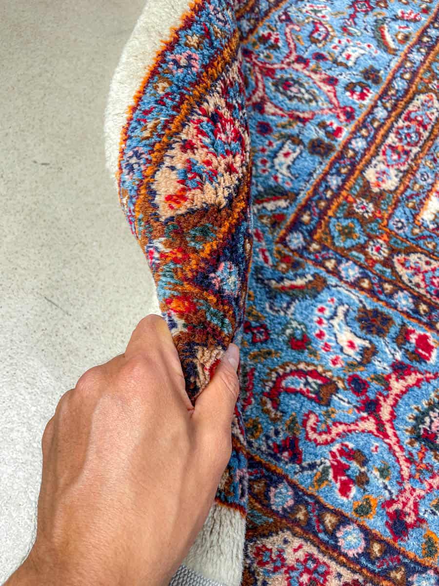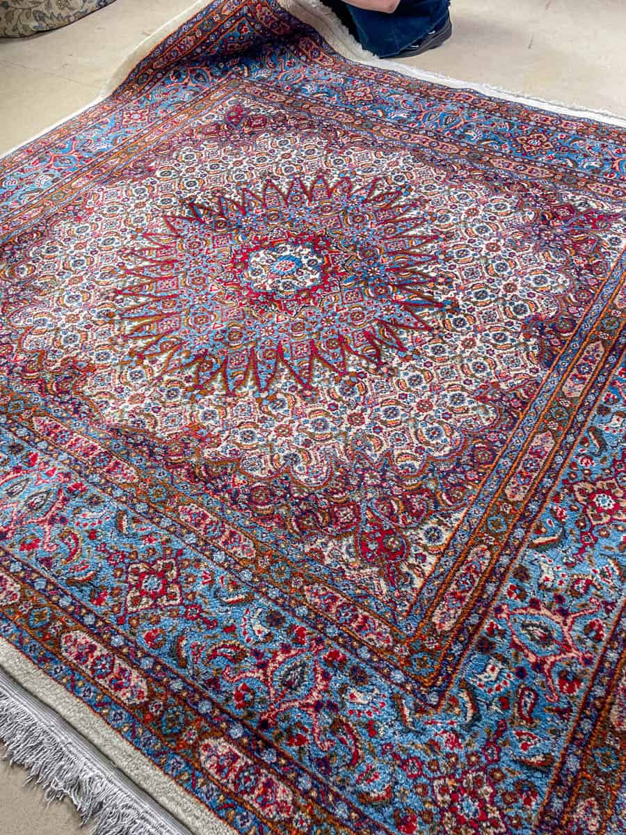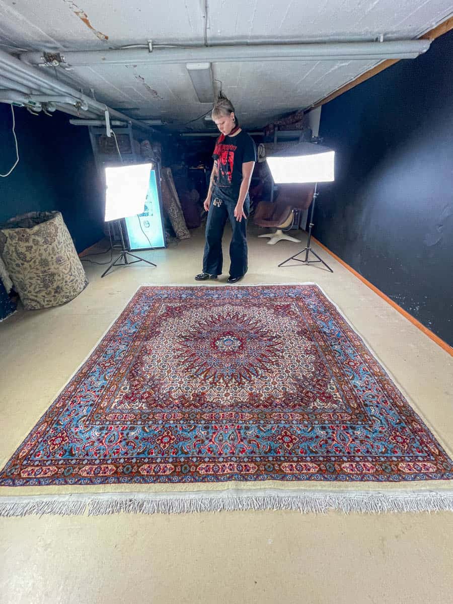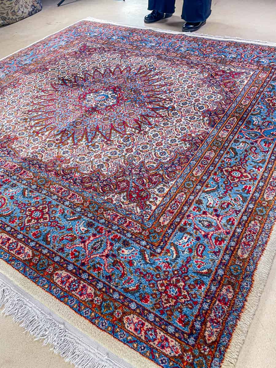 Tämä matto sijaitsee Töölön varastollamme – jos haluat tulla katsomaan sitä paikan päälle, sovithan näytön viestitse tai puhelimitse.