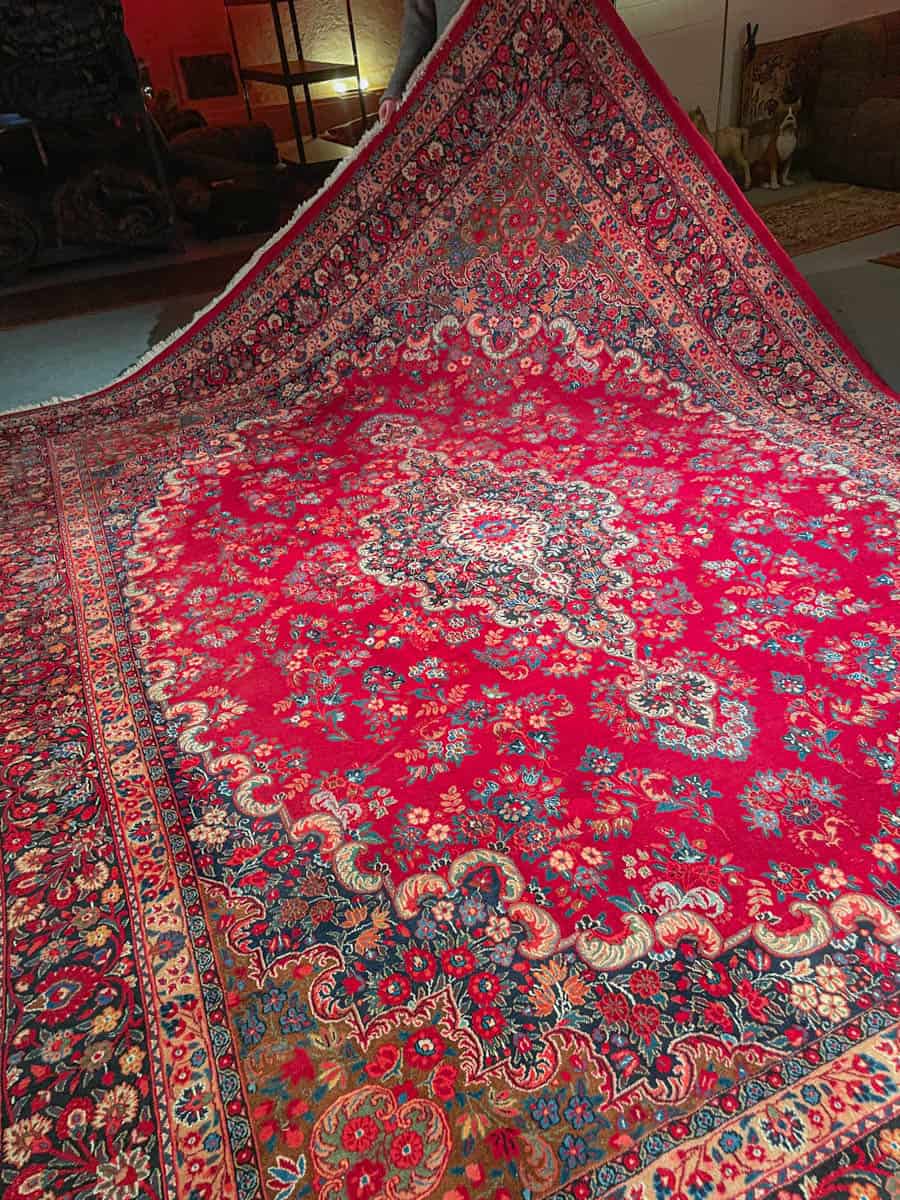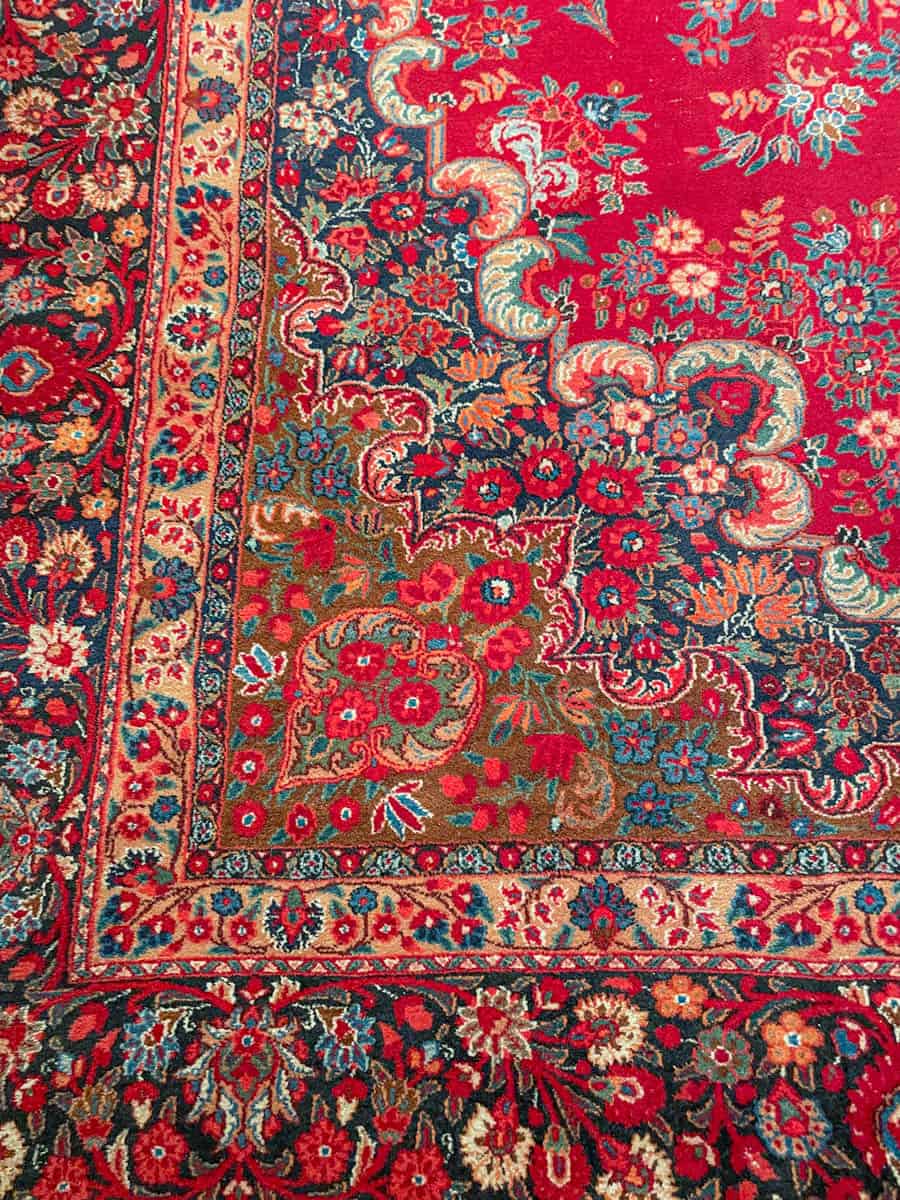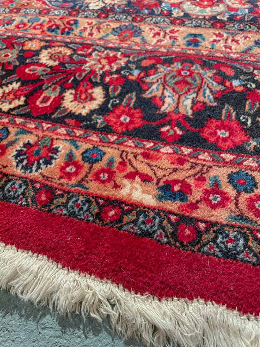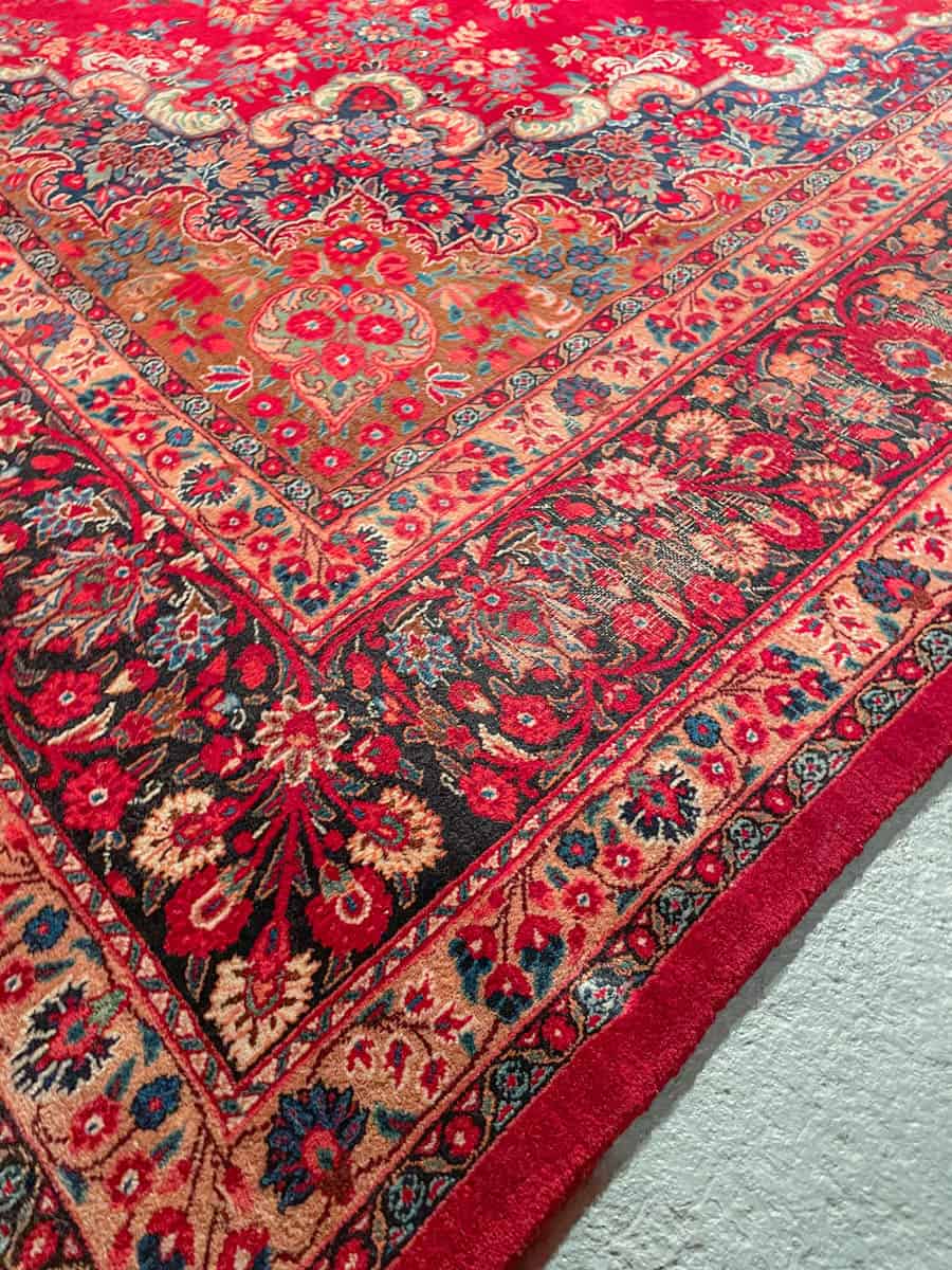 Tyrmäävän upea n. 1970-luvulla villasta käsinsolmittu Meshed, jonka väreissä kilpailevat keskenään lukemattomat sävyt. Harmoniset yksityiskohtaiset ja uniikit kuvioinnit.