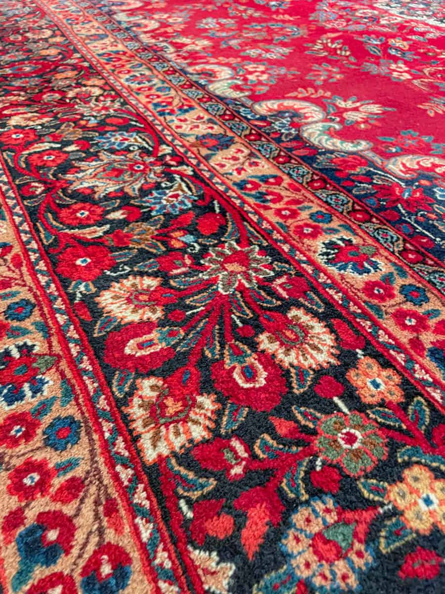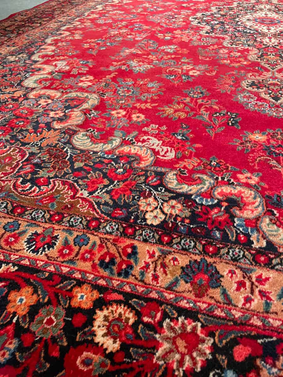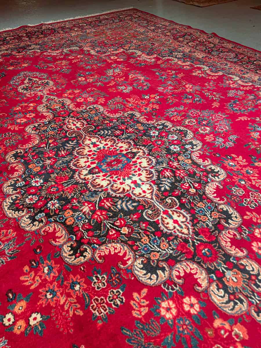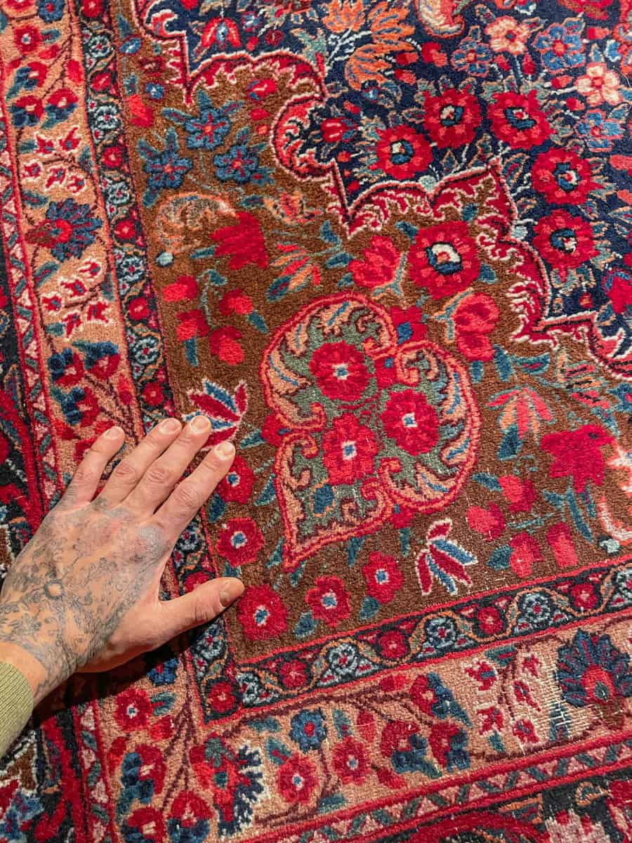 Tyrmäävän upea n. 1970-luvulla villasta käsinsolmittu Meshed, jonka väreissä kilpailevat keskenään lukemattomat sävyt. Harmoniset yksityiskohtaiset ja uniikit kuvioinnit.