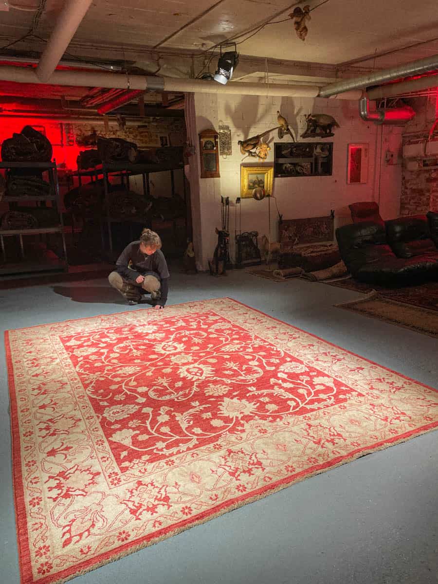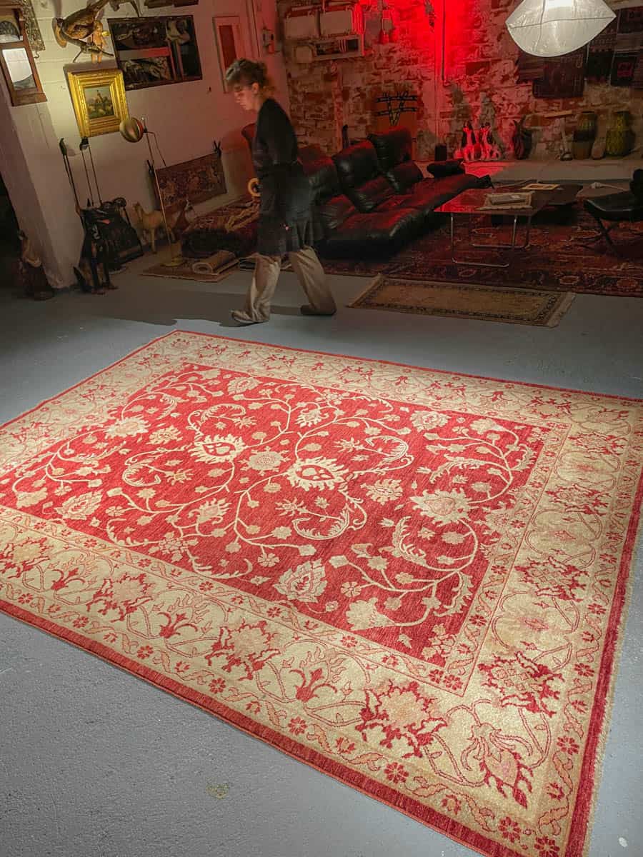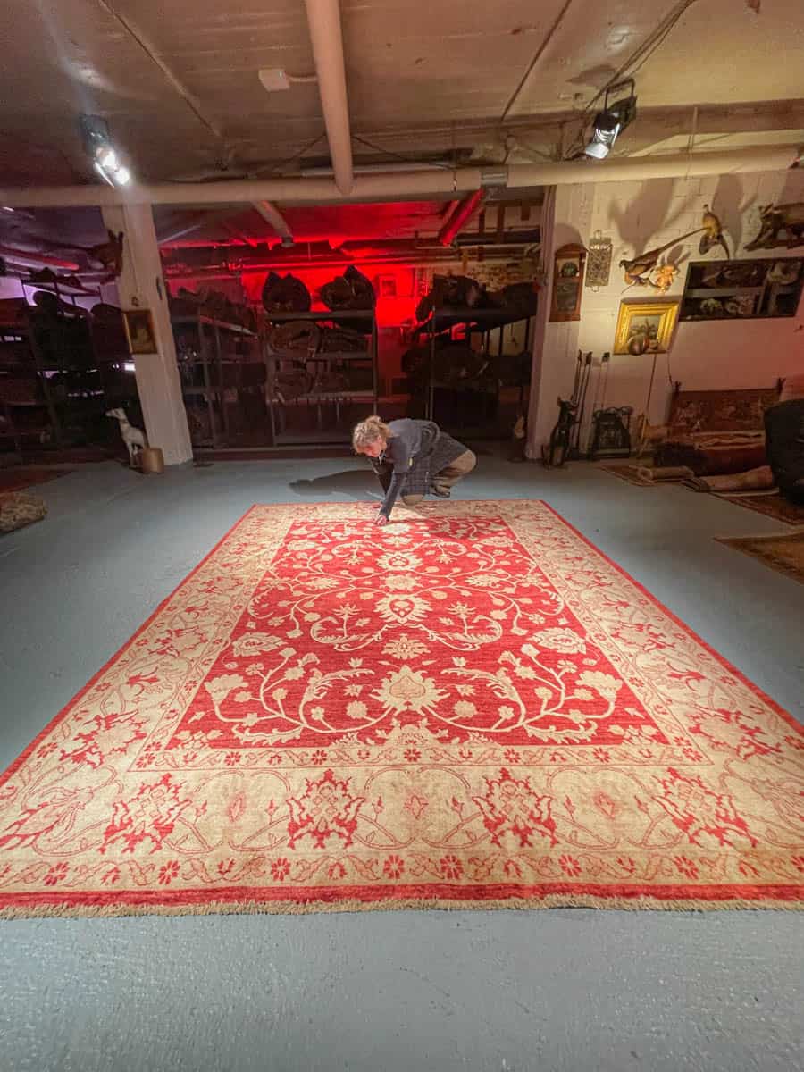 Tämä matto sijaitsee Töölön varastollamme – jos haluat tulla katsomaan sitä paikan päälle, sovithan näytön viestitse tai puhelimitse.