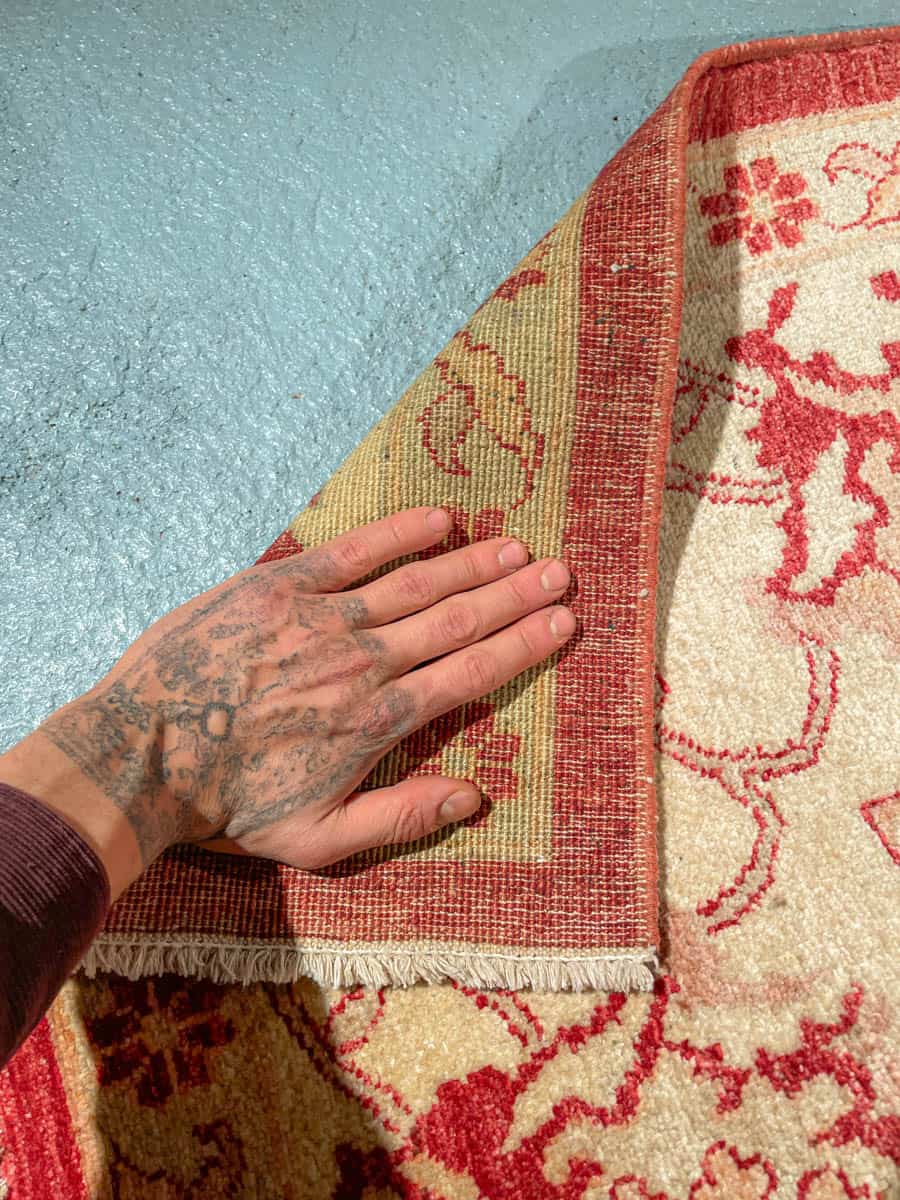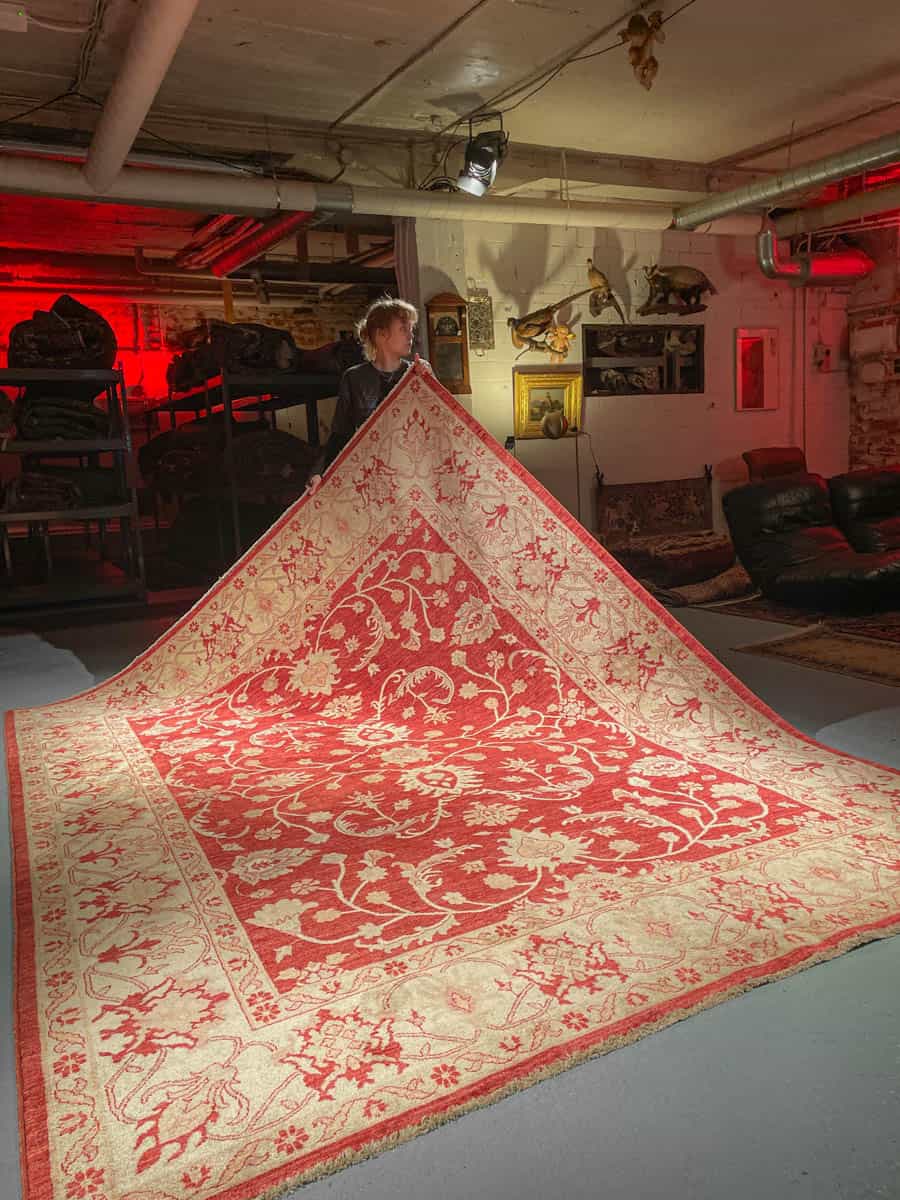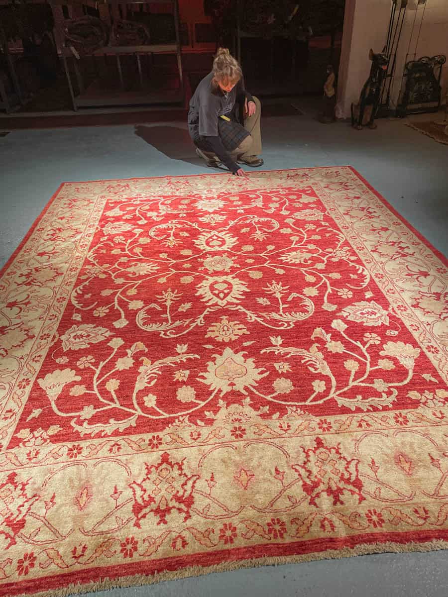 Tämä matto sijaitsee Töölön varastollamme – jos haluat tulla katsomaan sitä paikan päälle, sovithan näytön viestitse tai puhelimitse.