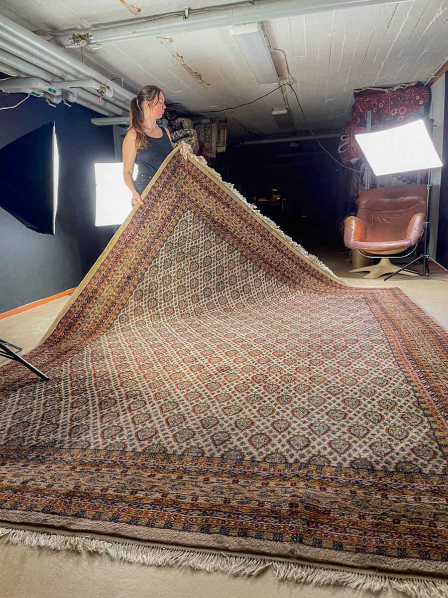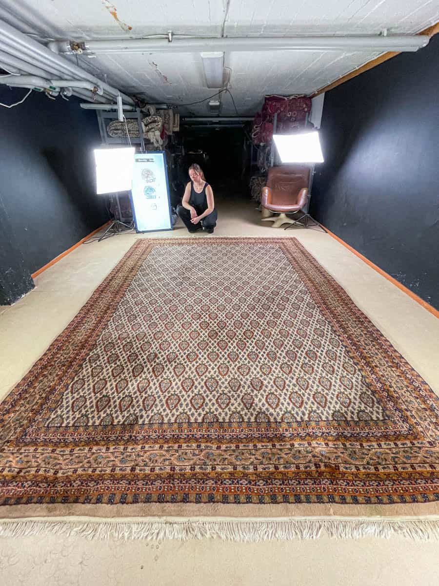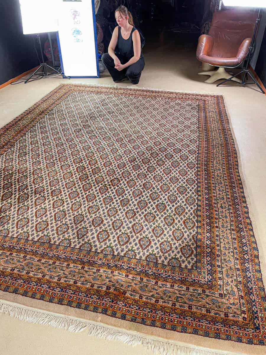 Tämä matto sijaitsee Töölön varastollamme – jos haluat tulla katsomaan sitä paikan päälle, sovithan näytön viestitse tai puhelimitse.