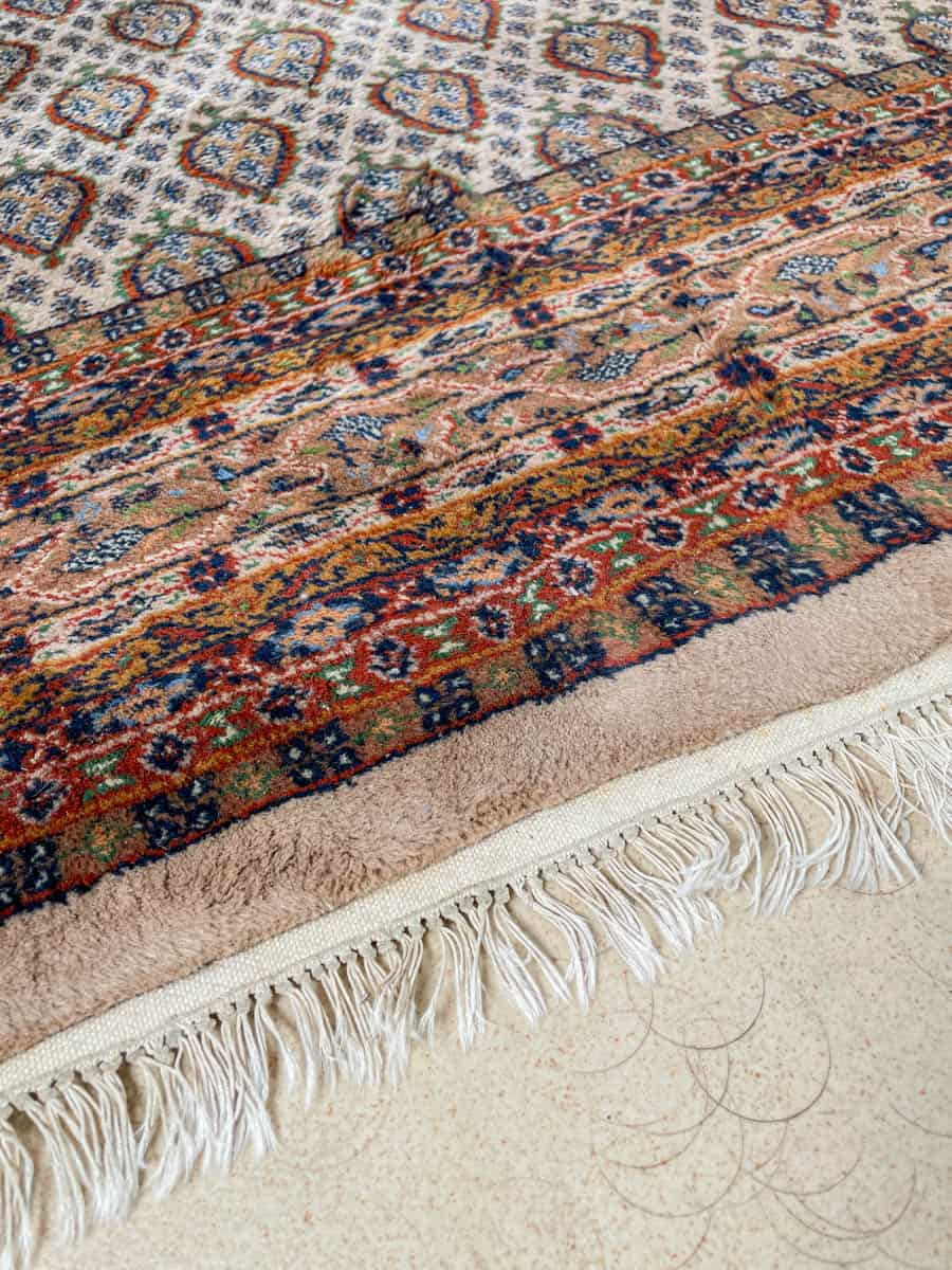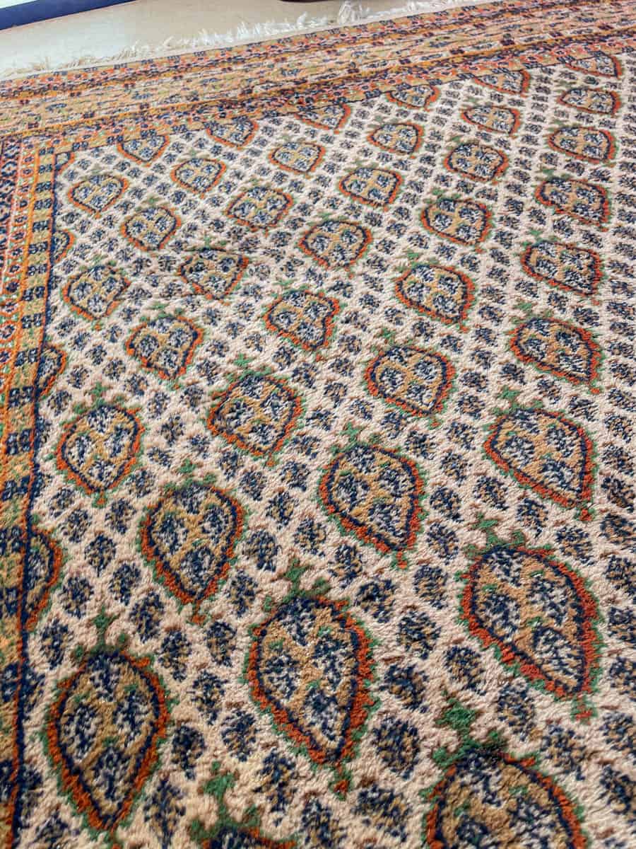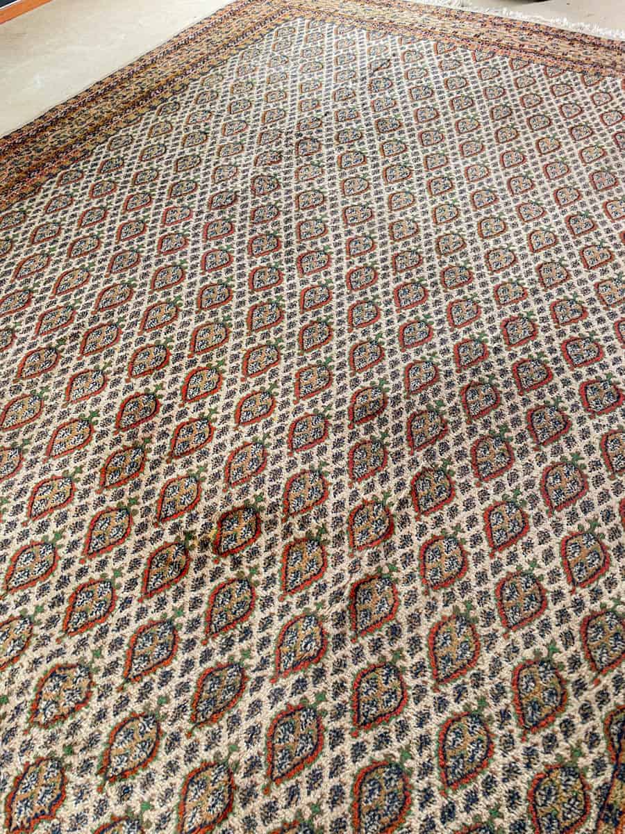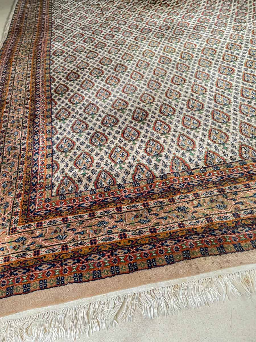 Tämä matto sijaitsee Töölön varastollamme – jos haluat tulla katsomaan sitä paikan päälle, sovithan näytön viestitse tai puhelimitse.