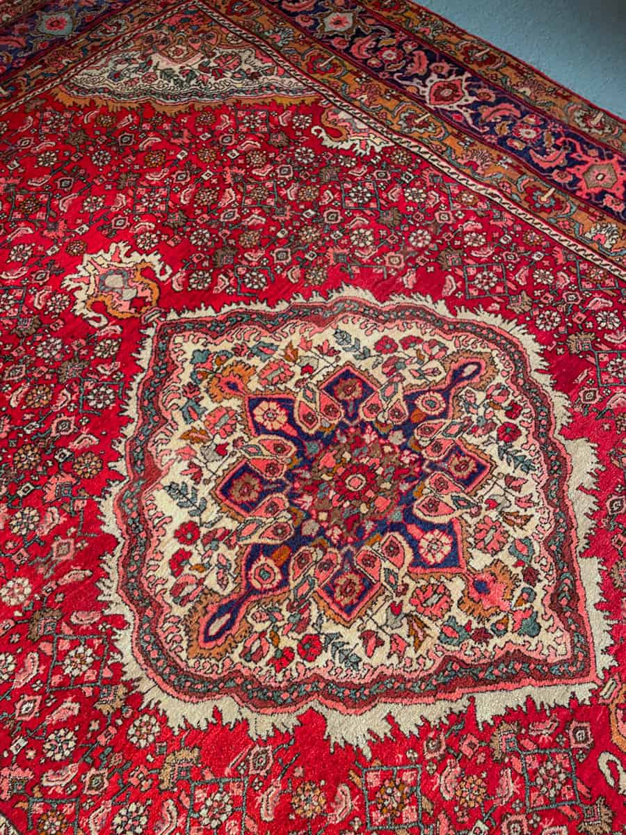 Kaunis persialainen Bijar-kuviointi tyrmäävällä keskimedaljongilla ja harmonisen pastellisella – todella harvinaisella – vaaleanpunaiseen taittavalla väriteemalla. Käsinsolmittu villasta n. 60 vuotta sitten.