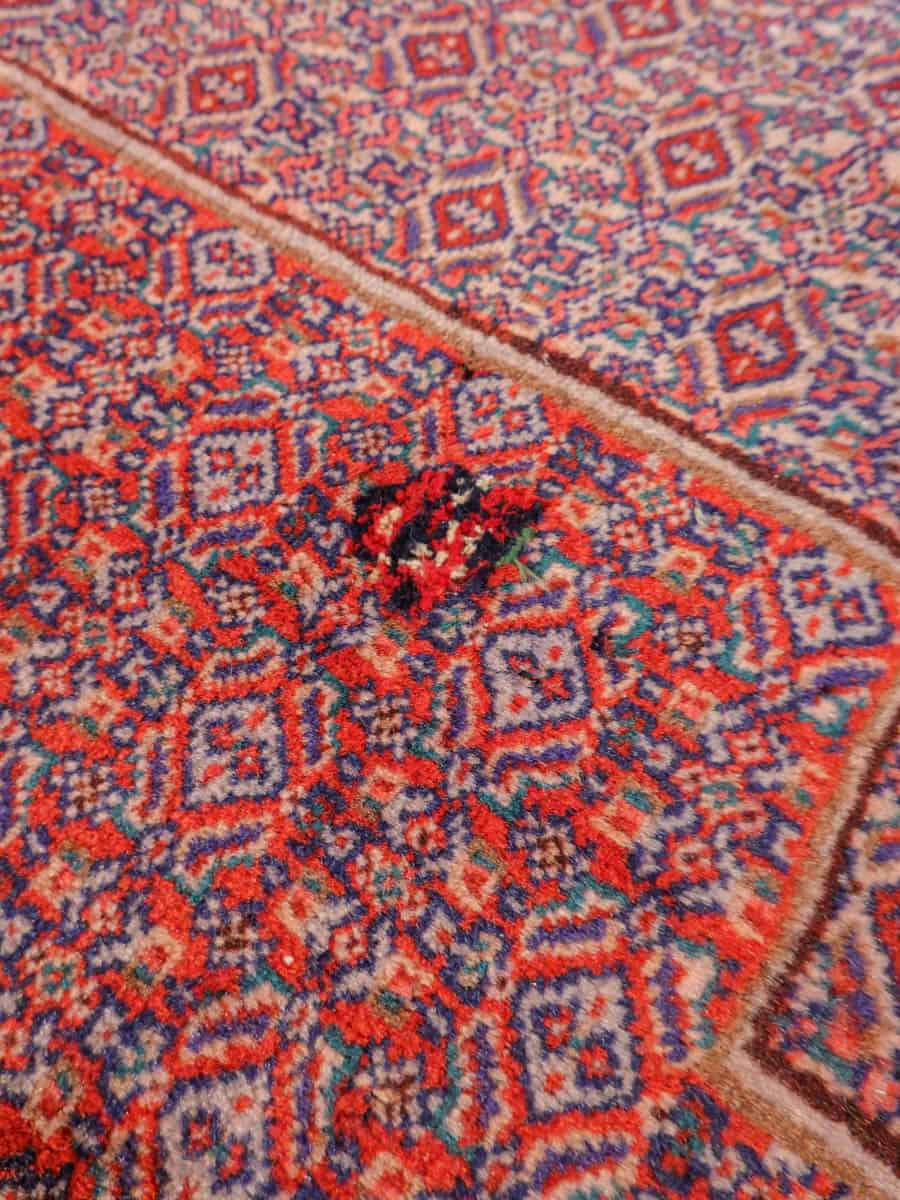 Tyylikäs perinteinen Senneh elegantilla sinipunaisella sävymaailmalla. Käsinsolmittu villasta.