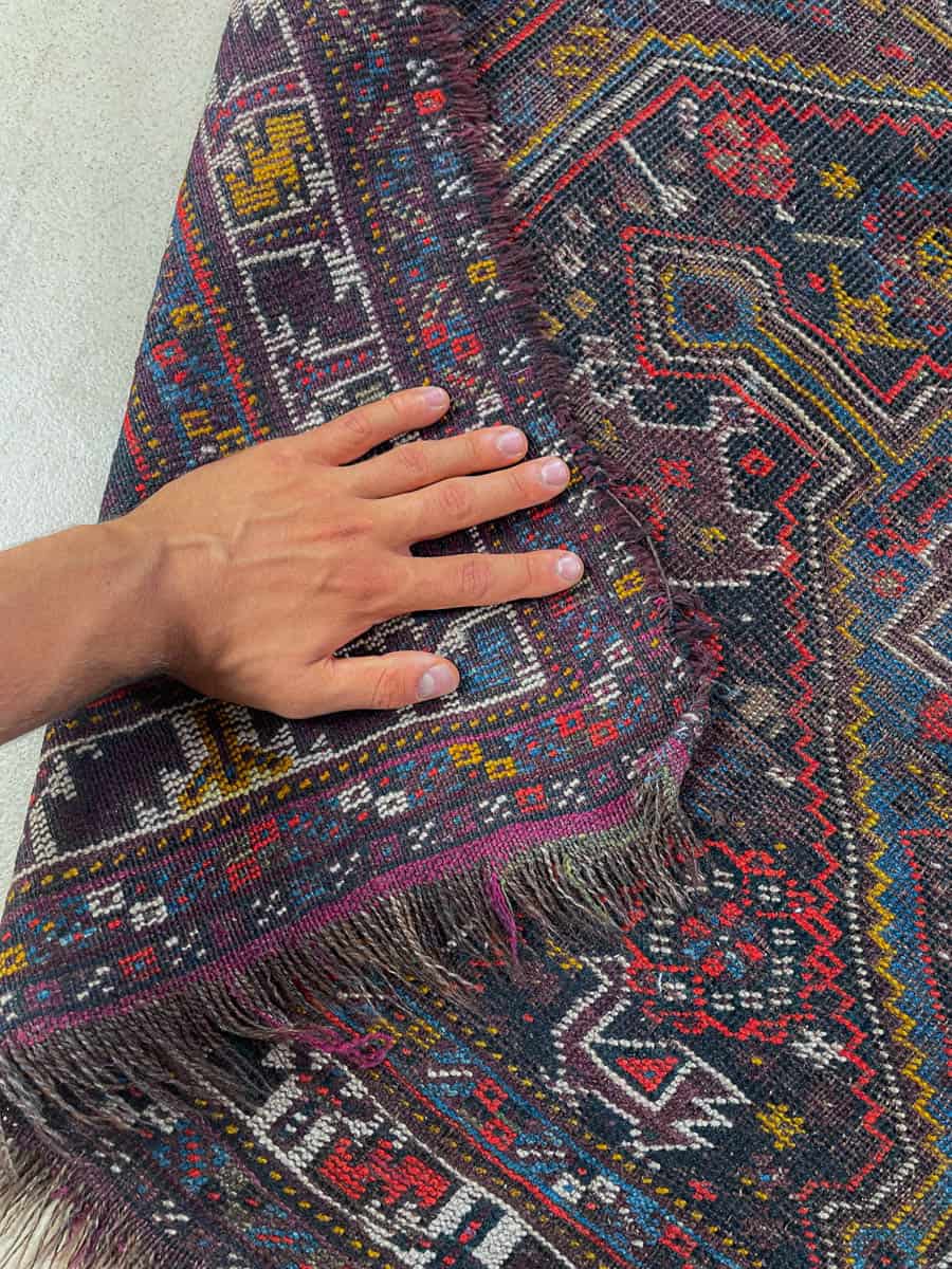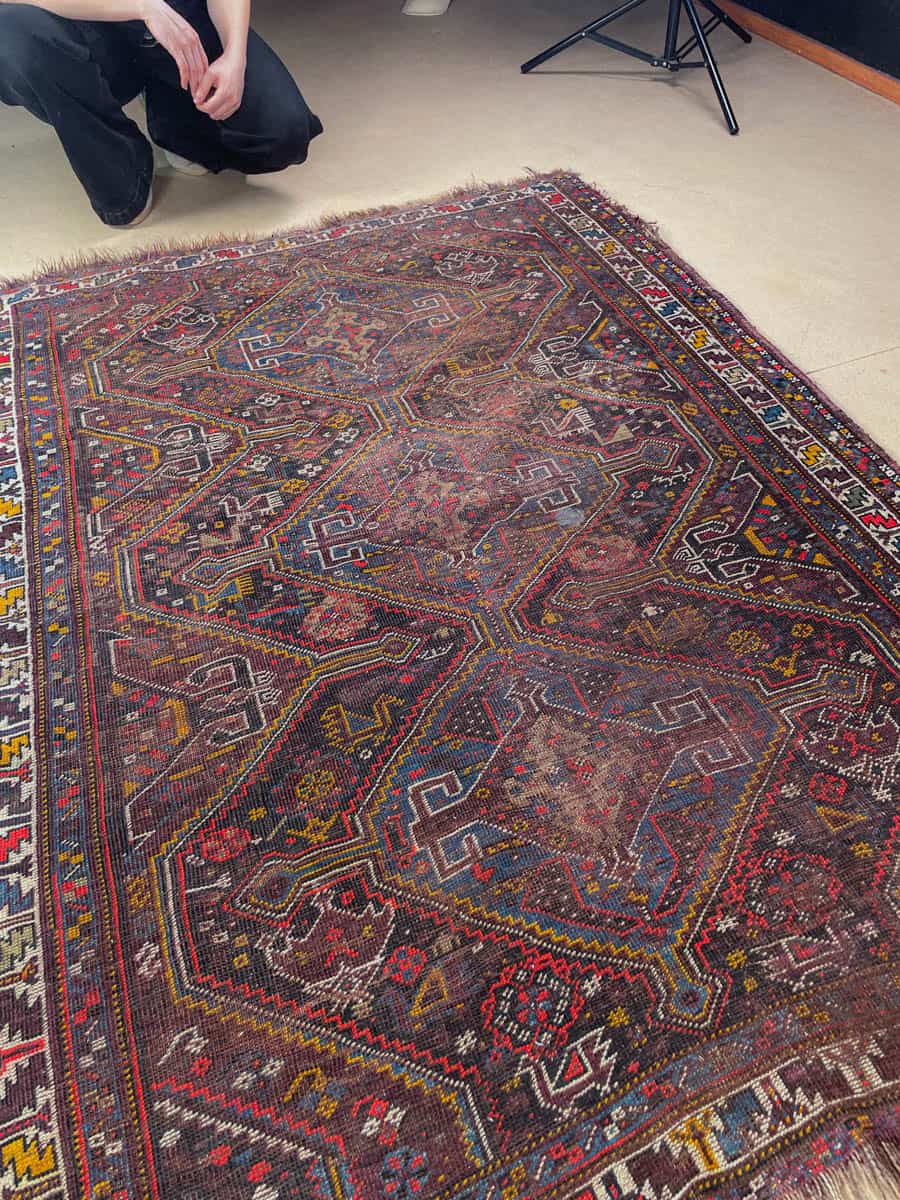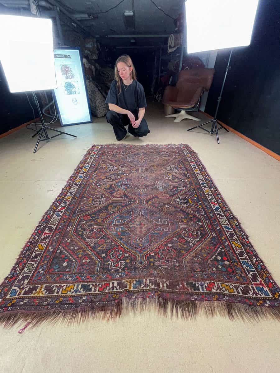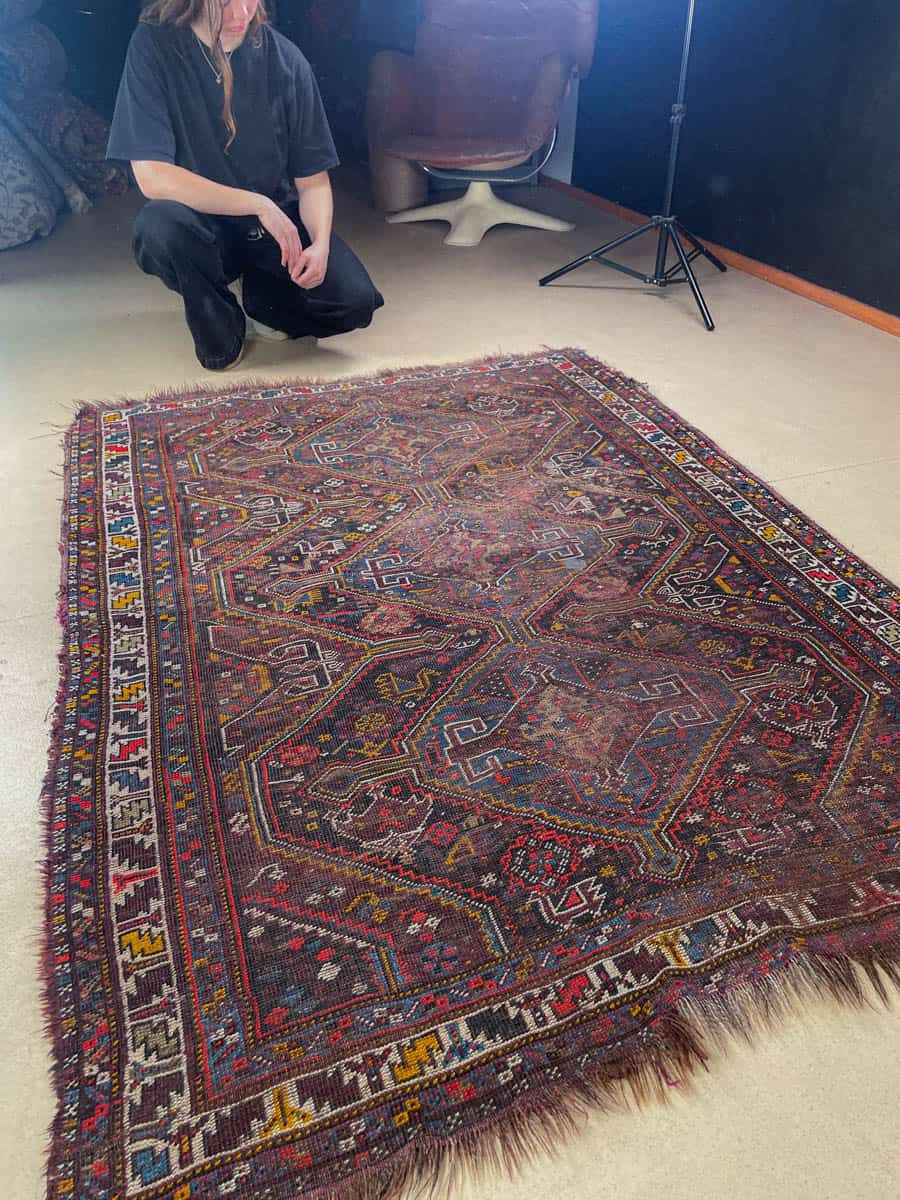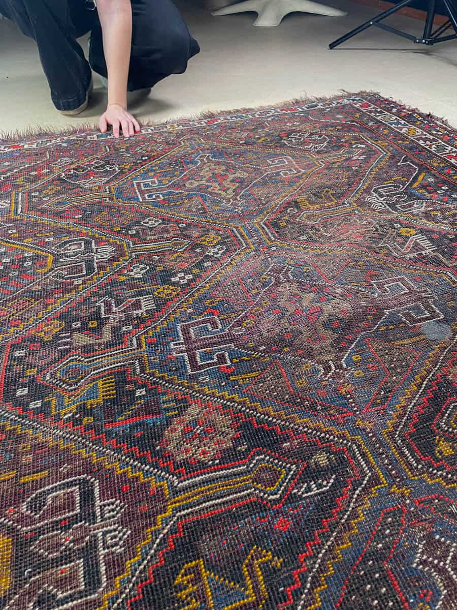 Tämä matto sijaitsee Töölön varastollamme – jos haluat tulla katsomaan sitä paikan päälle, sovithan näytön viestitse tai puhelimitse.