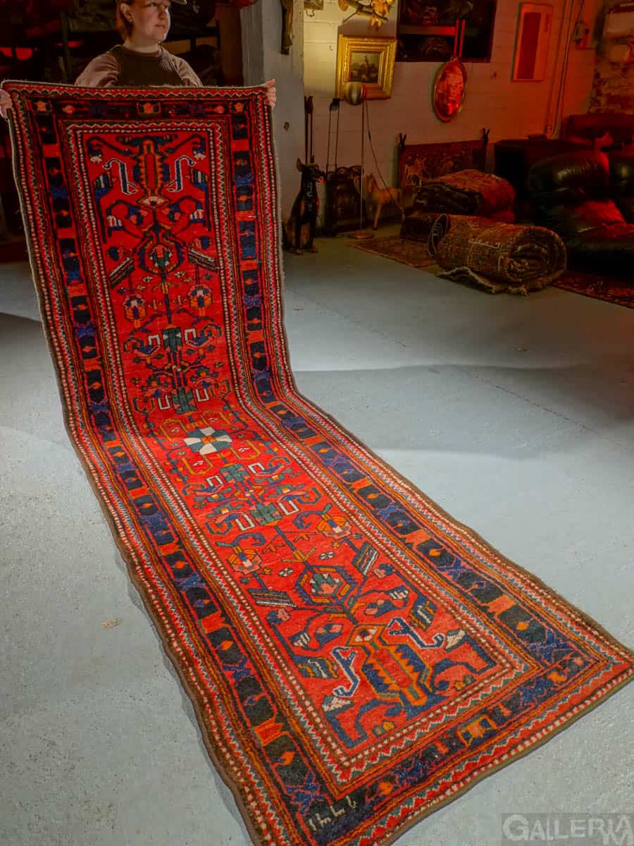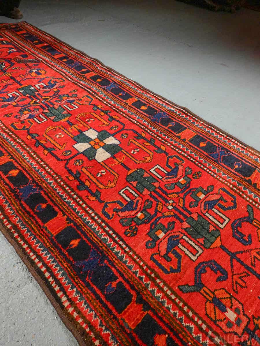 Näyttävän punainen ja huomiota herättävä Hamadan-käytävämatto  geometrisella kuvoinnilla..