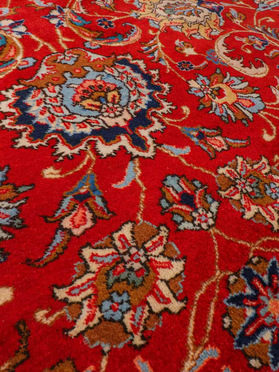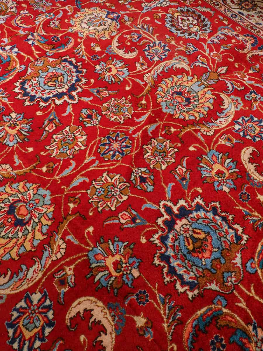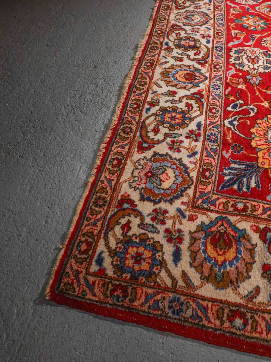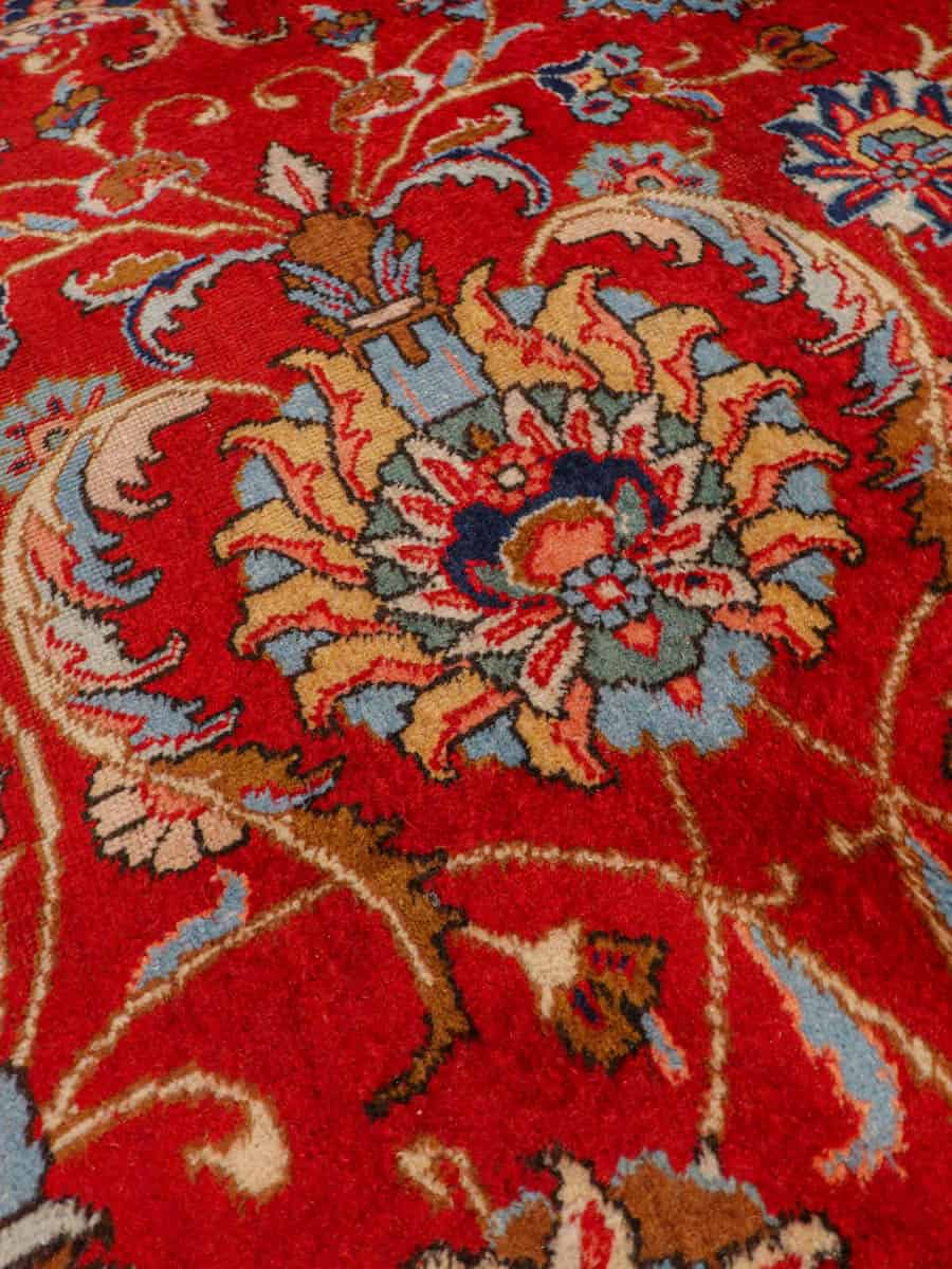 Suuri ja tyrmäävä punainen Tabriz, jossa runsaasti kauniin yksityiskohtaisia kukkakuvioita.