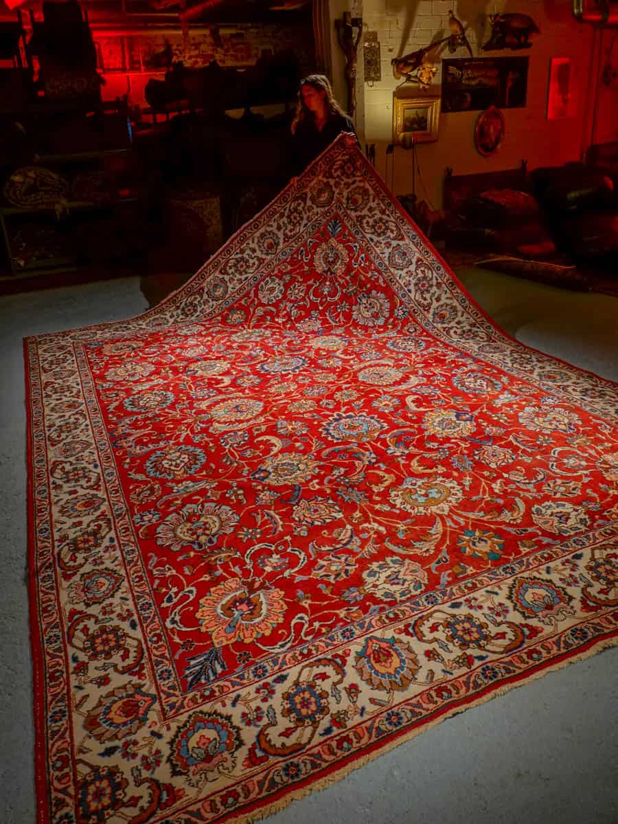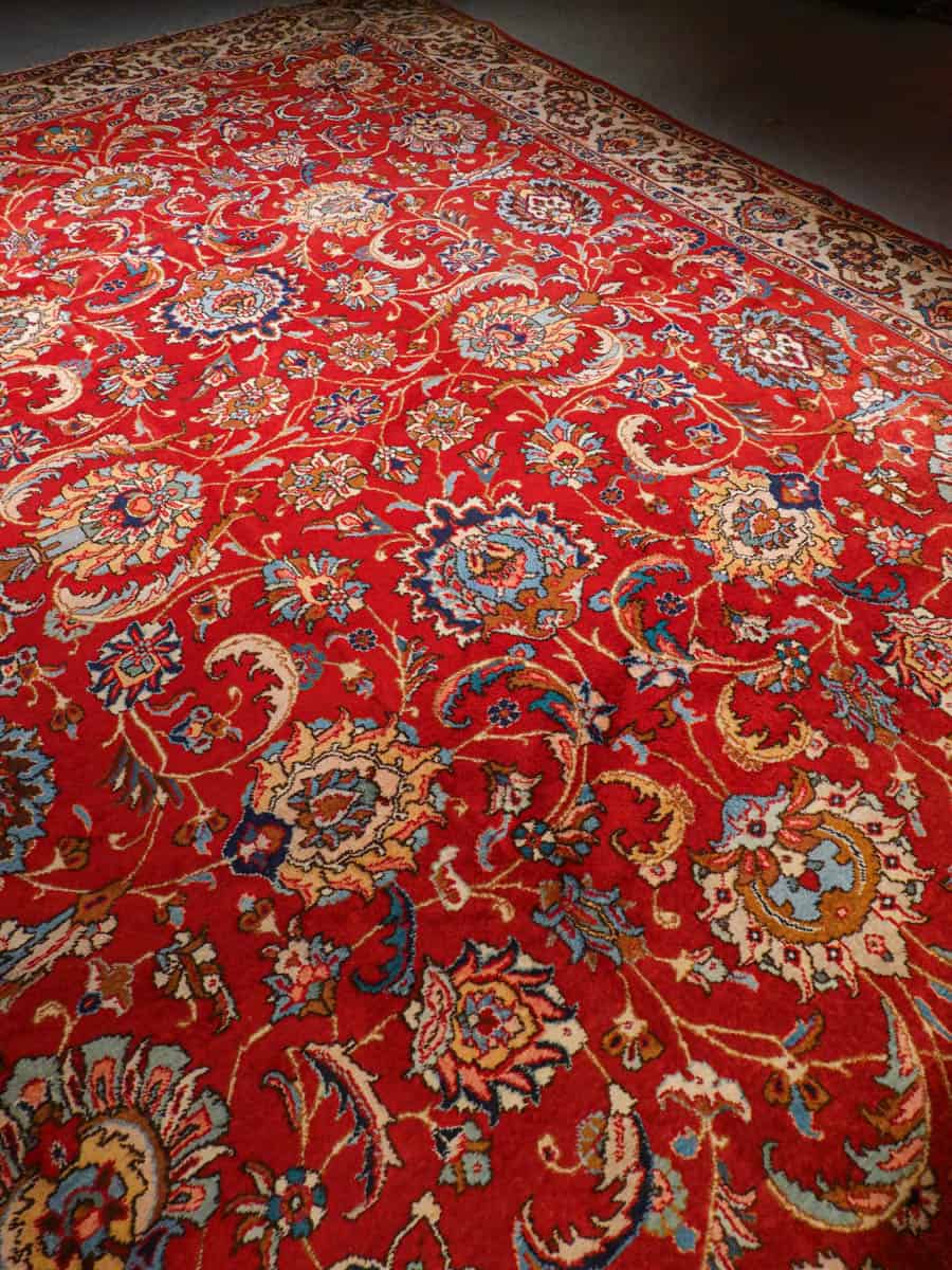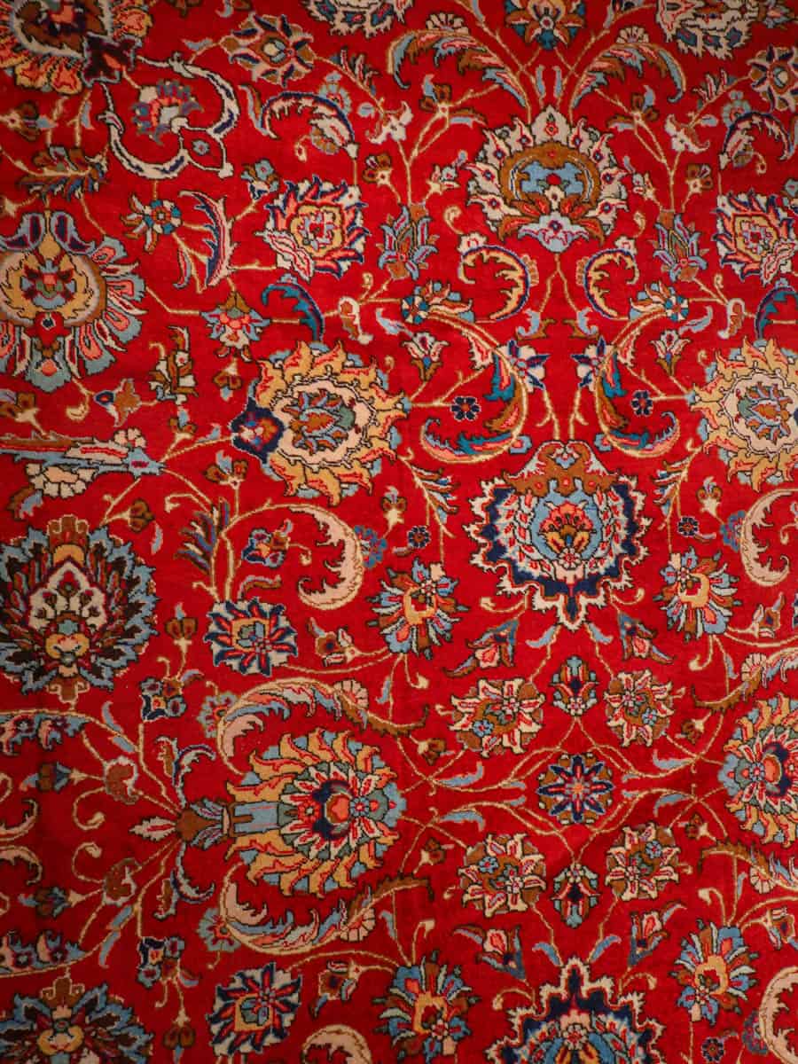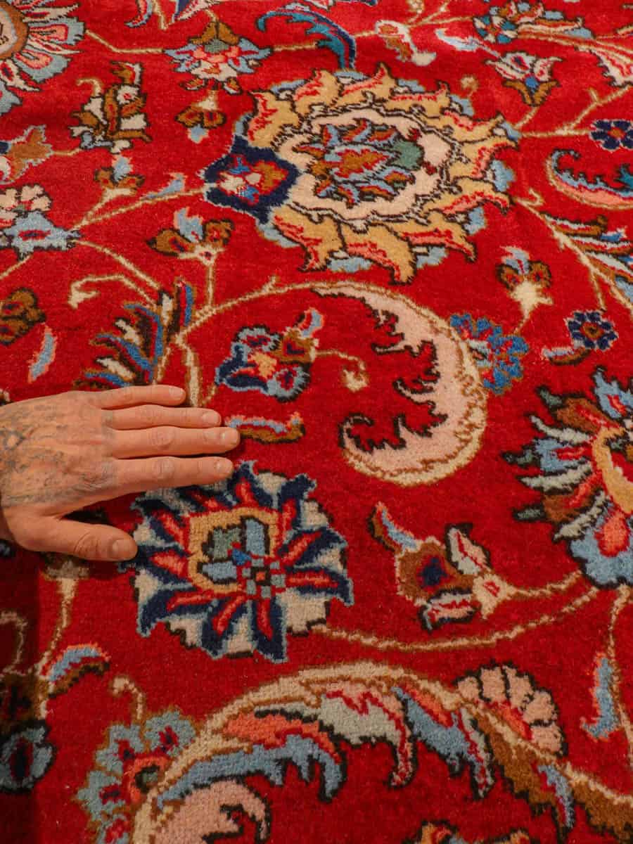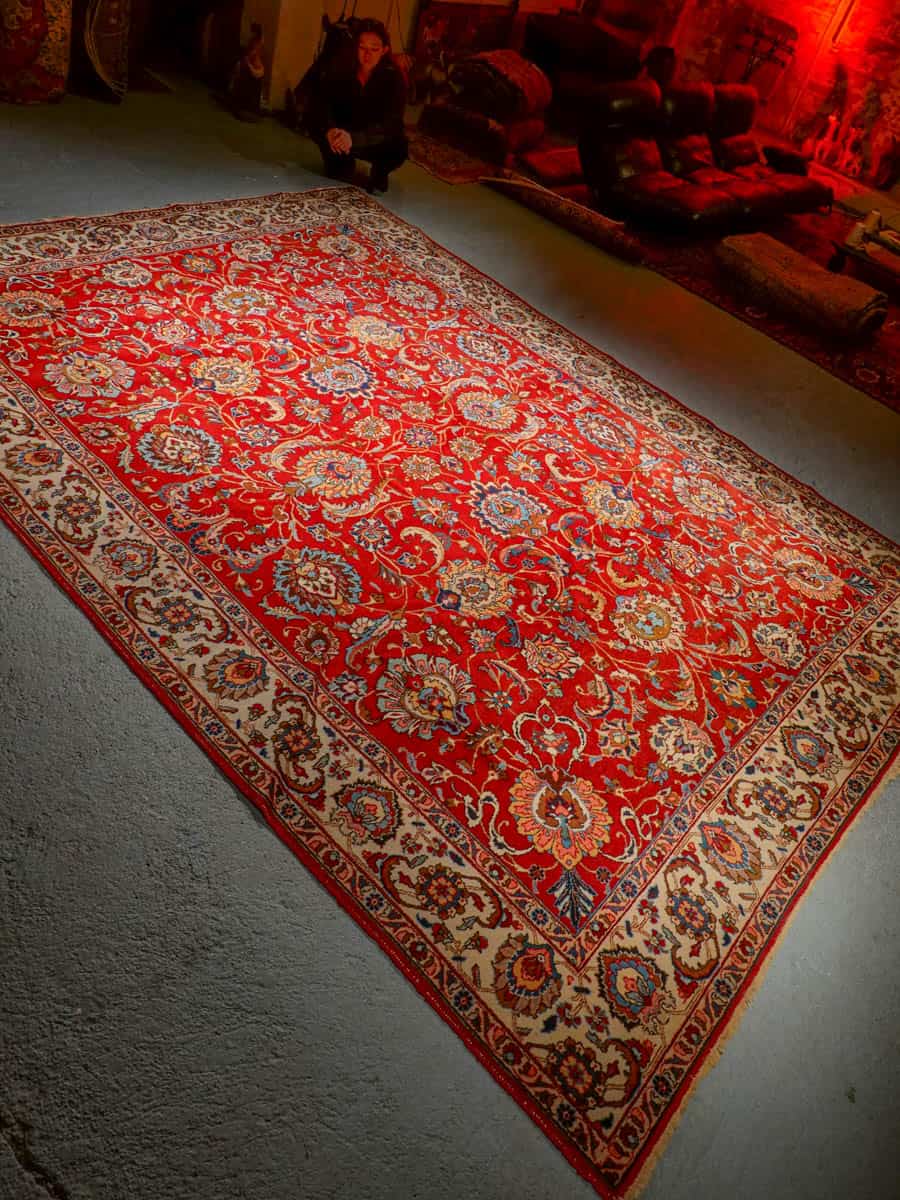 Suuri ja tyrmäävä punainen Tabriz, jossa runsaasti kauniin yksityiskohtaisia kukkakuvioita.