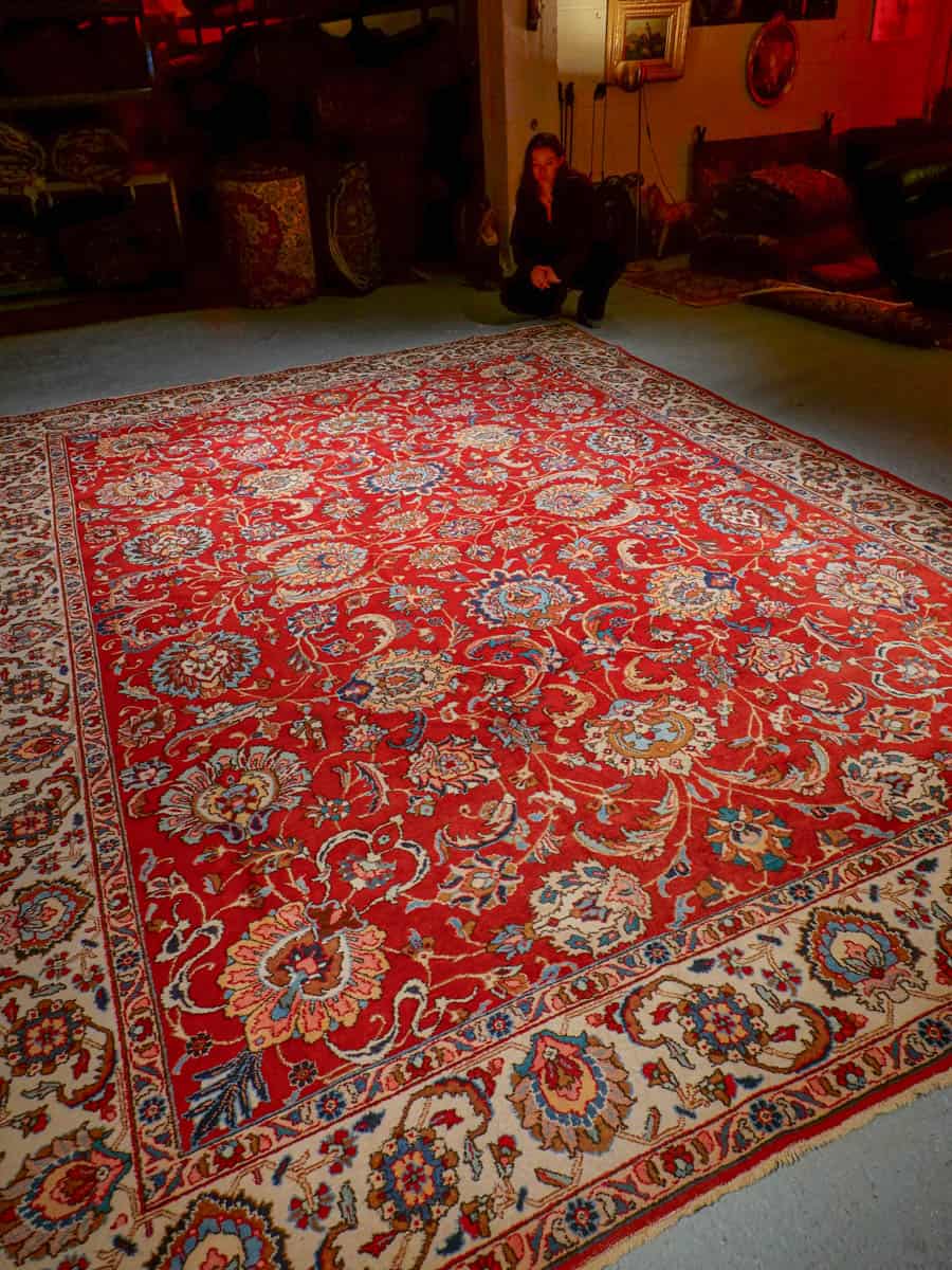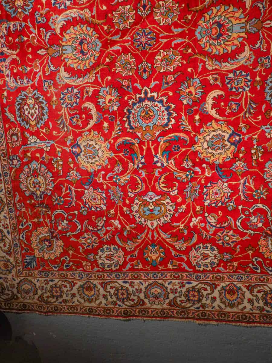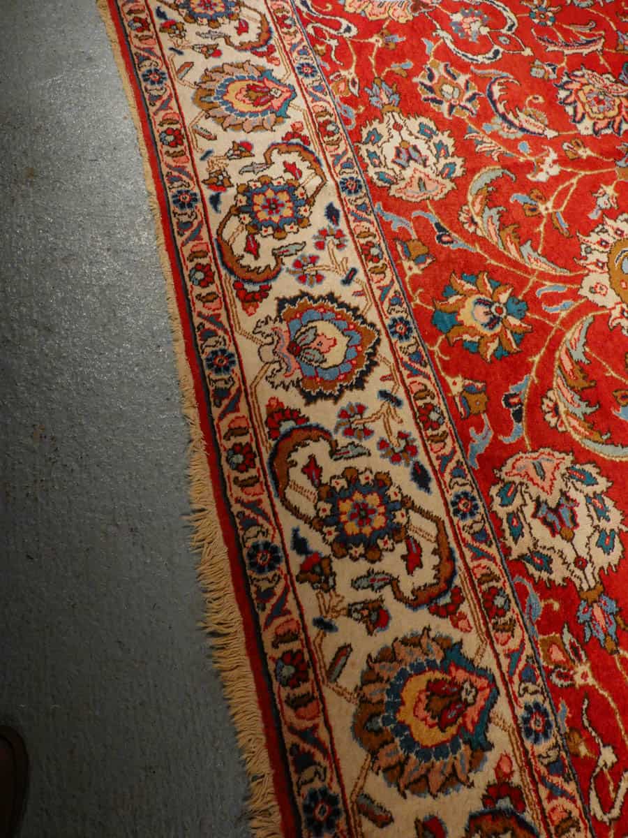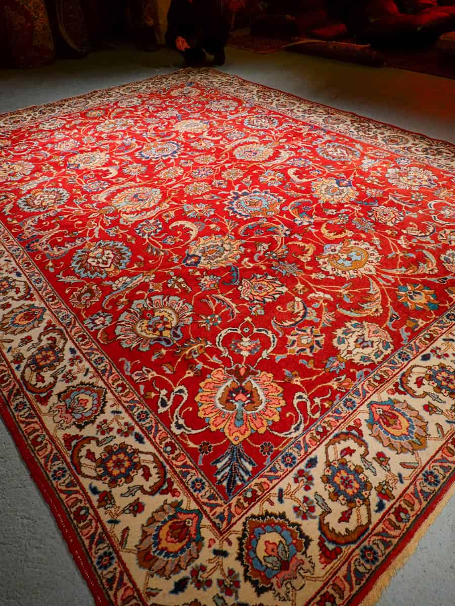 Suuri ja tyrmäävä punainen Tabriz, jossa runsaasti kauniin yksityiskohtaisia kukkakuvioita.