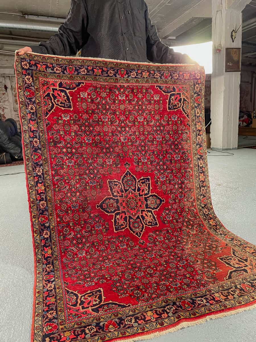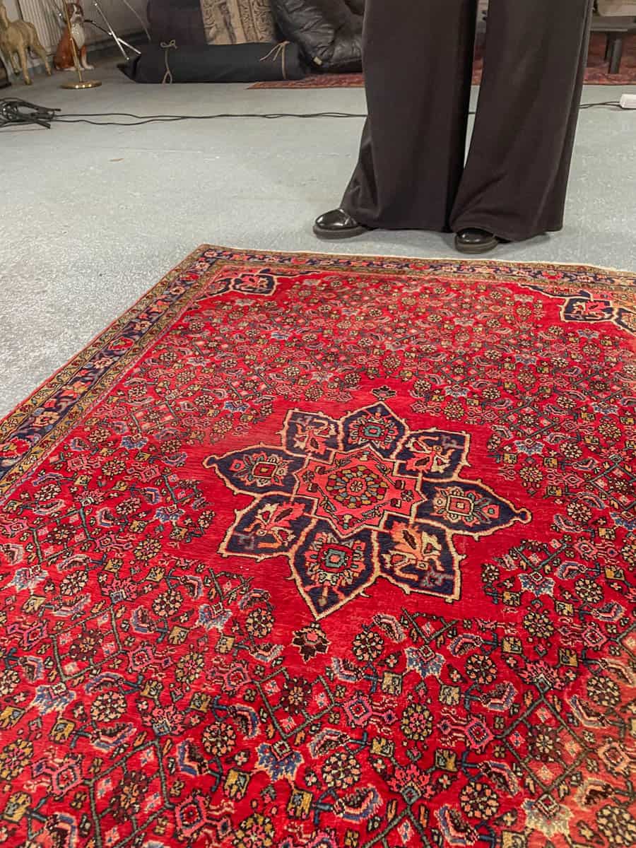 Hypnoottisen yksityiskohtainen Bijar syvän punaisella väriteemalla. Käsinsolmittu villasta.