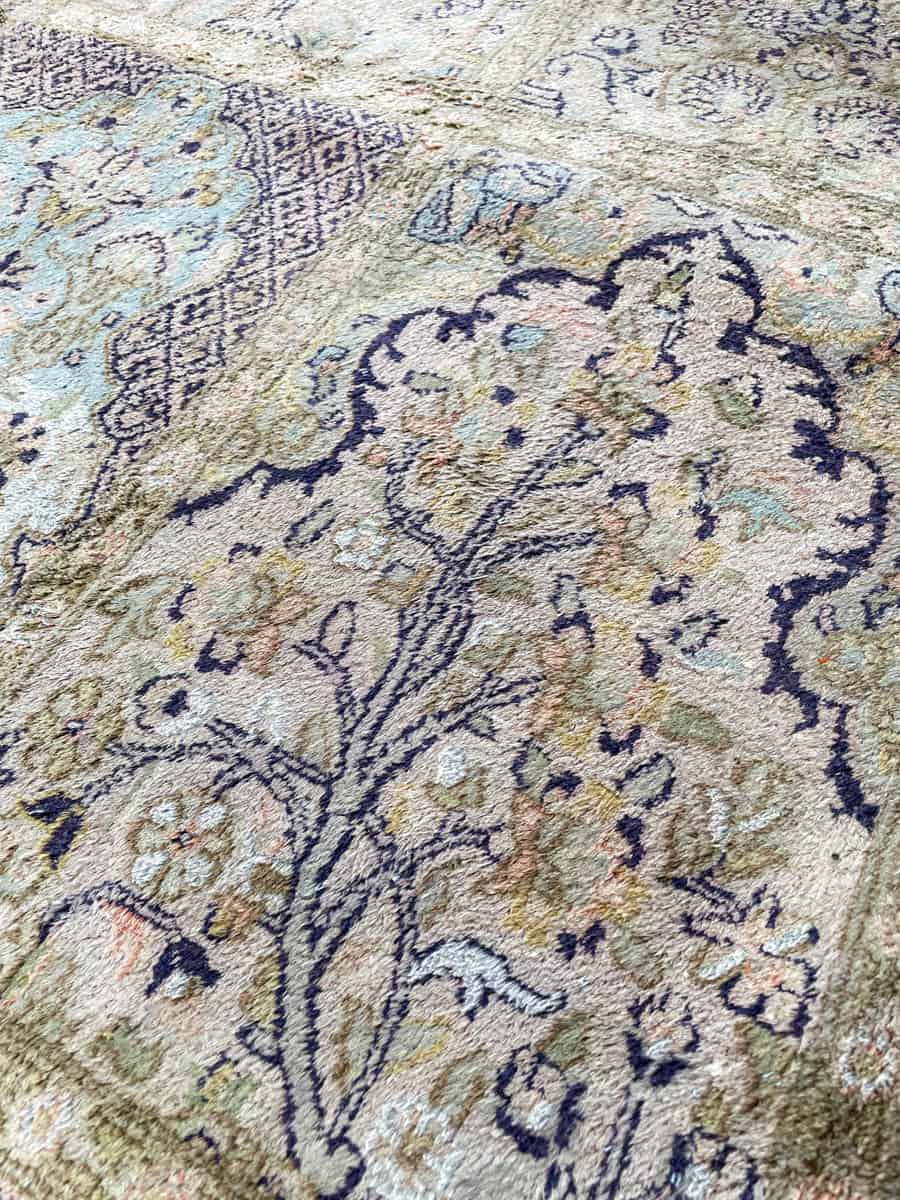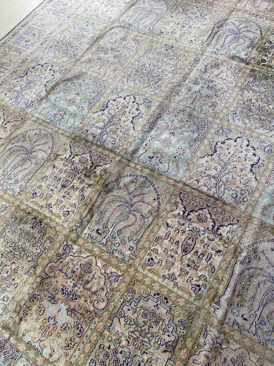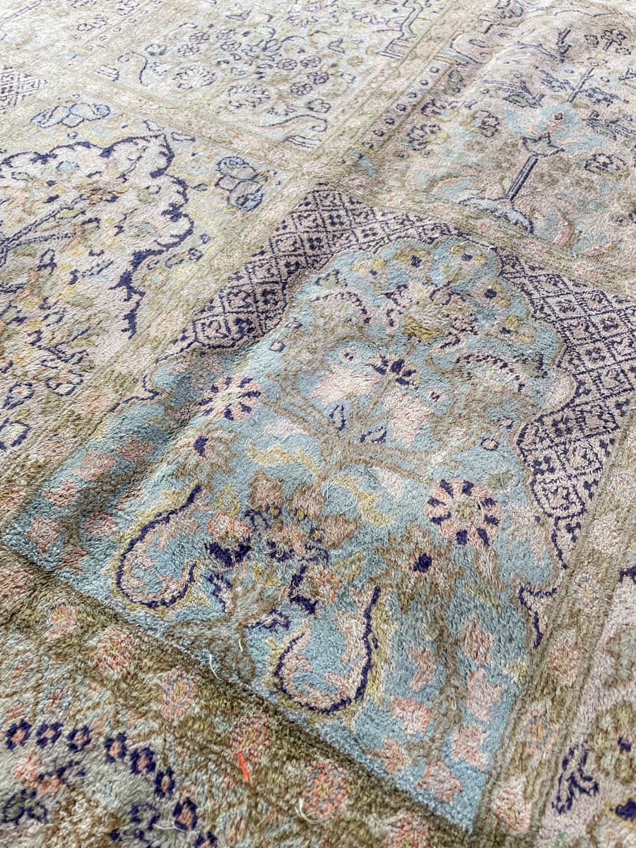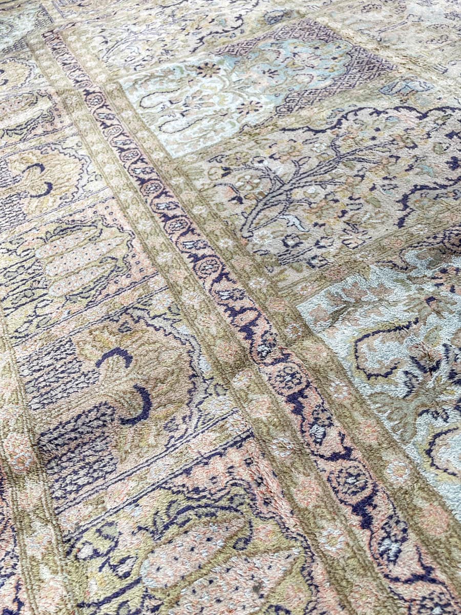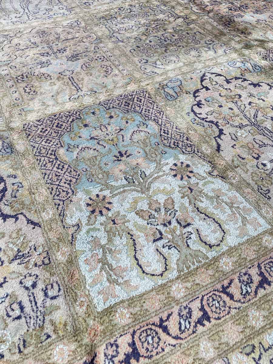 Tämä upea suuri käsinsolmittu persialainen silkkimatto hurmaa hillityllä värimaailmallaan ja perinteisellä puutarha-aiheisilla khesti -kuvioinneilla. Sävymaailma on pehmeän pastellinen: hiekan, haalean vihreän ja vaalean violetin yhdistelmä luo mattoon elegantin ja arvokkaan ilmeen. Käsinsolmittu silkistä puuvillaloimelle.