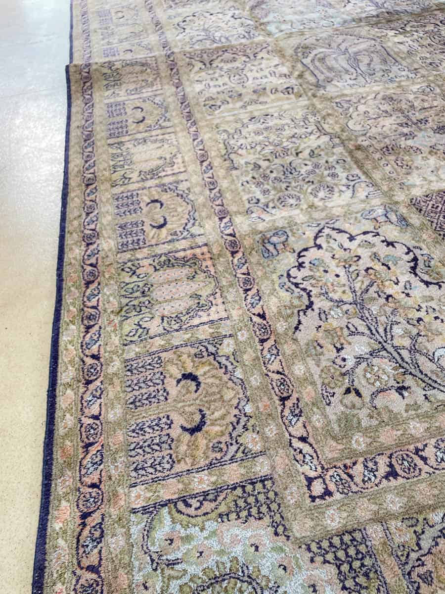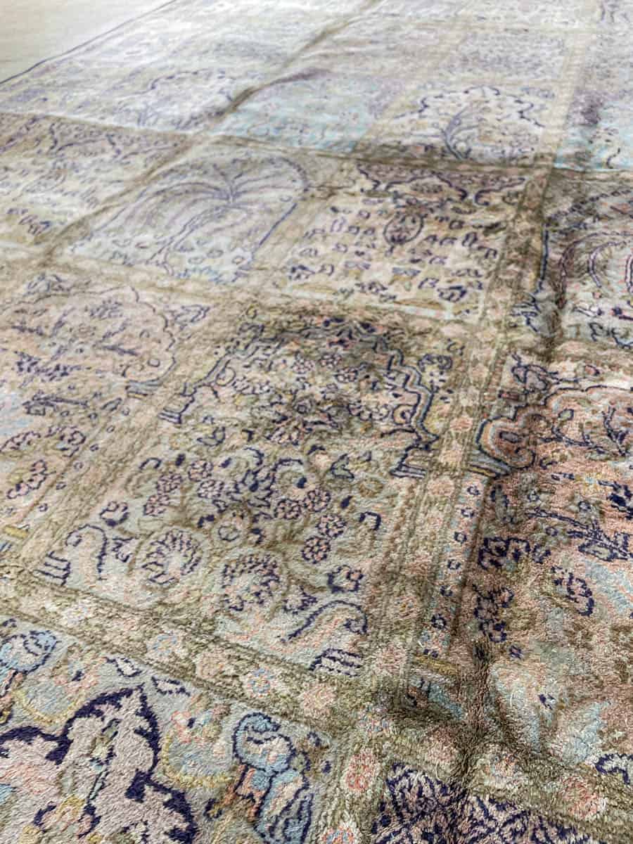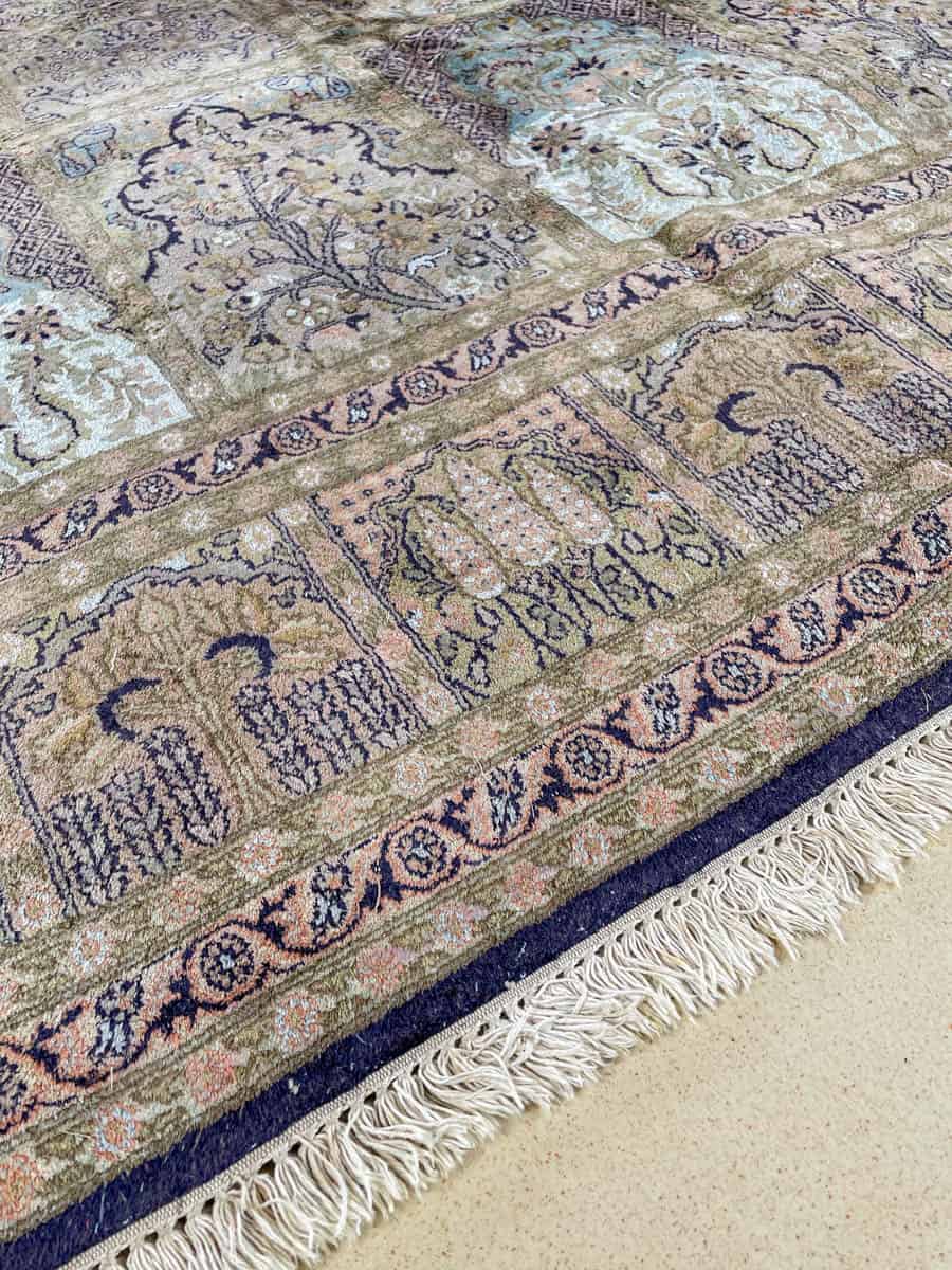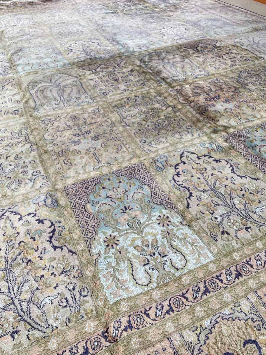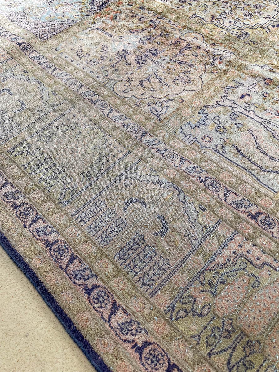 Tämä upea suuri käsinsolmittu persialainen silkkimatto hurmaa hillityllä värimaailmallaan ja perinteisellä puutarha-aiheisilla khesti -kuvioinneilla. Sävymaailma on pehmeän pastellinen: hiekan, haalean vihreän ja vaalean violetin yhdistelmä luo mattoon elegantin ja arvokkaan ilmeen. Käsinsolmittu silkistä puuvillaloimelle.
