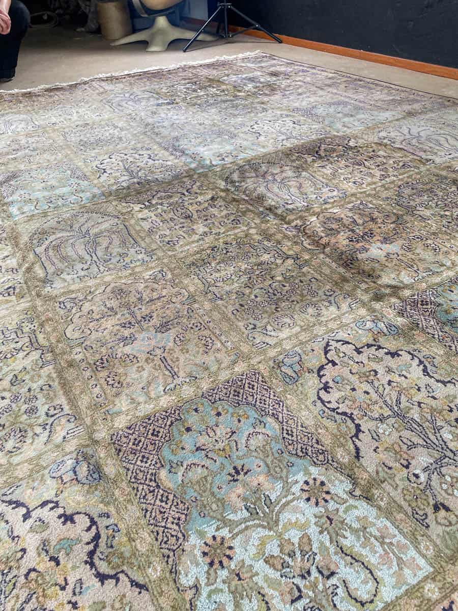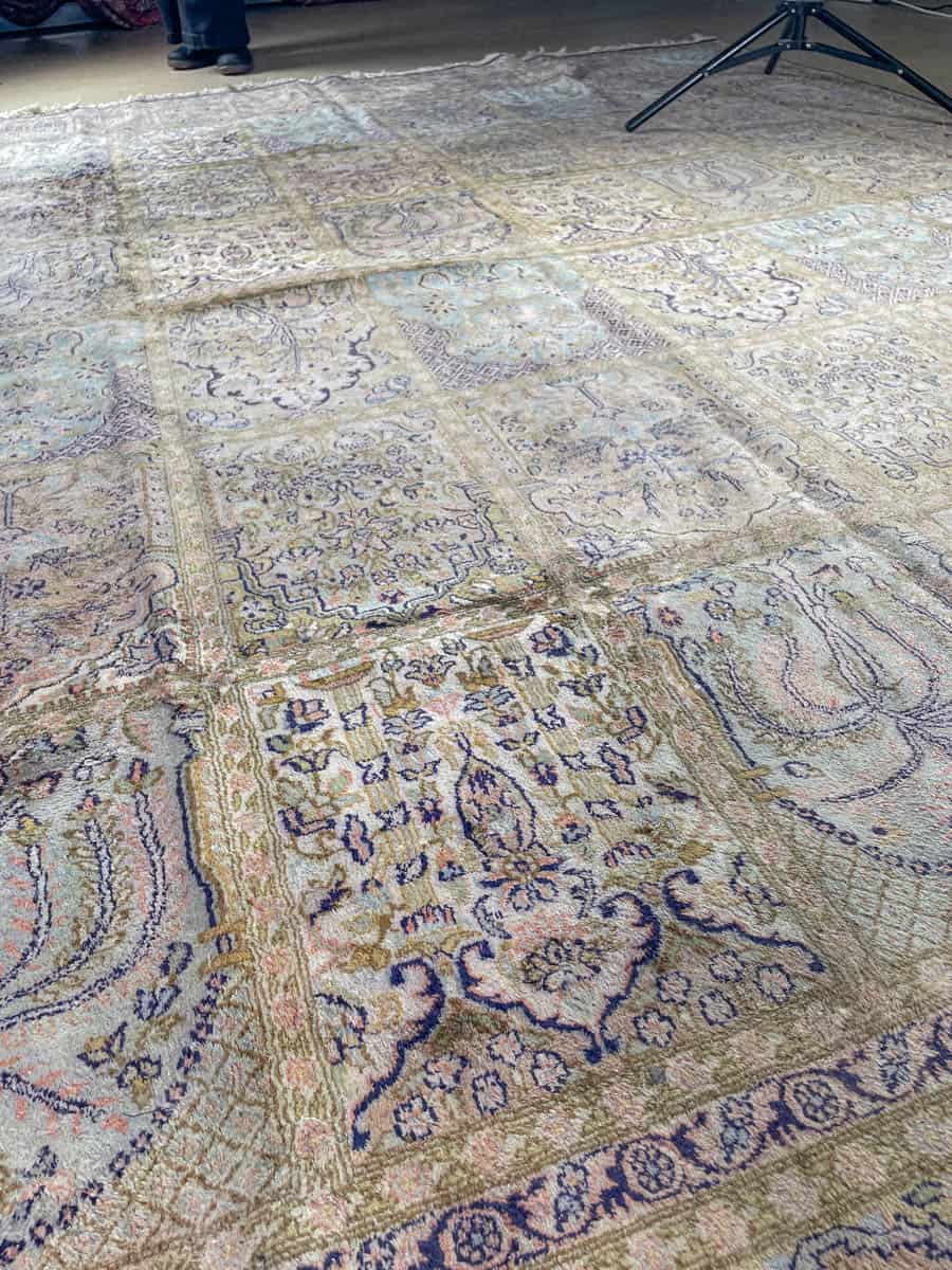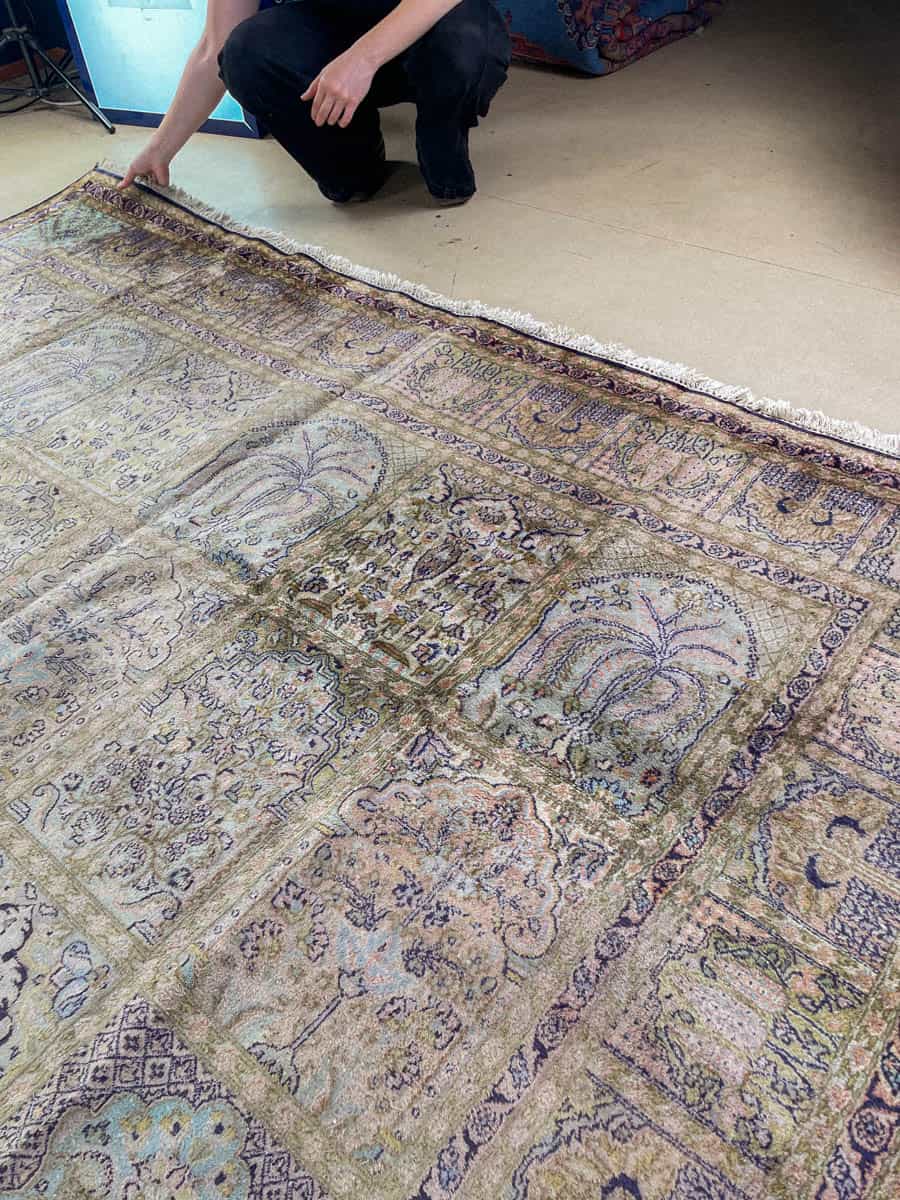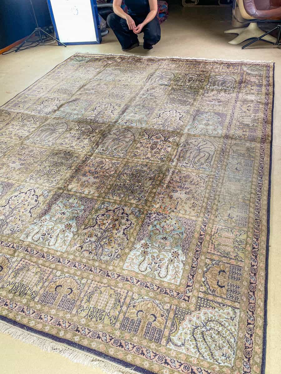 Tämä matto sijaitsee Töölön varastollamme – jos haluat tulla katsomaan sitä paikan päälle, sovithan näytön viestitse tai puhelimitse.