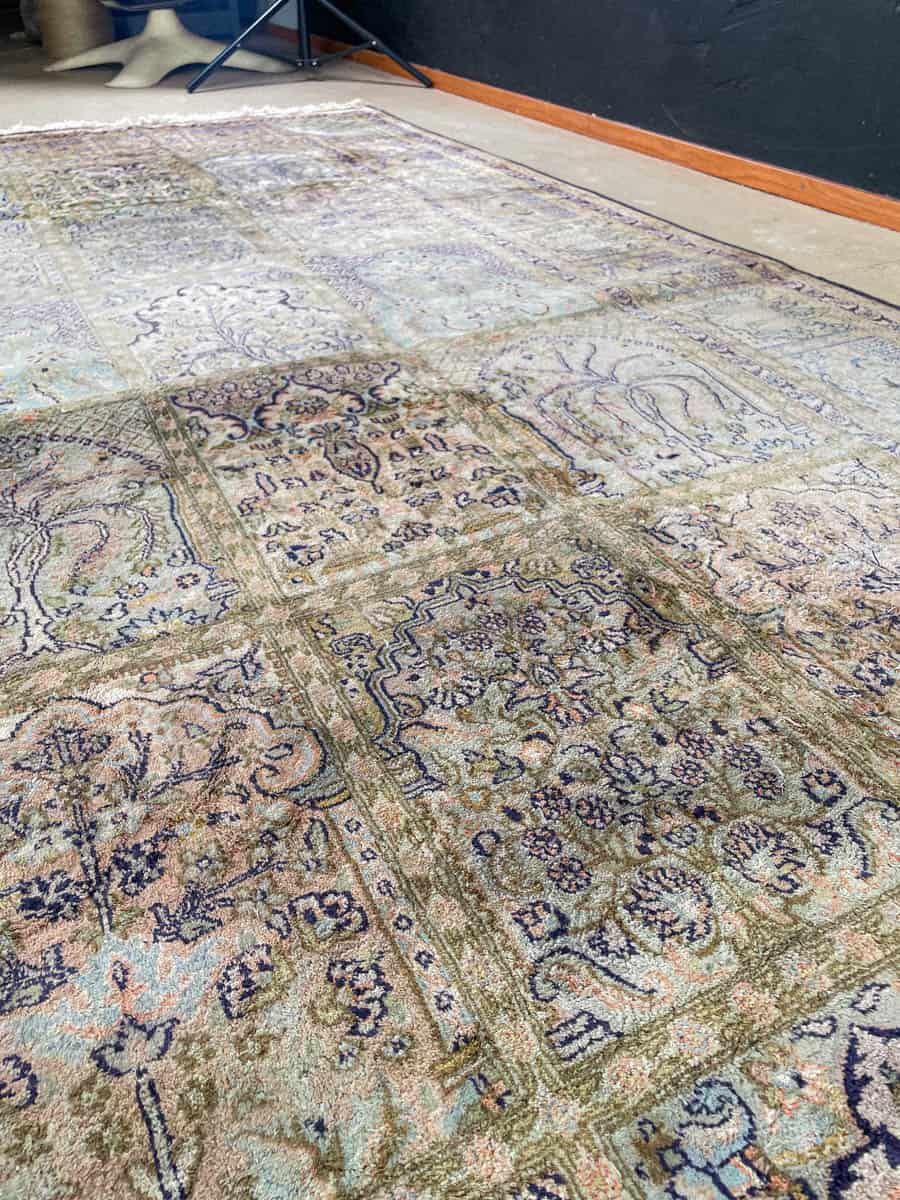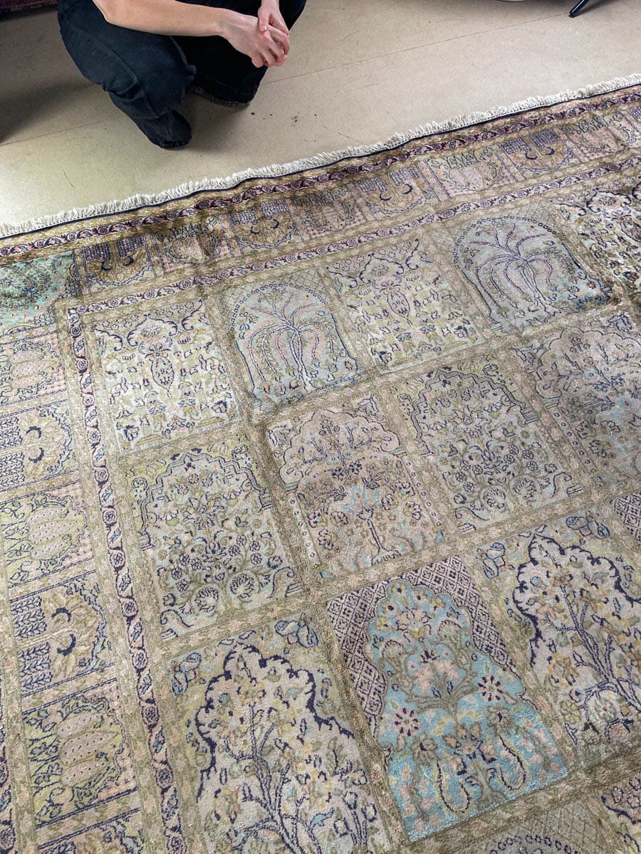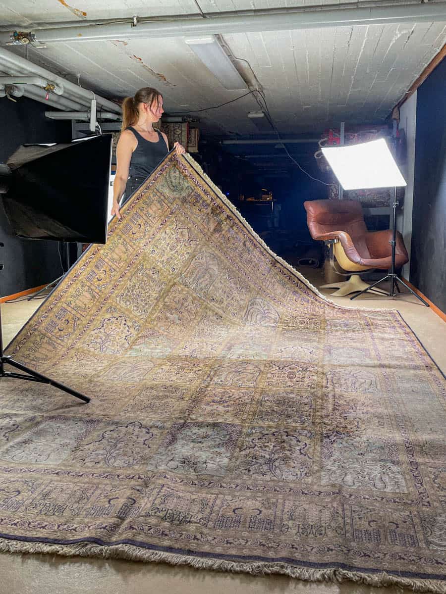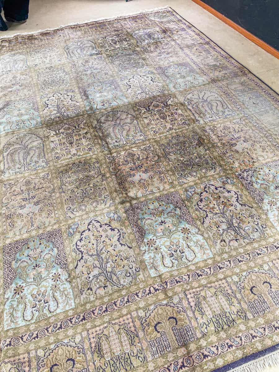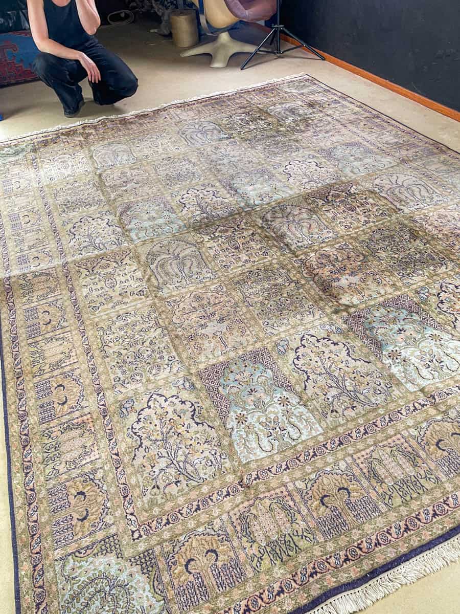 Tämä matto sijaitsee Töölön varastollamme – jos haluat tulla katsomaan sitä paikan päälle, sovithan näytön viestitse tai puhelimitse.