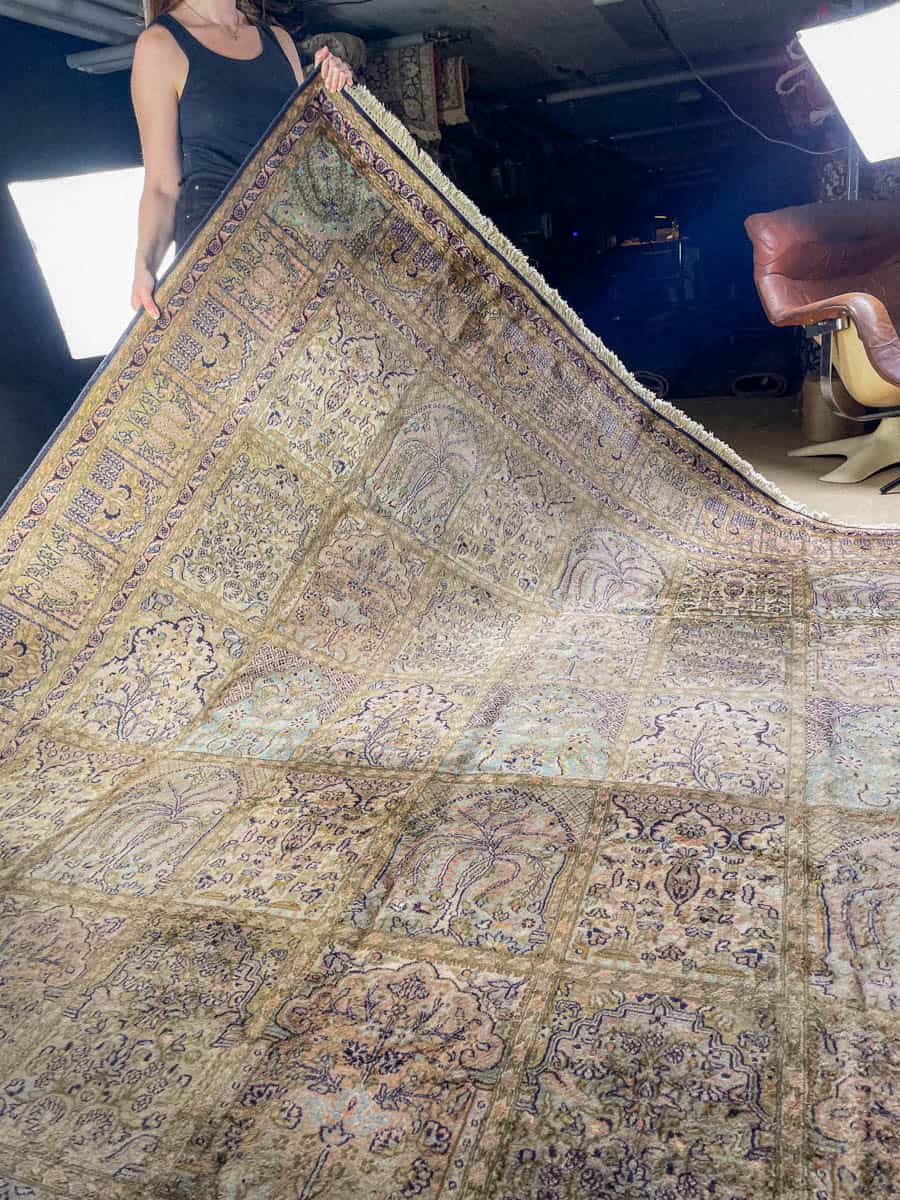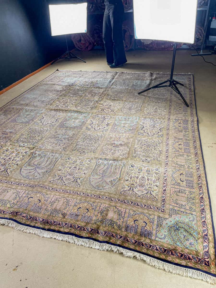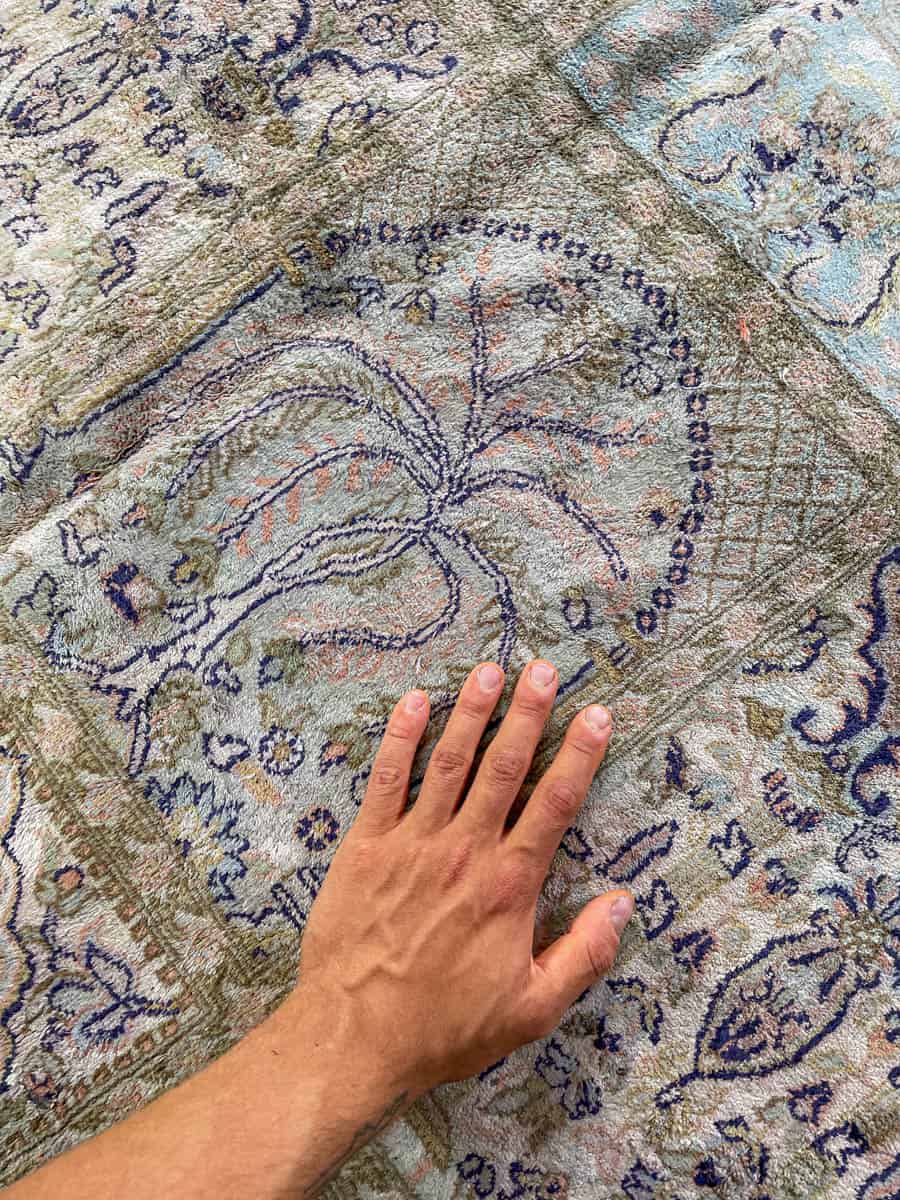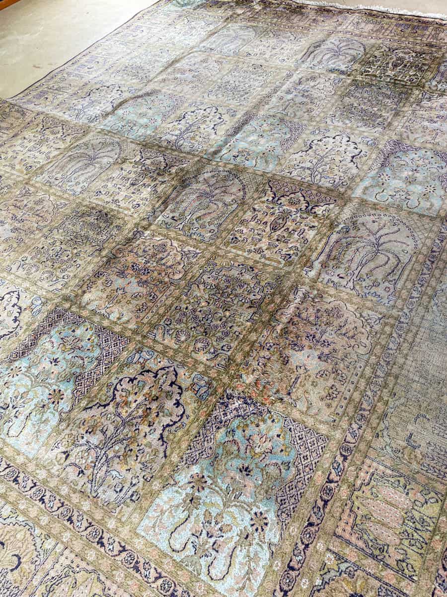 Tämä matto sijaitsee Töölön varastollamme – jos haluat tulla katsomaan sitä paikan päälle, sovithan näytön viestitse tai puhelimitse.