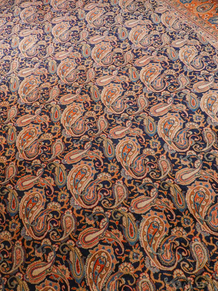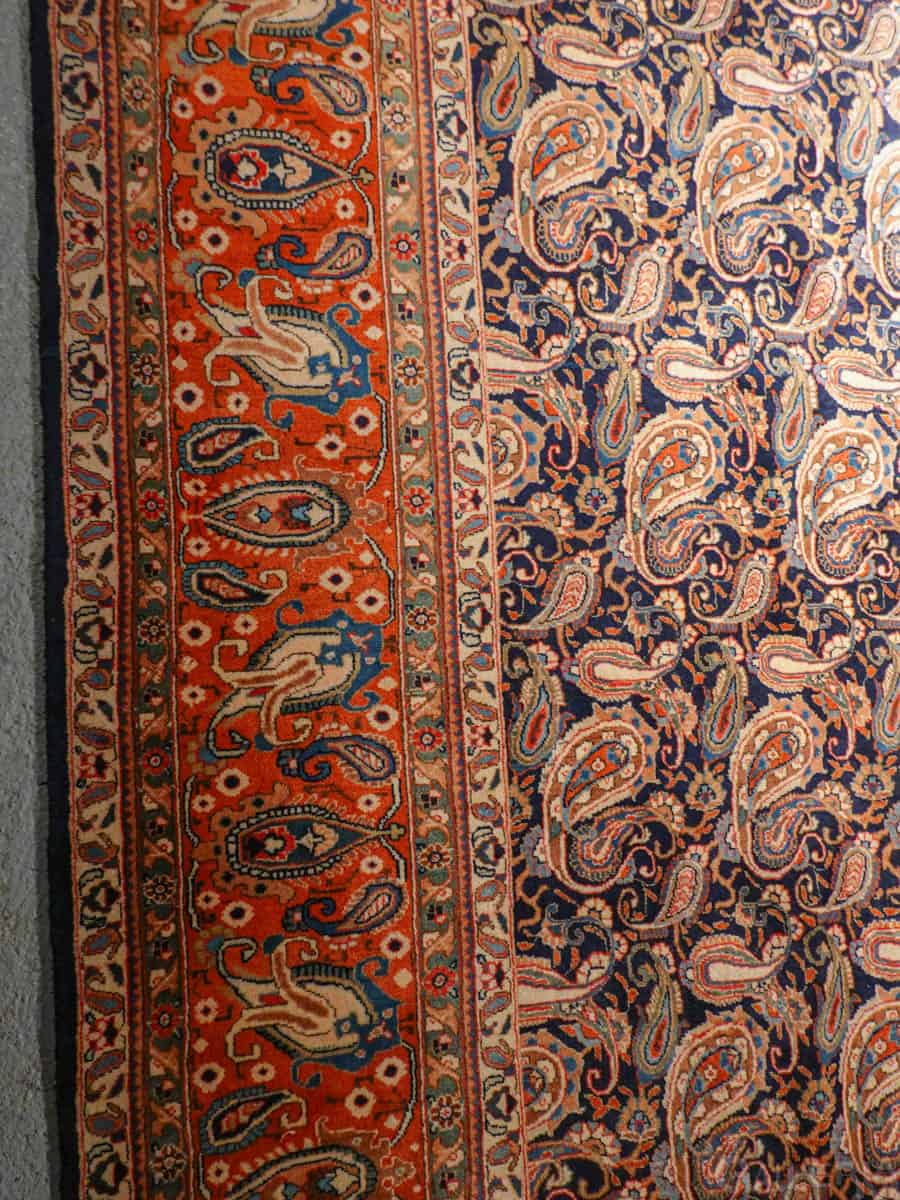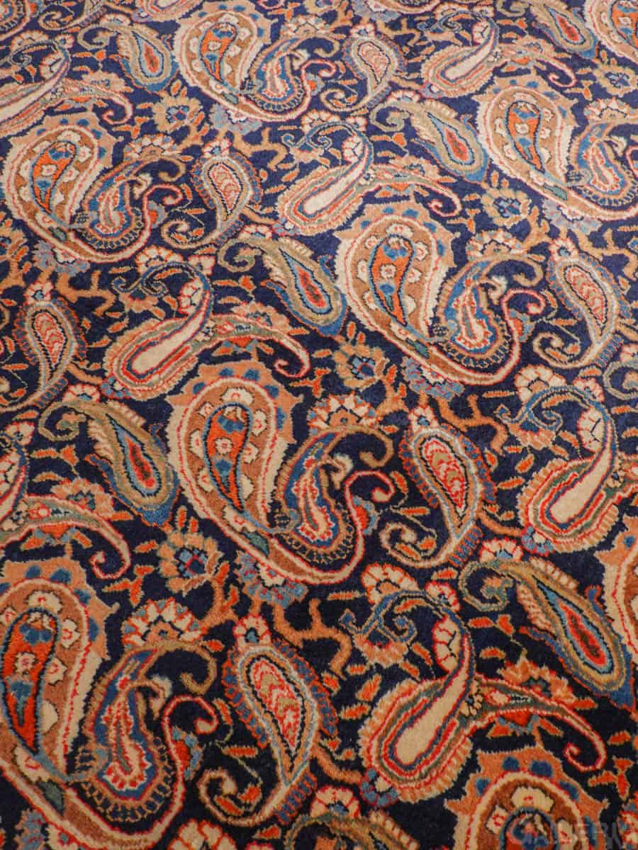 Juhlallisen koristeellinen vaalea Kashmar uskomattoman yksityiskohtaisella kuvioinnilla. Tummansinisellä pohjalla tanssii runsasyksityiskohtaiset Boteh-motiivit.