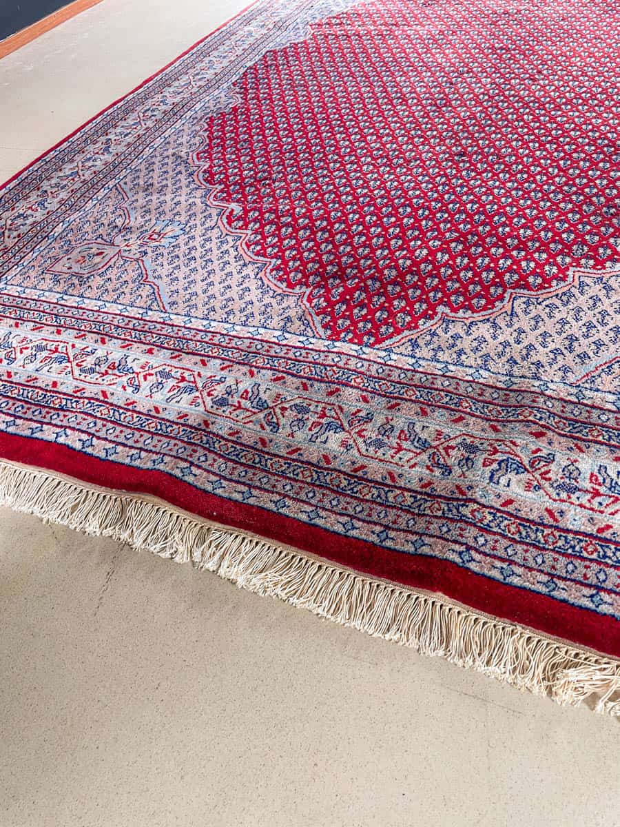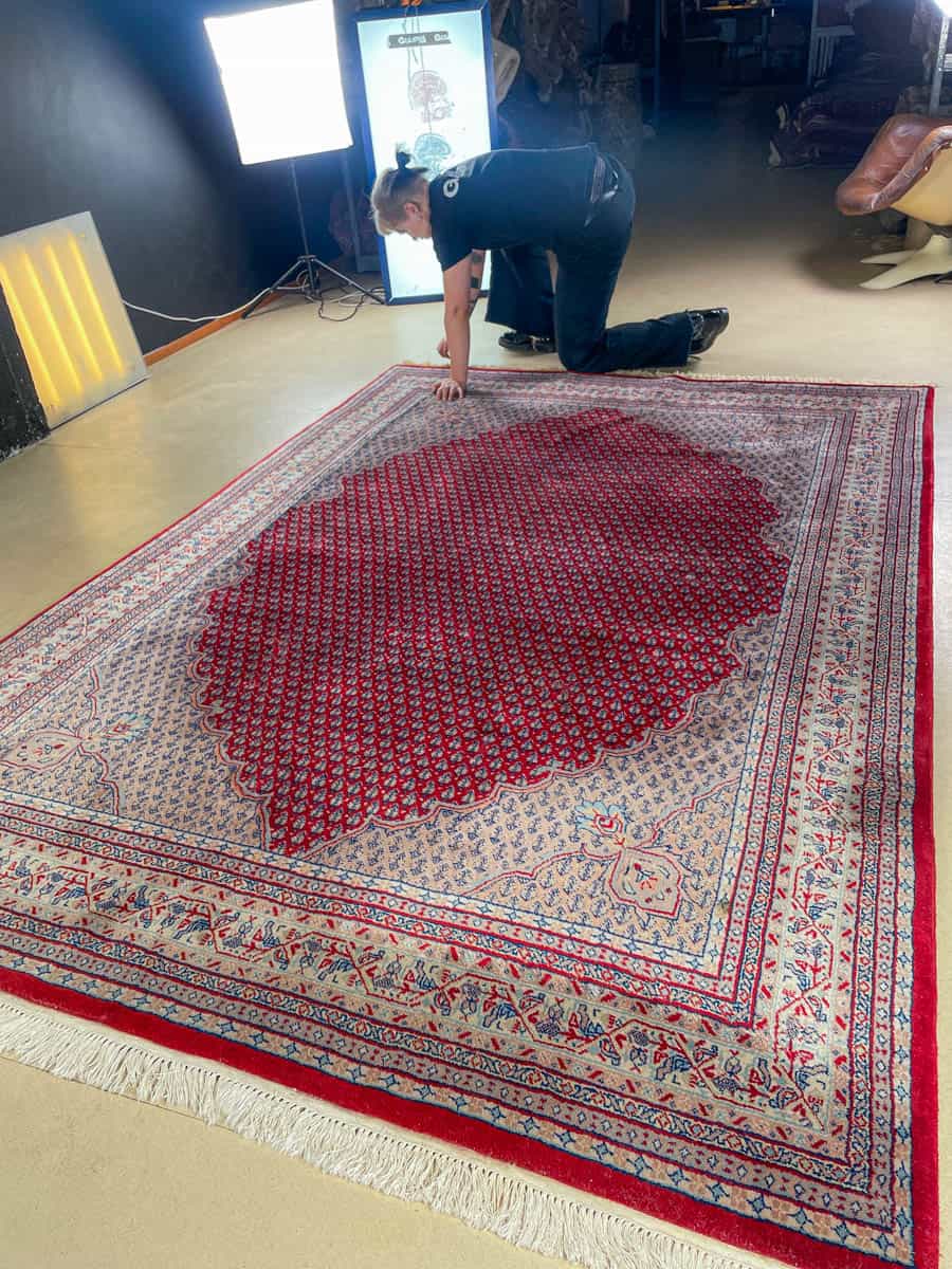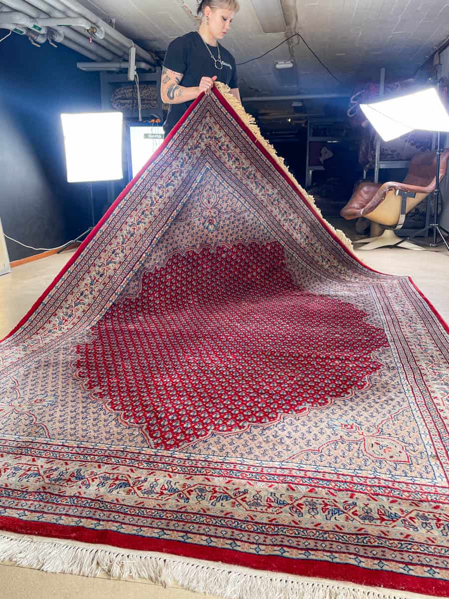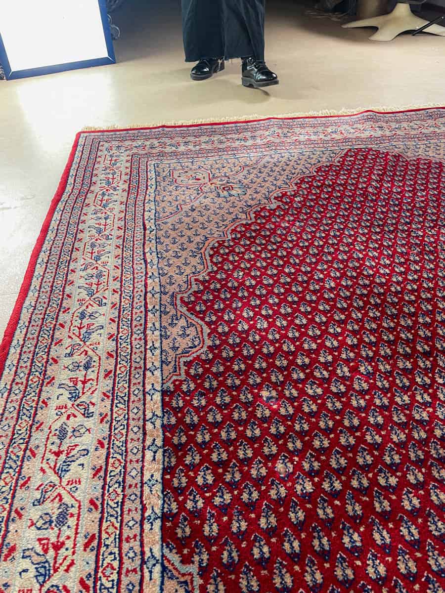 Tämä matto sijaitsee Töölön varastollamme – jos haluat tulla katsomaan sitä paikan päälle, sovithan näytön viestitse tai puhelimitse.