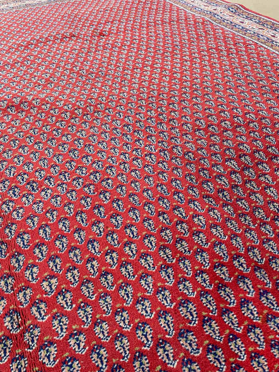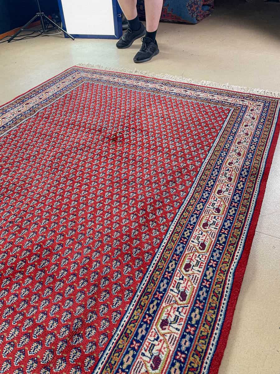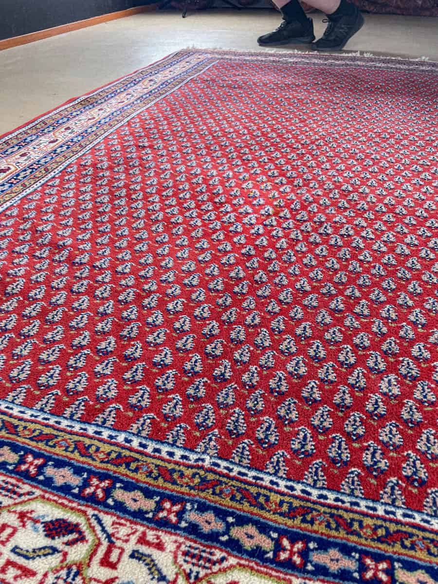 Tämä matto sijaitsee Töölön varastollamme – jos haluat tulla katsomaan sitä paikan päälle, sovithan näytön viestitse tai puhelimitse.