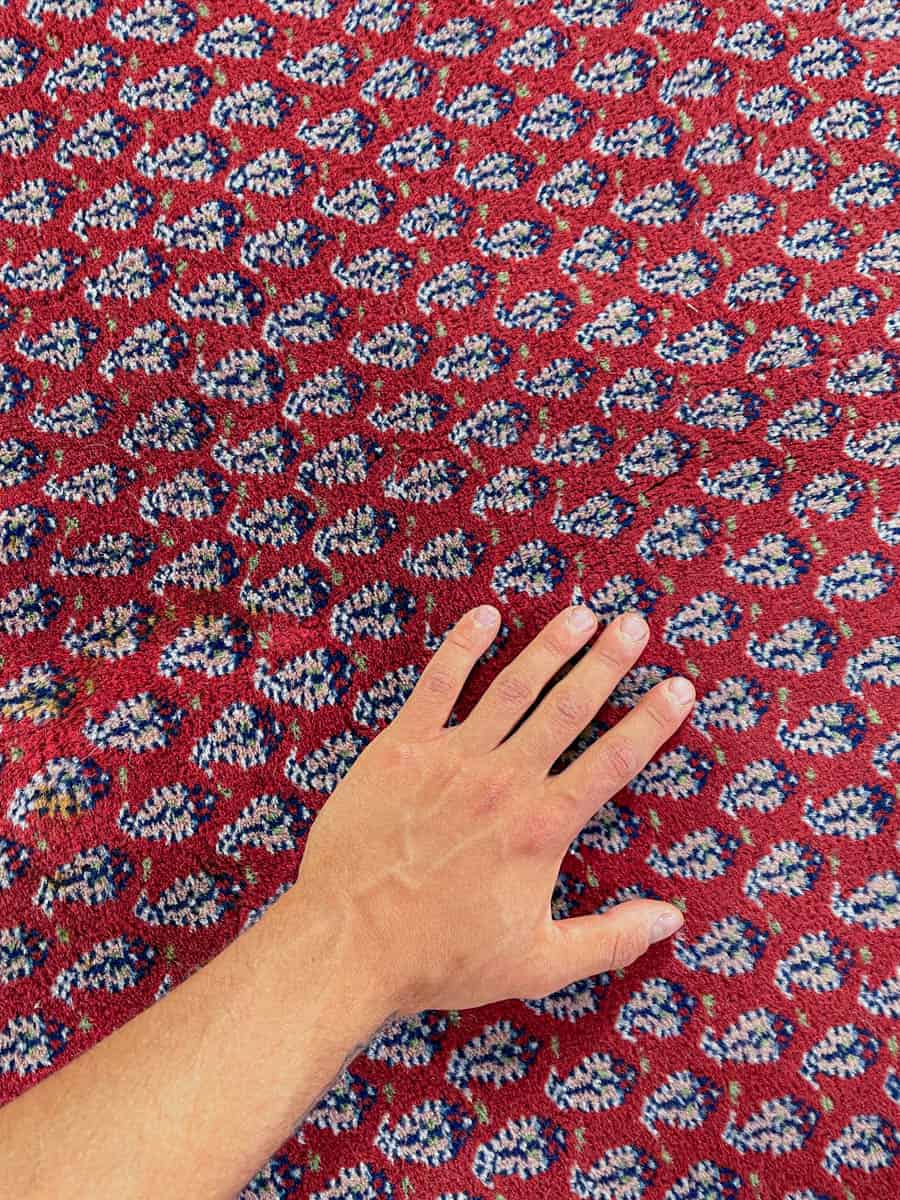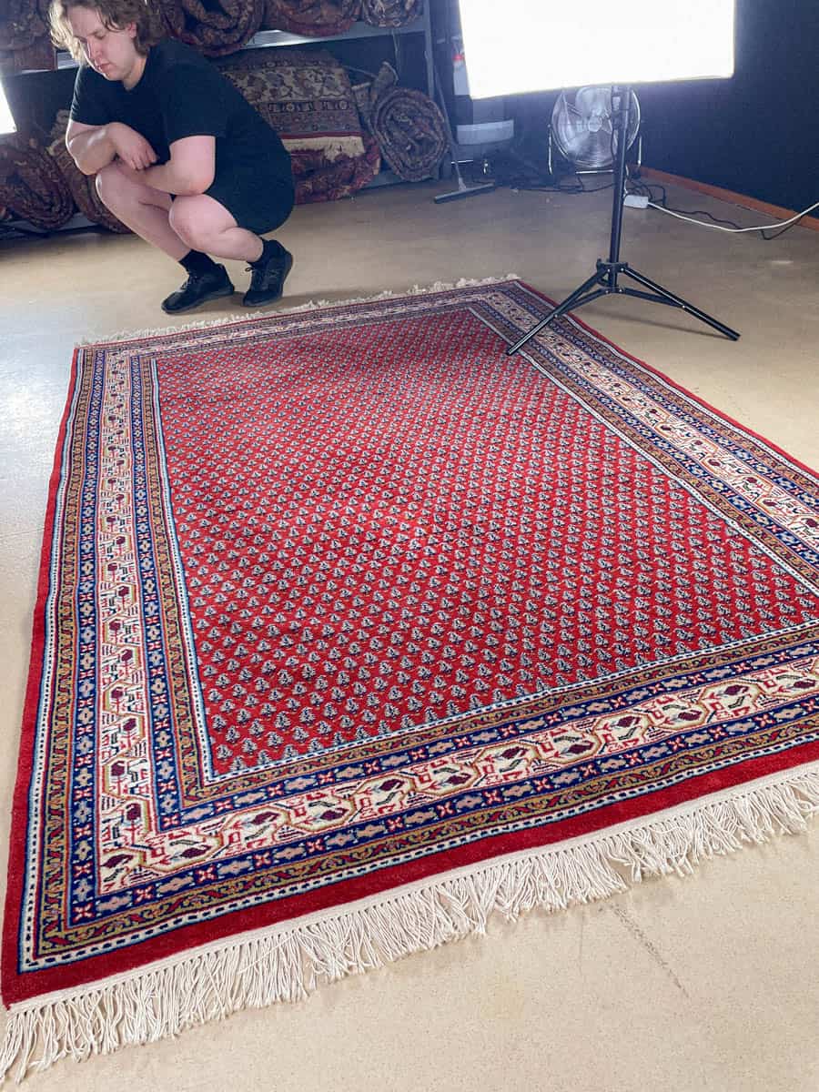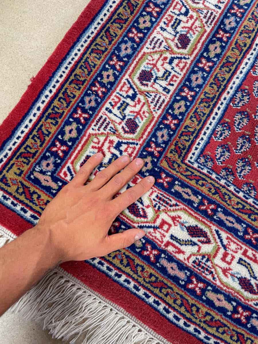 Tämä matto sijaitsee Töölön varastollamme – jos haluat tulla katsomaan sitä paikan päälle, sovithan näytön viestitse tai puhelimitse.