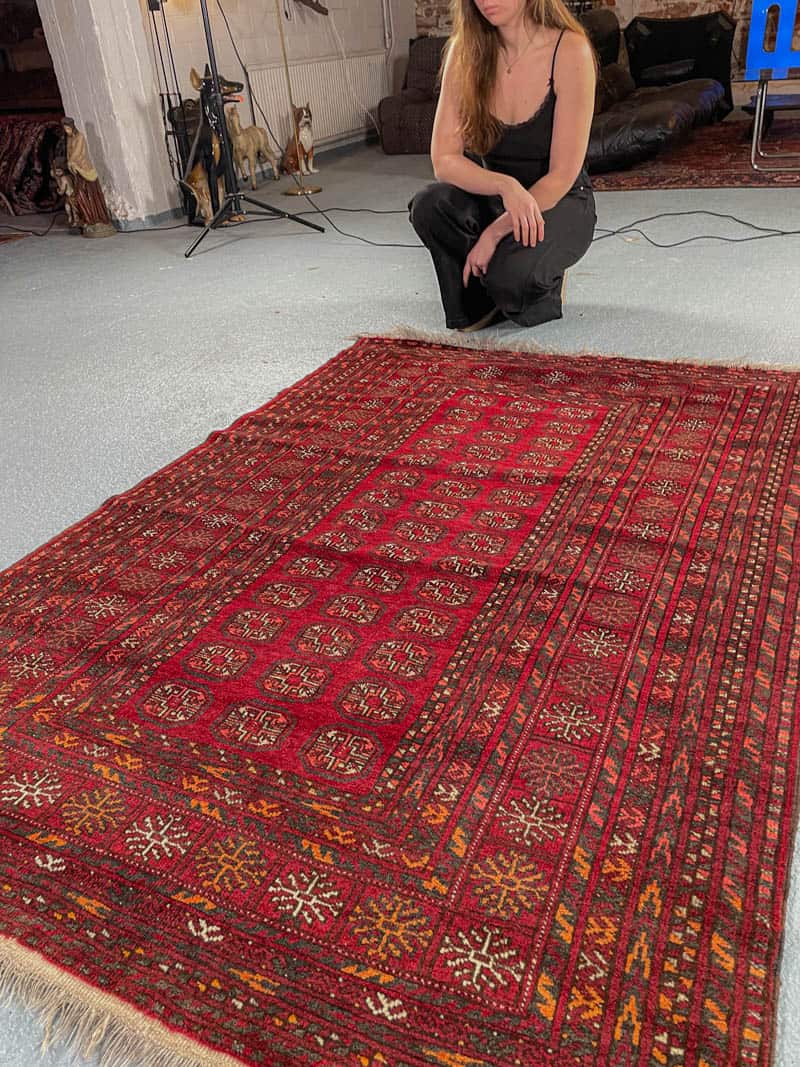 Perinteinen persialainen Buhara punaisella väriteemalla ja geometrisellä kuvioinnilla. Käsinsolmittu villasta.