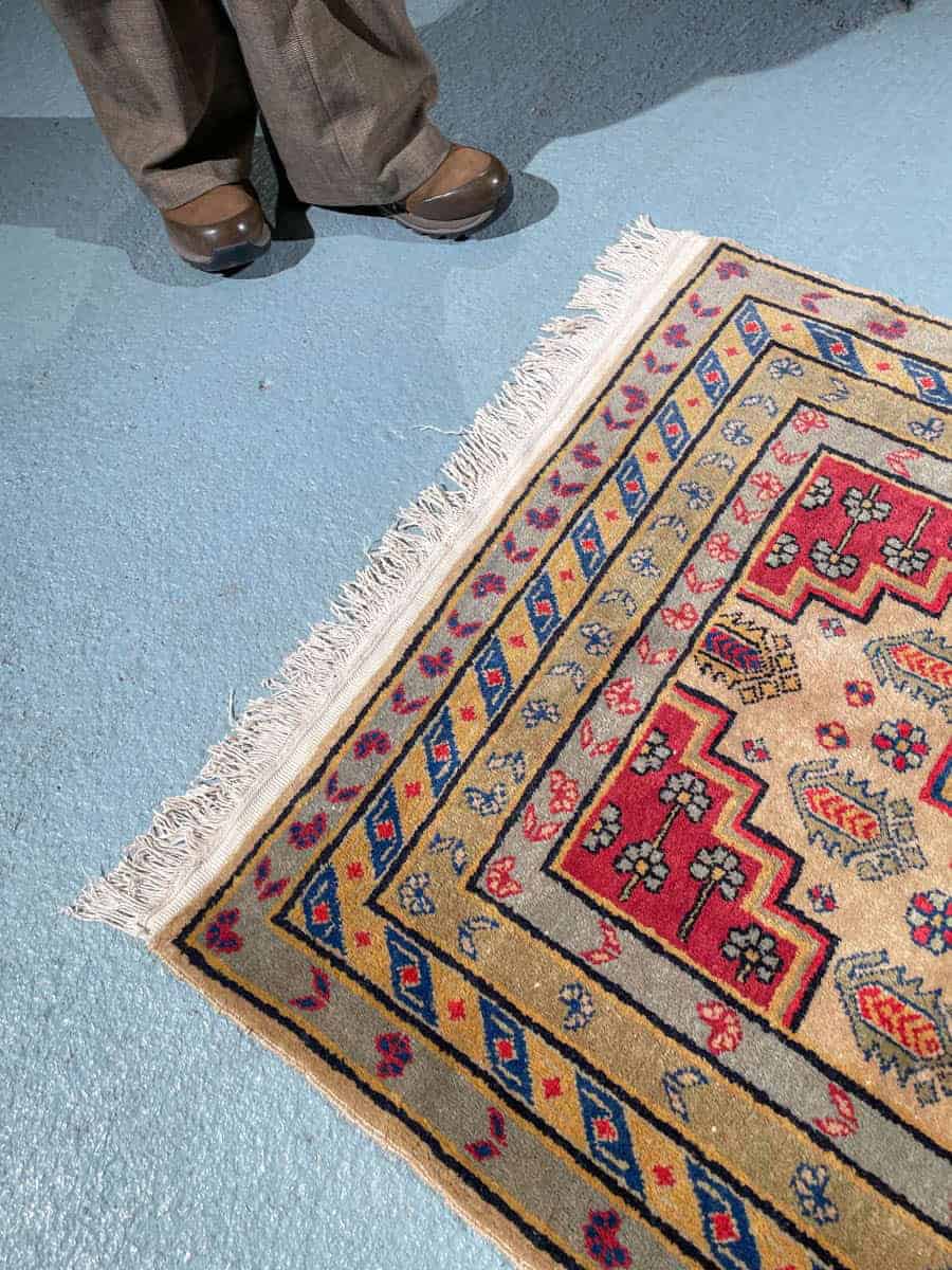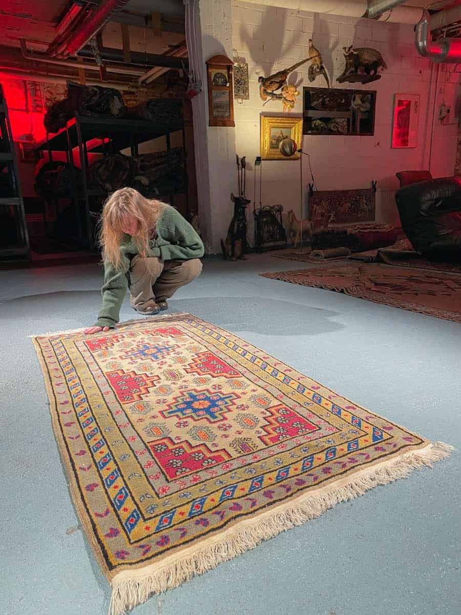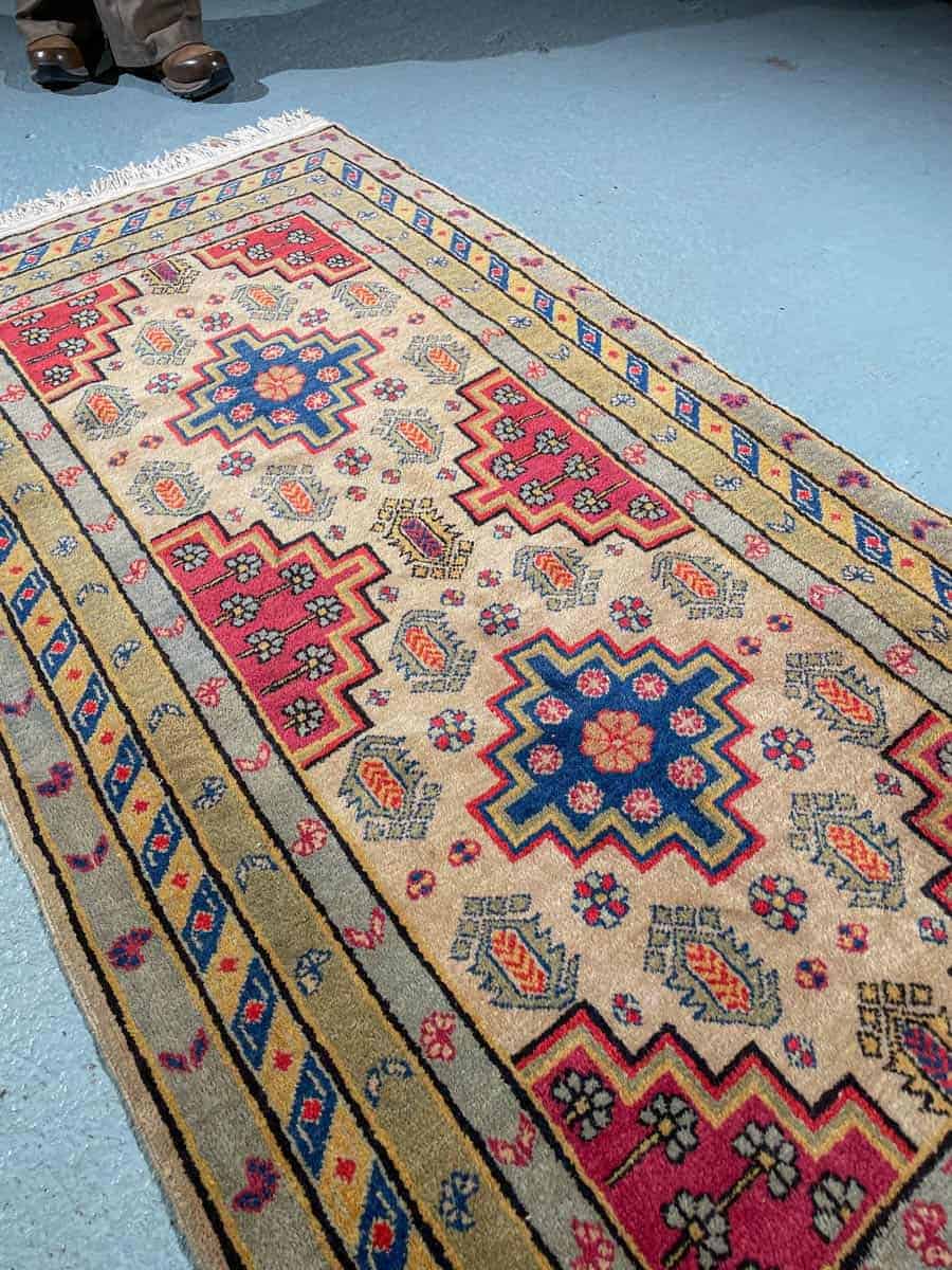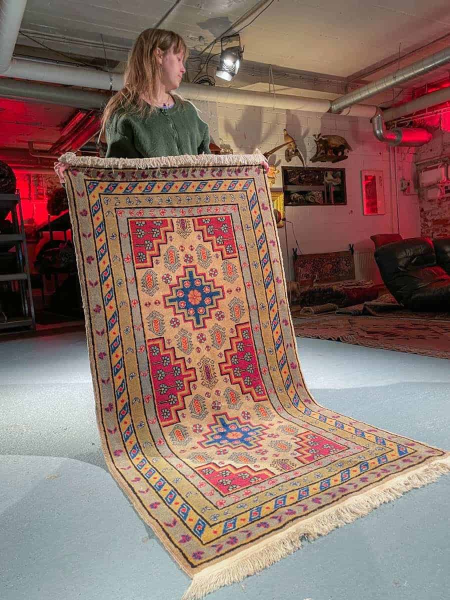Kodikas kazakkimatto soman vaalealla värimaailmalla ja geometrisella kuvioinnilla. Käsinsolmittu villasta.