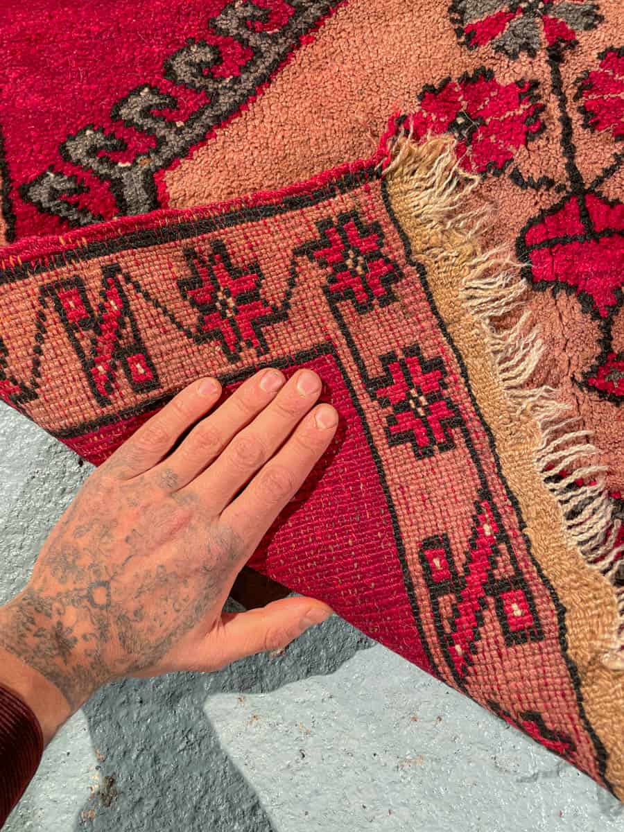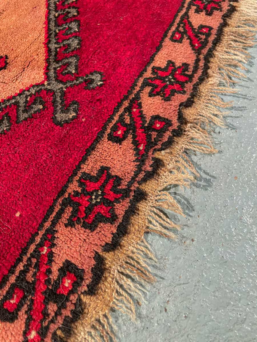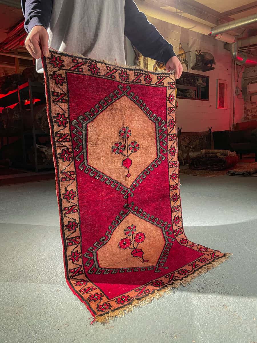 Ihastuttava pieni punainen marokkolainen Berberi-matto perinteisen minimalistisella kuvoinnilla. Käsinsolmittu villasta.