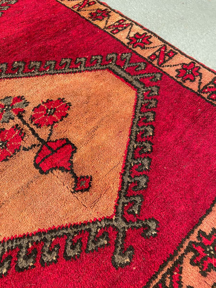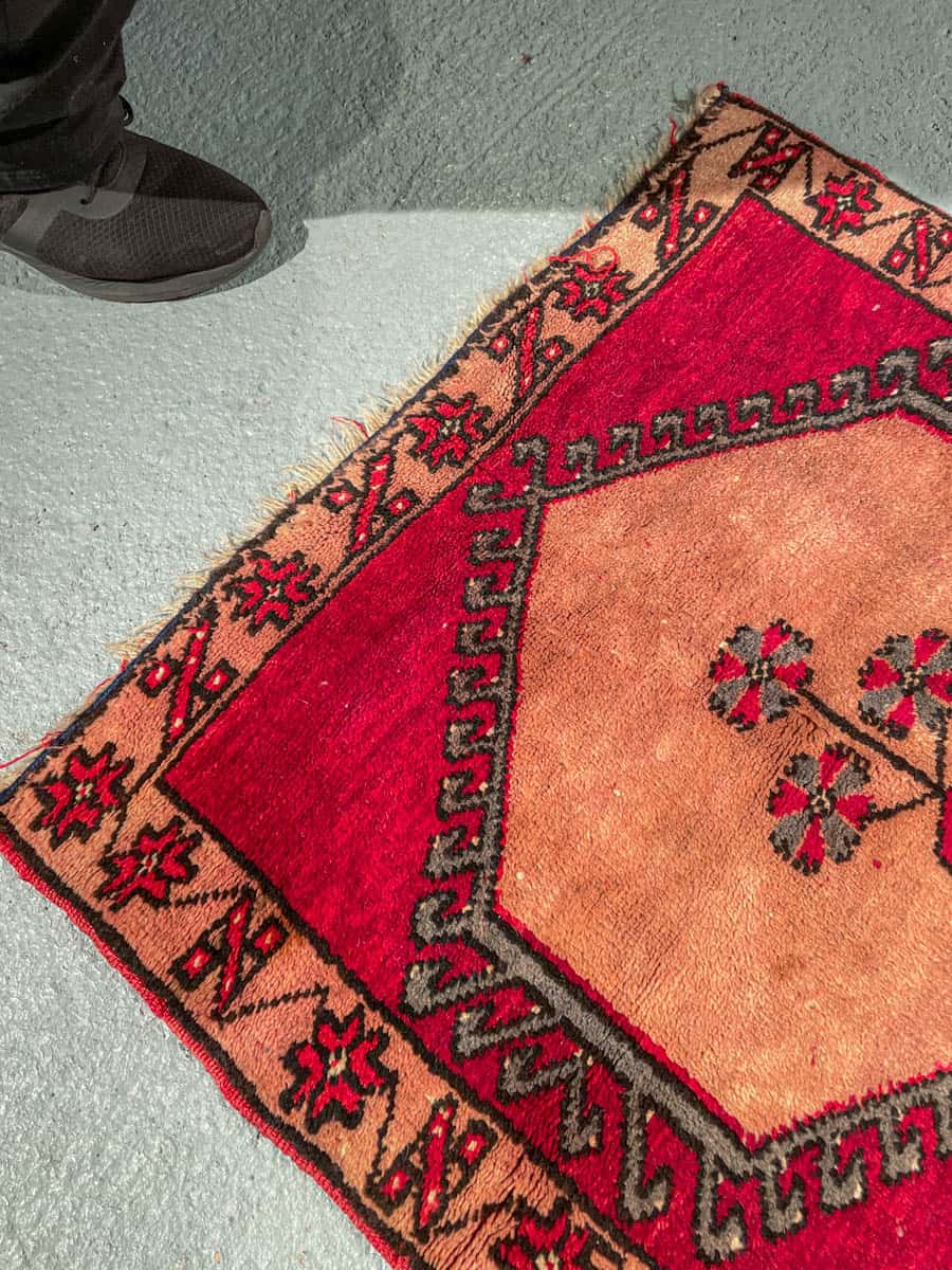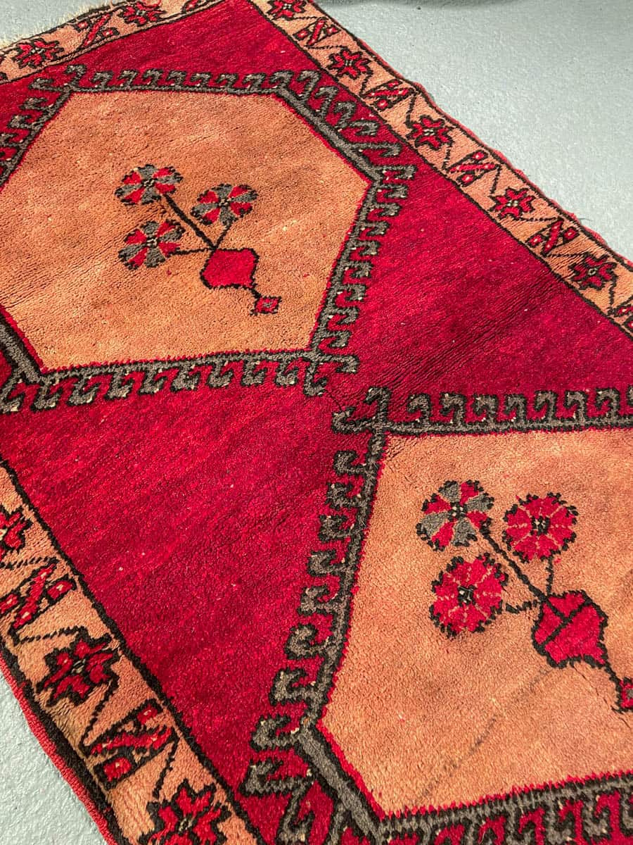 Ihastuttava pieni punainen marokkolainen Berberi-matto perinteisen minimalistisella kuvoinnilla. Käsinsolmittu villasta.