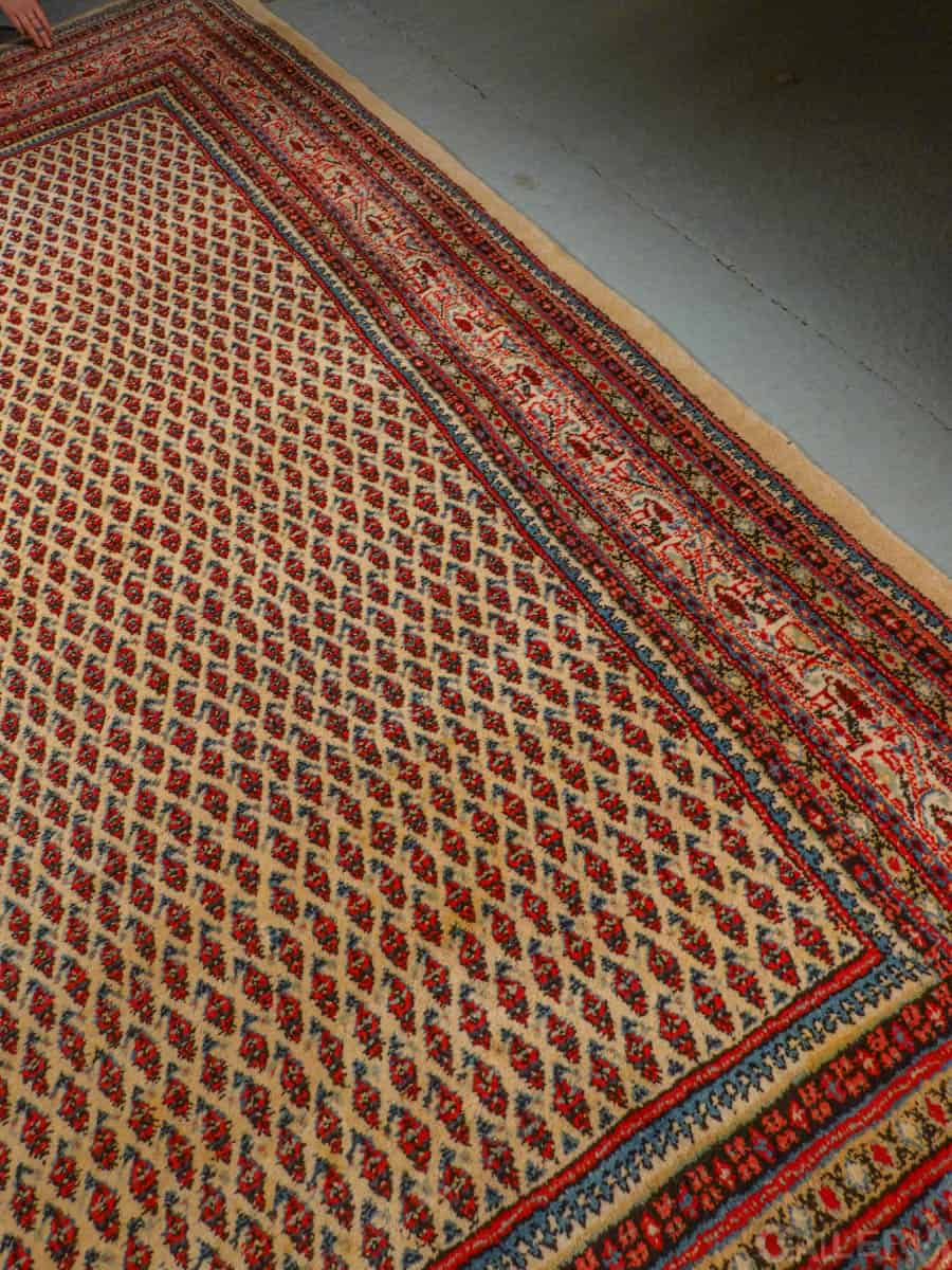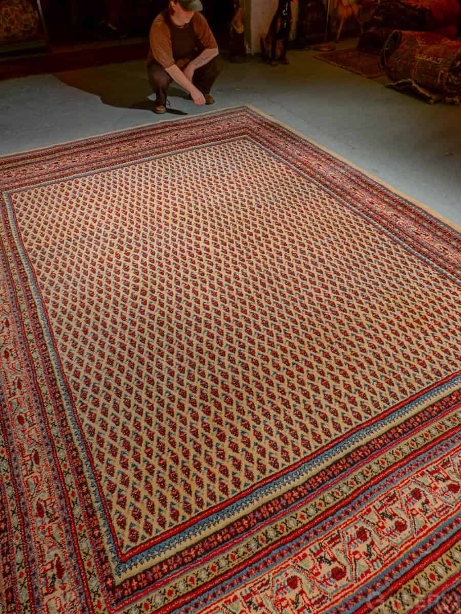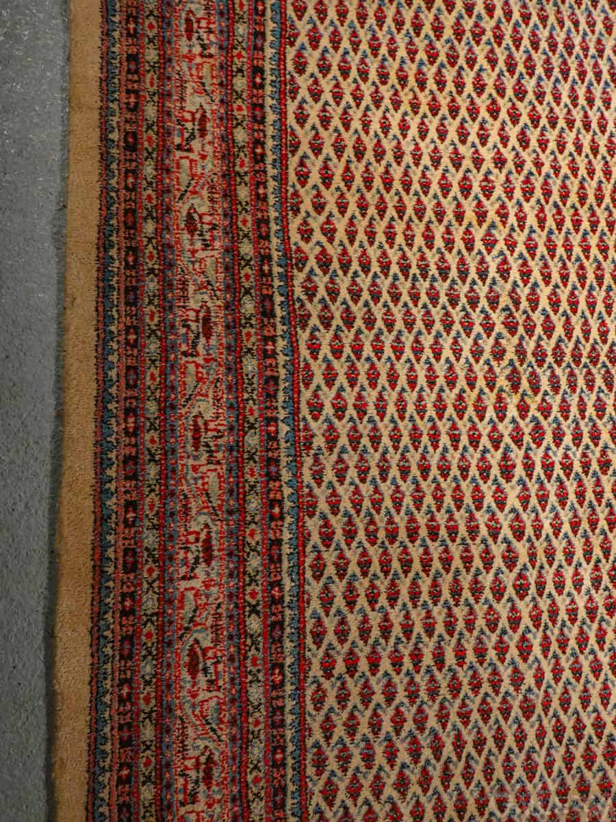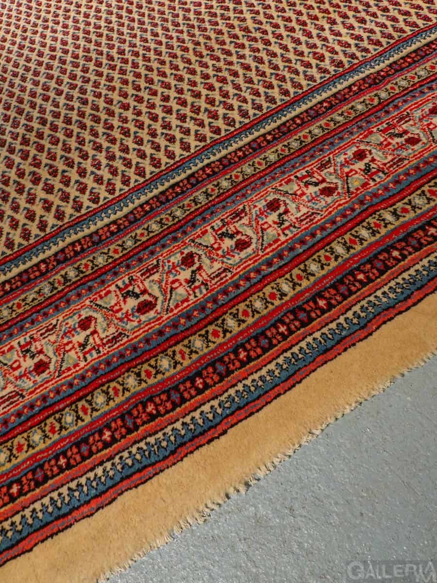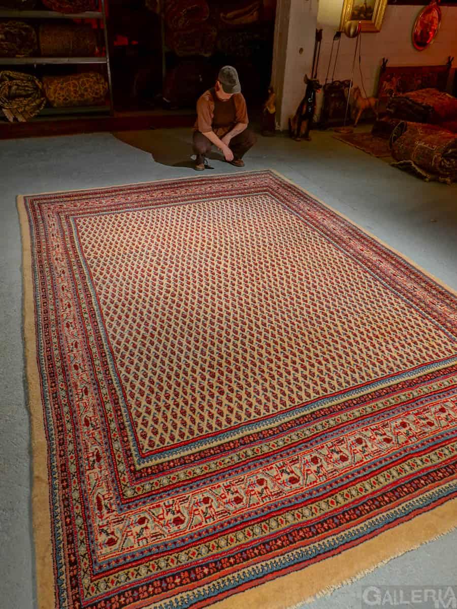 Perinteinen käsinsolmittu persialainen Sarouk Mir -villamatto vaalealla pohjalla ja runsaan yksityiskohaisella reunamarginaalilla.